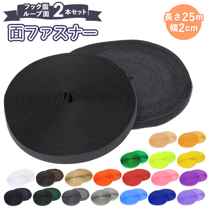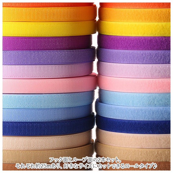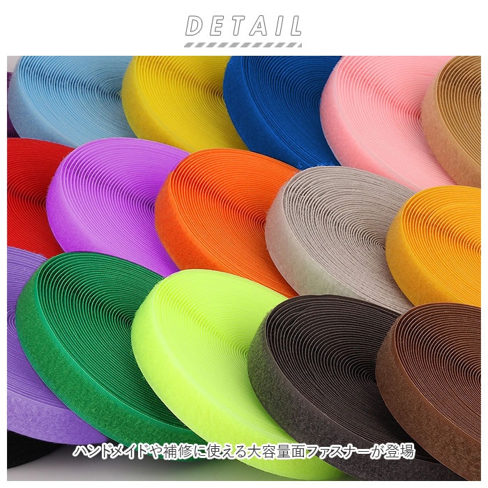 | 商品説明 | ハンドメイドや補修に使える大容量面ファスナーが登場。フック面とループ面の2本セット。それぞれ約25mあり、好きなサイズにカットできるロールタイプ♪フック面とループ面がしっかり留まる強力な接着力がポイント!繰り返し使っても接着強度を保ってくれる。手縫いでもミシンでも使用でき、手芸素材や既存製品の補修はもちろん雑貨やインテリアの補修に使うのもおススメ。ブラックやホワイトといったベーシックなカラーからオレンジやブルーといったカラフルなカラーもありバリエーション豊富。 |