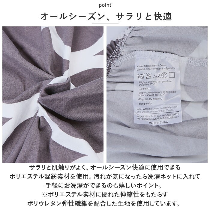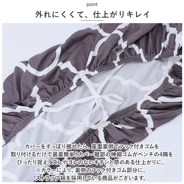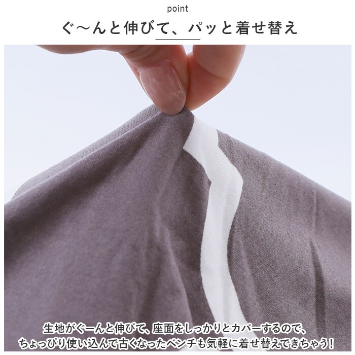 | 商品説明 | 色彩豊かなテキスタイルで、ベンチを自分色にリニューアル。取り付け簡単「ベンチシートカバー」が新登場。【今お使いのベンチにフィット!】タテ・ヨコに程よく伸縮するストレッチ素材が、ダイニングベンチやロングスツールなど、背もたれのないタイプの長椅子にぴったりフィット!【ぐ~んと伸びて、パッと着せ替え】生地がぐーんと伸びて、座面をしっかりとカバーするので、ちょっぴり使い込んで古くなったベンチも気軽に着せ替えできちゃう!【外れにくくて、仕上がりキレイ】カバーをすっぽり被せたら、座面裏側でフック付きゴムを取り付けるだけで装着簡単!カバー裾部の伸縮ゴムがベンチの4隅をぴったり捉え、ズレやヨレのないキチンと感のある仕上がりに。(※カラーにより、裏側のフック付きゴム部分に、ストラップ紐を採用している商品がございます。)【オールシーズン、サラリと快適】サラリと肌触りがよく、オールシーズン快適に使用できるポリエステル混紡素材を使用。汚れが気になったら洗濯ネットに入れて手軽にお洗濯ができるのも嬉しいポイント。(※ポリエステル素材に優れた伸縮性をもたらすポリウレタン弾性繊維を配合した生地を使用しています。)【お子さまやペットのいるご家庭に】お子さまの食べこぼし汚れや、ネコちゃんの爪とぎ跡でくたびれてしまったベンチも簡単イメージチェンジ!【オフィスやショップのベンチにも】家庭用のダイニングベンチだけでなく、オフィスやショップ、クリニックの待合室用など、ビジネスシーンでも大活躍。【選べるカラーで、気持ち華やぐ】お部屋の雰囲気がパッと華やぐ、個性豊かなテキスタイルデザイン。季節ごとにお気に入りの柄で模様替えをすれば、お部屋も気持ちもリフレッシュ! |