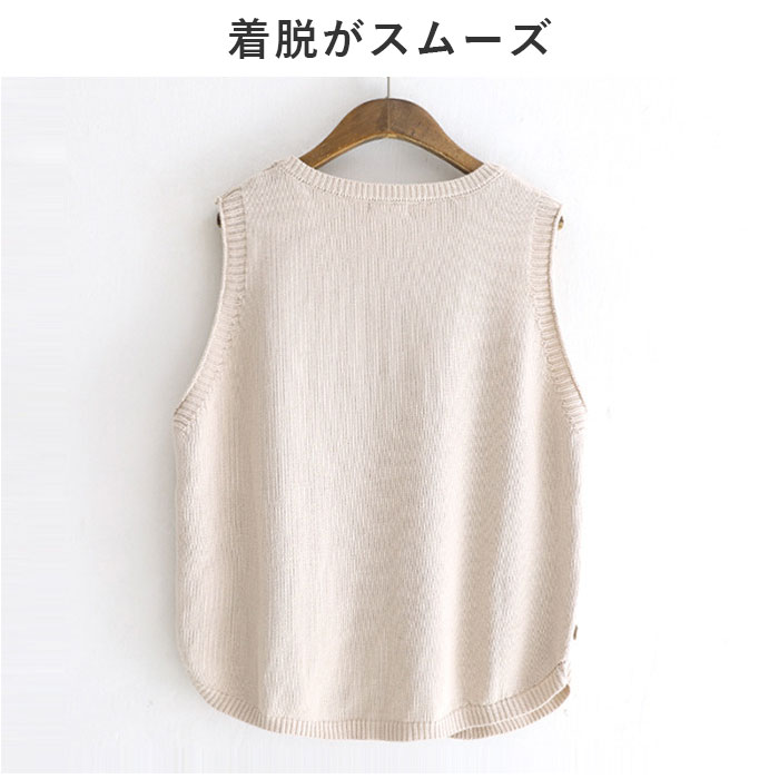 | 商品説明 | いつものコーデにプラスワン。着回し力ばっちりなレディース用ニットベストが新登場。【おしゃれにレイヤード】お手持ちのシャツやロンTなどと合わせるだけ。シンプルなコーデがワンランクアップ!ボトムスを選ばず使える丈感もポイント。【柔らかな肌触り】チクチクせず、お肌に優しいコットン素材。程よい生地感で着ぶくれすることなく、スマートな印象に。ロングシーズン活躍☆【クルーネックタイプ】詰まりすぎず、首まわりに心地よくフィットするネックデザイン。顔まわりも優しく、すっきりとした印象に。【着脱がスムーズ】頭からすっぽり被るだけでOK。着替えもラクラク!【シンプルなデザイン】落ち着きのあるカラーに、サイドのボタンデザインがアクセント。お気に入りのカラーをチョイスして♪(※ボタンは飾りです。) |