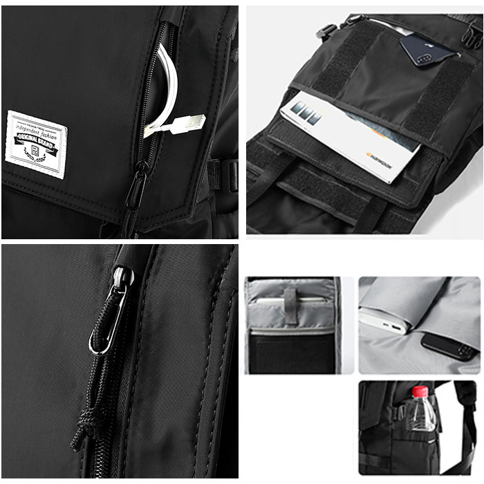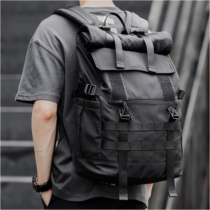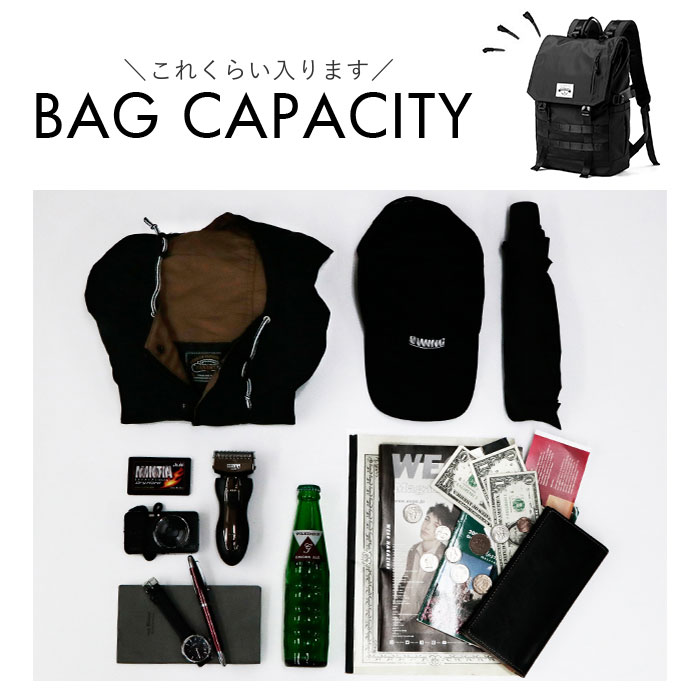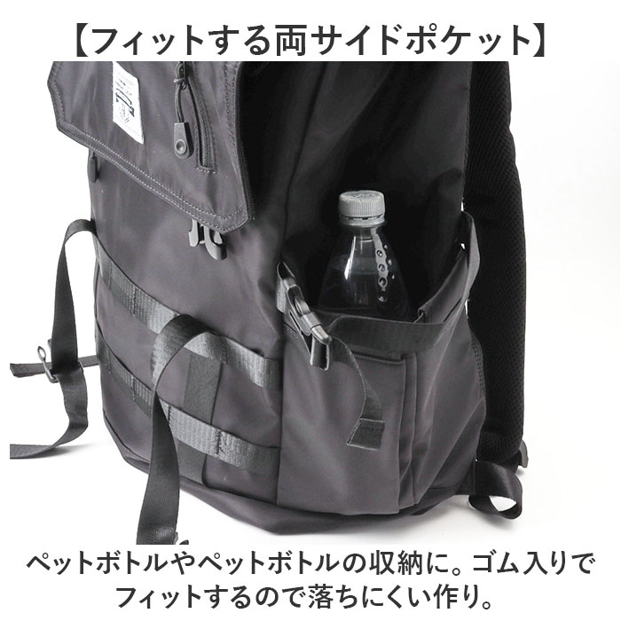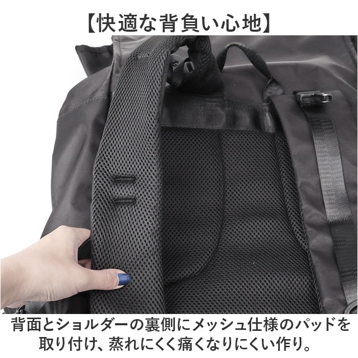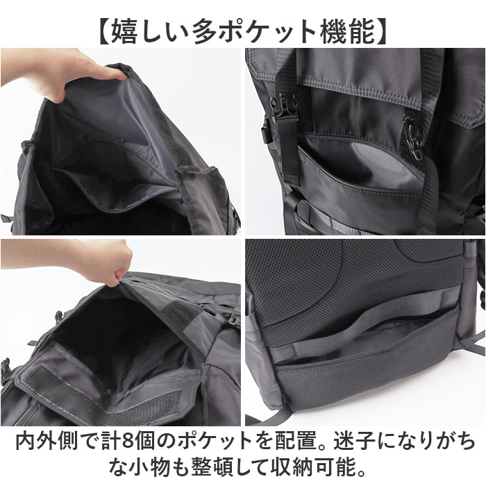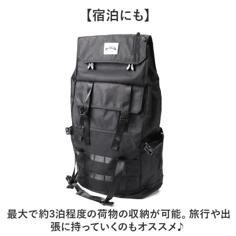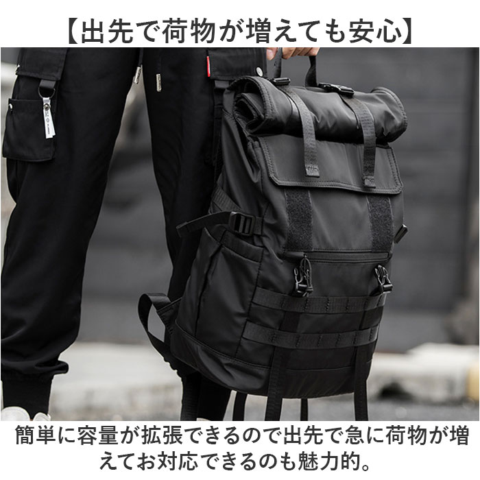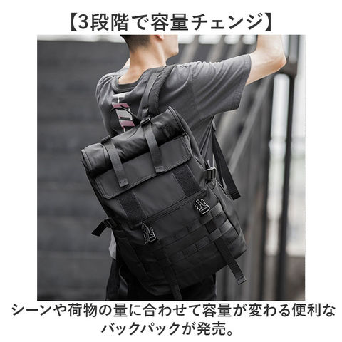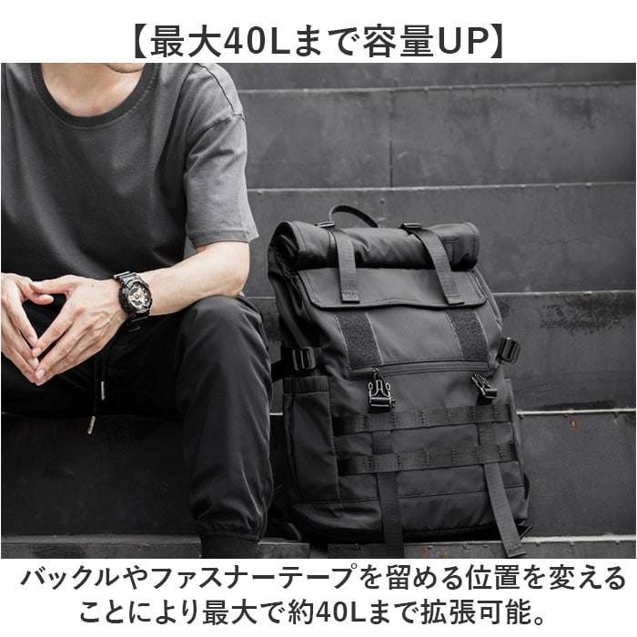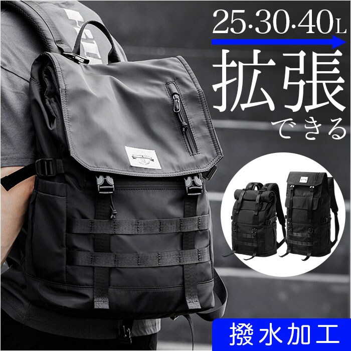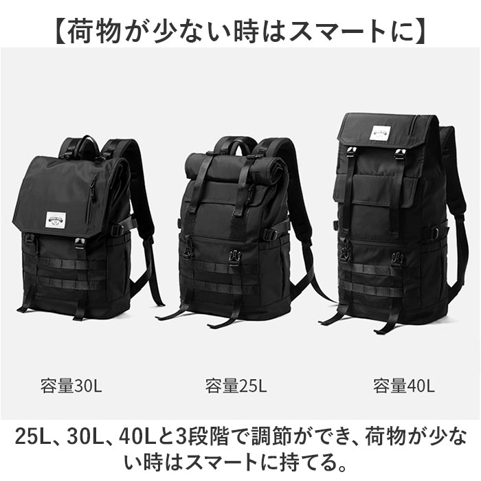 商品説明【3段階で容量チェンジ】シーンや荷物の量に合わせて容量が変わる便利なバックパックが発売。【最大40Lまで容量UP】バックルやファスナーテープを留める位置を変えることにより最大で約40Lまで拡張可能。【荷物が少ない時はスマートに】25L、30L、40Lと3段階で調節ができ、荷物が少ない時はスマートに持てる。【出先で荷物が増えても安心】簡単に容量が拡張できるので出先で急に荷物が増えてお対応できるのも魅力的。【様々なシーンで活躍】普段使いはもちろん、アウトドアなどのレジャーでも活躍☆【大型のノートパソコンも入る】ウレタン内蔵のオープンポケットを設け、最大で17.3インチまでの電子機器対応。【嬉しい多ポケット機能】内外側で計8個のポケットを配置。迷子になりがちな小物も整頓して収納可能。【フィットする両サイドポケット】ペットボトルやペットボトルの収納に。ゴム入りでフィットするので落ちにくい作り。【宿泊にも】最大で約3泊程度の荷物の収納が可能。旅行や出張に持っていくのもオススメ♪【快適な背負い心地】背面とショルダーの裏側にメッシュ仕様のパッドを取り付け、蒸れにくく痛くなりにくい作り。【チェストベルト付き】ショルダーがズレ落ちず、体にフィットするチェストベルト搭載。【キャリーオン機能】背面にはキャリーケースのハンドルを通せるベルト付きで持ち運びに便利。【濡れても安心な作り】表面には撥水加工、ファスナーは止水構造になっており、小雨が降っても安心。【Dカン付き】カラビナ付きのポーチやストラップ類の取り付けに便利なDカン付き。【シンプルで使いやすい】無地のブラックカラーとロゴパッチでシンプルな作り。年代性別問わず使いやすいのも◎【ポケット仕様】メインルーム・・・ウレタン内蔵ポケット×1、ファスナーポケット×1フラップ・・・ファスナーポケット×1フロント・・・フラップポケット×1、ファスナーポケット×1背面・・・ファスナーポケット×1両サイド・・・オープンポケット×1ずつ