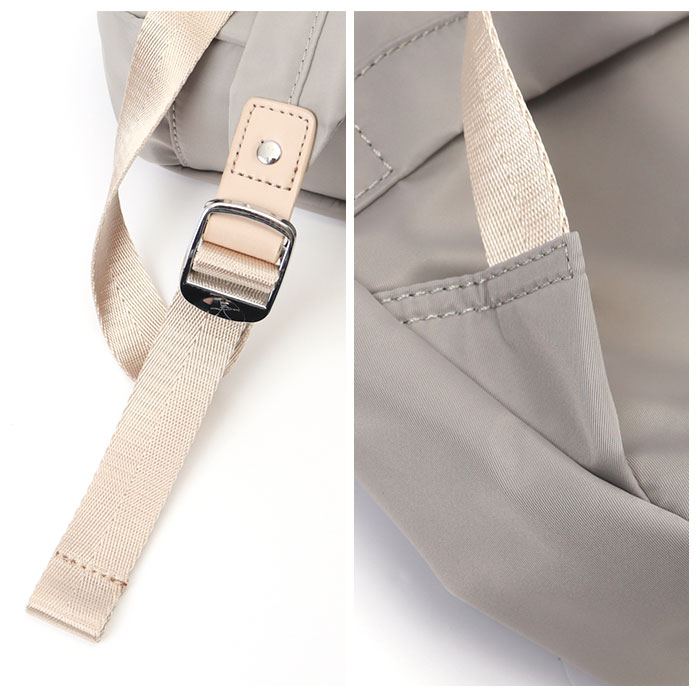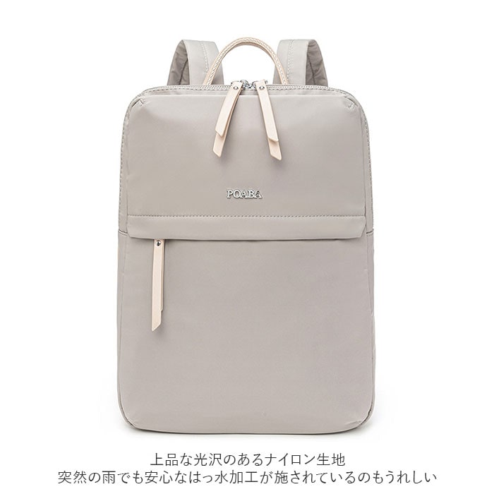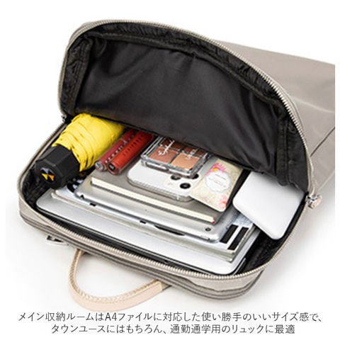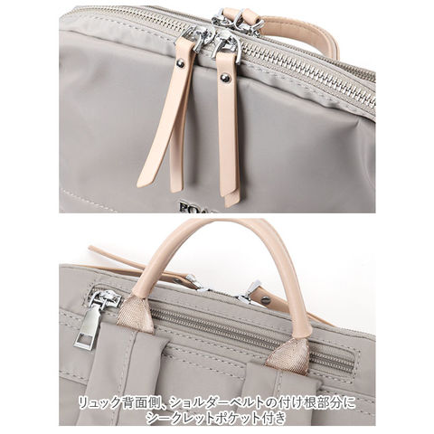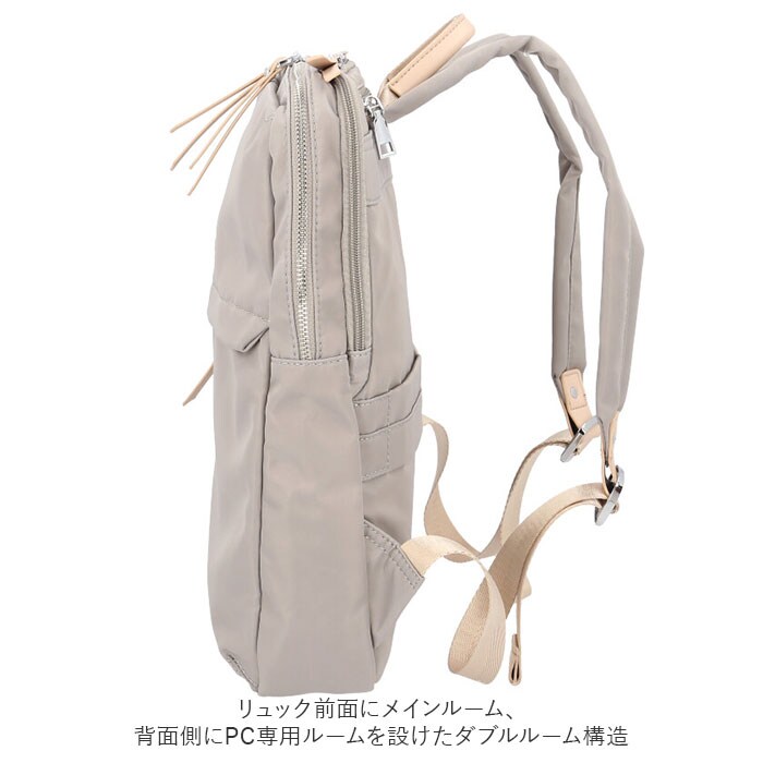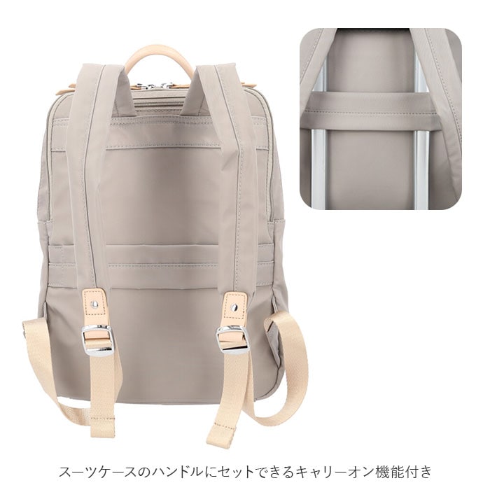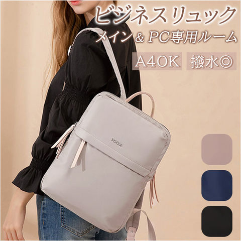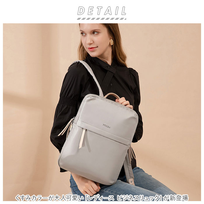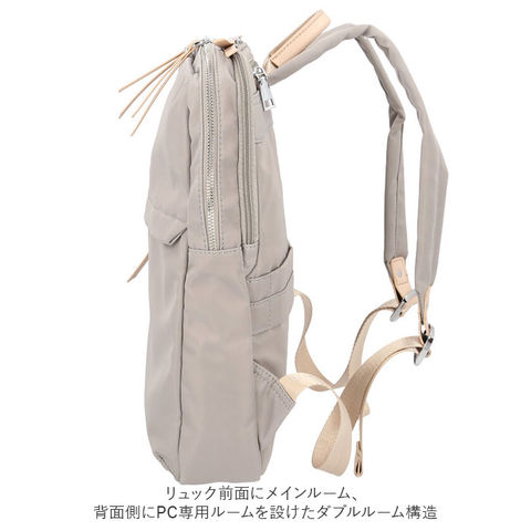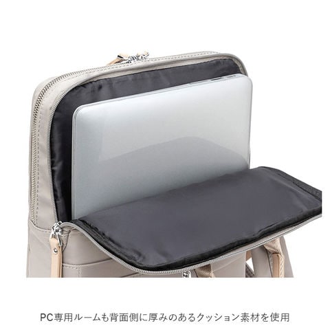 | 商品説明 | PCの持ち歩きもエレガントに。くすみカラーが大人可愛い「レディース ビジネスリュック」が新登場。上品な光沢のあるナイロン生地にシルバーのファスナー金具を合わせたスリムなルックスで、野暮ったくなりがちなPCバッグをもっとお洒落に演出♪リュック前面にメインルーム、背面側にPC専用ルームを設けたダブルルーム構造。どちらもダブルファスナーが側面まで大きく開いて、小物取り出しがスムーズ。メイン収納ルームはA4ファイルに対応した使い勝手のいいサイズ感で、タウンユースにはもちろん、通勤通学用のリュックに最適。メインルーム内側に、ファスナーポケット×1、オープンポケット×1、クッション生地で仕上げたタブレットポケットを搭載し、小物類の仕分けが楽ちん。PC専用ルームも背面側に厚みのあるクッション素材を使用しているので、繊細な機器類が安心して収納でき、外出先や勤務先でのPC作業もスマートに。リュックのフロントには、スマホやパスケースなど使用頻度の高いアイテムがサッと取り出せるファスナーポケットがひとつ。リュック背面側、ショルダーベルトの付け根部分に、パスポートやコインケースなど貴重品の収納に便利なシークレットポケット付き。スーツケースのハンドルにセットできるキャリーオン機能付きなので、旅行や出張時のサブバッグにもオススメ。くすみ感のある生地に、フェイクレザーのファスナー引き手がアクセントになった大人カラー。突然の雨でも安心なはっ水加工が施されているのもうれしいポイント。 |