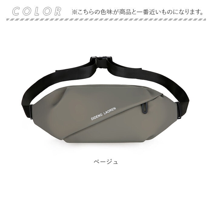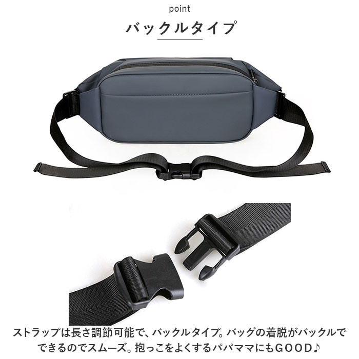 | 商品説明 | スタイリッシュな見た目が魅力。ミニマム&身軽にお出かけ!「ボディバッグ」が登場。【スタイリッシュなデザイン】無駄のないクールでスタイリッシュなデザイン。スリムでコンパクトな作りなので、ミニマムにお出かけしたい方にオススメ。マットな印象で、高見え効果も◎【撥水加工】撥水加工を施しているので、急な雨でも荷物が濡れずに安心。汚れに強いのも嬉しいポイント。【ちょうど良いコンパクトさ】ペットボトルとコインケースなど、必要な物はしっかりと入るちょうど良いサイズ感。タウンユースからレジャーまで幅広く活躍。【バックルタイプ】ストラップは長さ調節可能で、バックルタイプ。バッグの着脱がバックルでできるのでスムーズ。抱っこをよくするパパママにもGOOD♪【ポケットあり】小物の収納に便利なポケットあり!小さいけれどちゃんと収納&整理整頓。【ベーシックカラー】ベーシックなカラー展開なので、カップルや夫婦でお揃いにしたり、共有にしたりするのもGOOD♪【ポケット仕様】前面:ファスナーポケット×1背面:ファスナー付ポケット×1 |