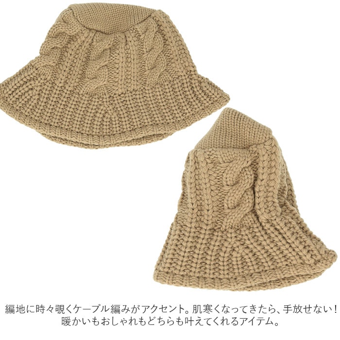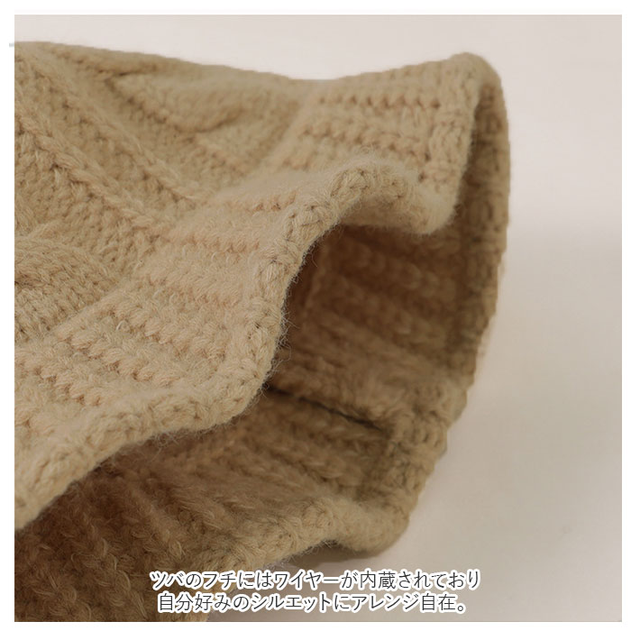 | 商品説明 | ふんわり被って、コーデに季節感をプラス♪シンプルで可愛い「レディースニット帽子」太めの糸をざっくりと厚手に編み込み、ボリューム感たっぷりの仕上がり。冬物のコートやマフラーと合わせてふわっと温かみのあるコーデが完成。程よく伸縮性のあるゆったりとした編地が優しくフィットし、耳まですっぽりと覆ってほっこりあたたか。お顔の輪郭を包み込むようなツバ付きタイプなので、小顔効果にも期待◎もちろん、秋冬時期の気になる日射し除け対策としても効果的。ツバのフチにはワイヤーが内蔵されており、自分好みのシルエットにアレンジ自在。編地に時々覗くケーブル編みがアクセント。肌寒くなってきたら、手放せない!暖かいもおしゃれもどちらも叶えてくれるアイテム。 |