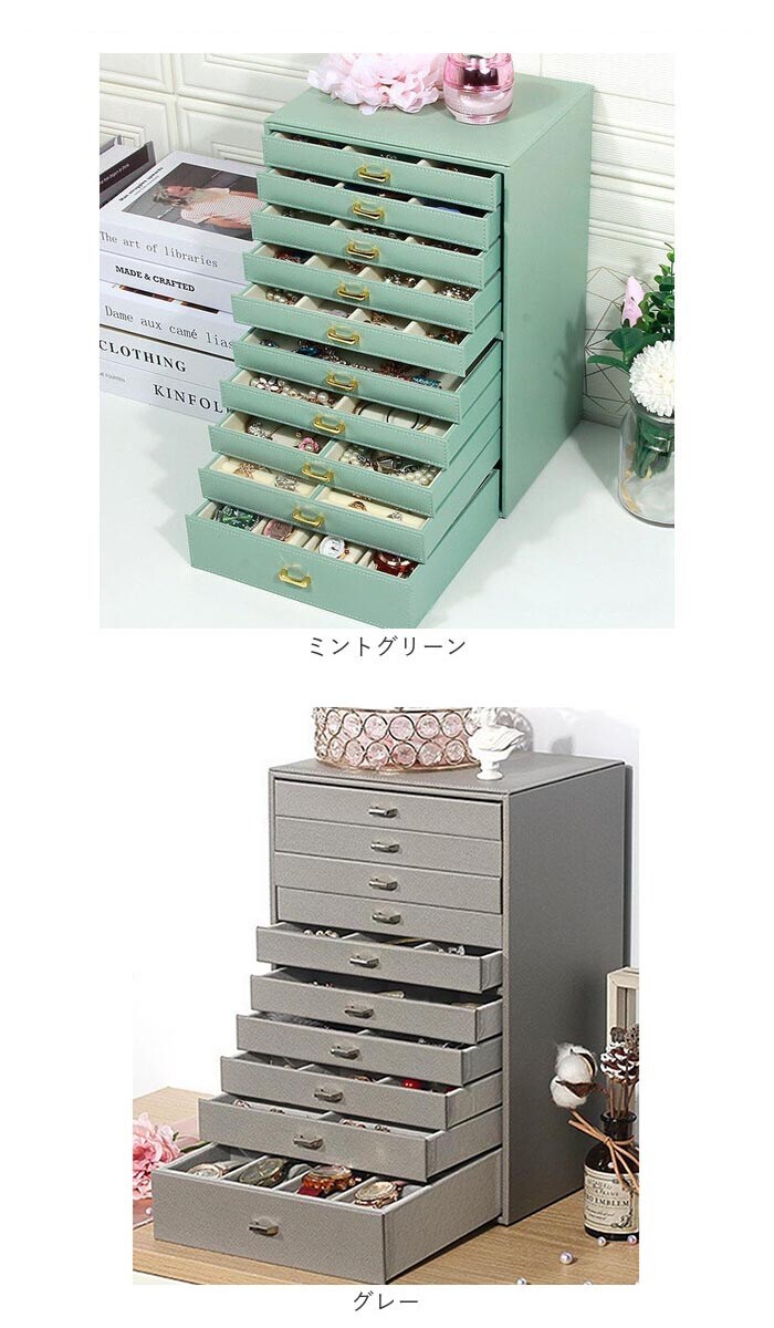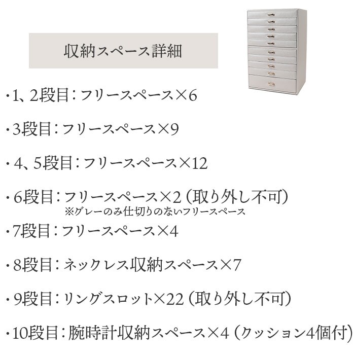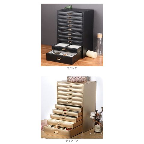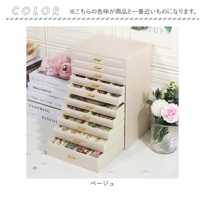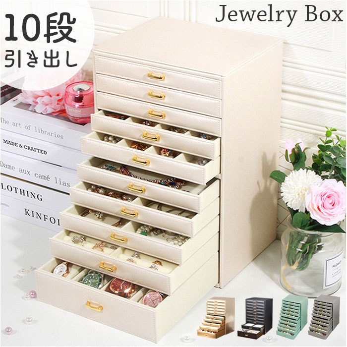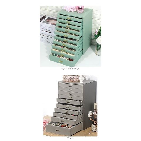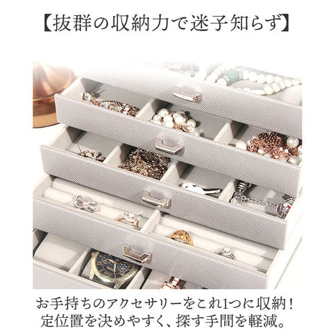 | 商品説明 | 【大切なアクセサリーをひとまとめ】たっぷり入ってすっきり整頓♪10段引き出しタイプの「ジュエリーボックス」が新登場。【抜群の収納力で迷子知らず】お手持ちのアクセサリーをこれ1つに収納!定位置を決めやすく、探す手間を軽減。【サッと取り出せて身支度がスムーズ】引き出しやすく、忙しい朝も支度に手間取らない♪光沢のある取っ手金具がアクセント。【間仕切り付きで中身が一目瞭然】・1~8段目それぞれに間仕切り付き。イヤリングやネックレス、ブローチなどをIN。(※)仕切りが取り外しできない段もあります。【大量の指輪や腕時計も一緒に】・9段目にはリングスロット、10段目にはクッション付きの腕時計収納とフリースペース。【傷付きを防ぐ安心の内張り】ベロアのように柔らかな内張り。アクセサリーを傷や衝撃からガード◎【お気に入りを選べるカラー】空間に馴染みやすいカラーをラインナップ。飽きのこないシンプルデザイン♪【収納スペース】・1、2段目:フリースペース×6・3段目:フリースペース×9・4、5段目:フリースペース×12・6段目:フリースペース×2(取り外し不可)・7段目:フリースペース×4・8段目:ネックレス収納スペース×7・9段目:リングスロット×22(取り外し不可)・10段目:腕時計収納スペース×4(クッション4個付き)、フリースペース×1(仕切りは取り外し不可) |