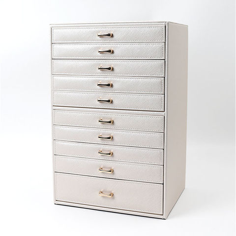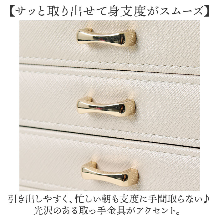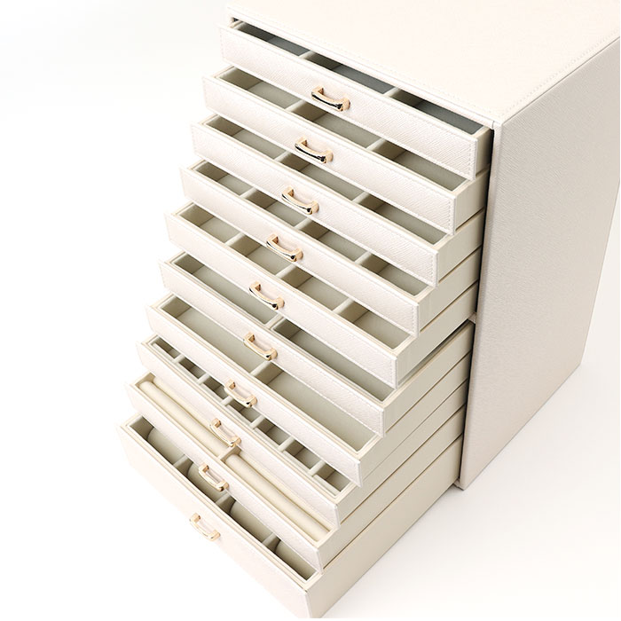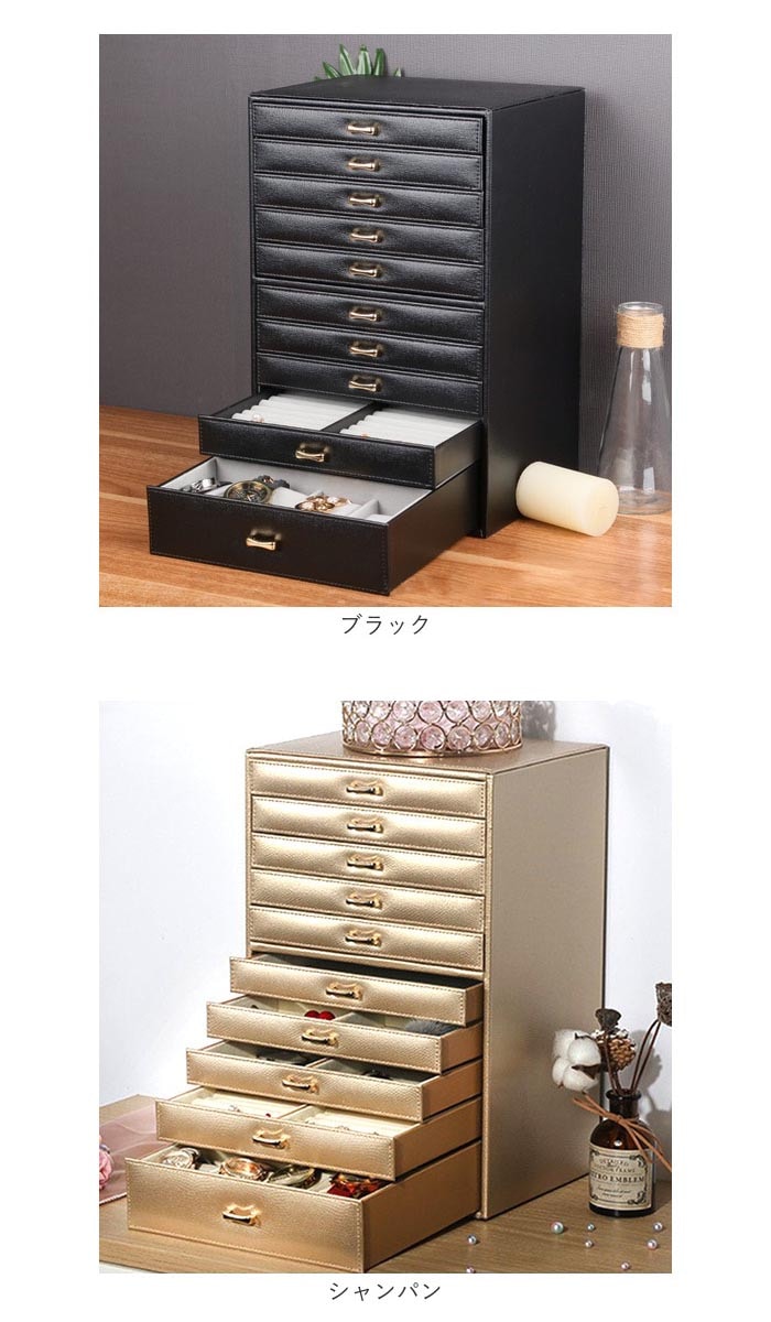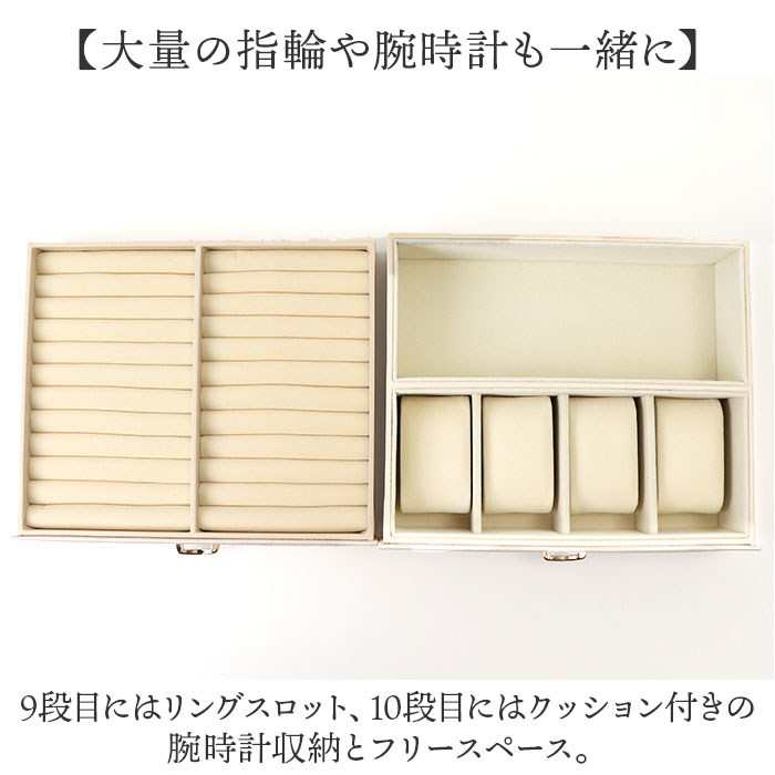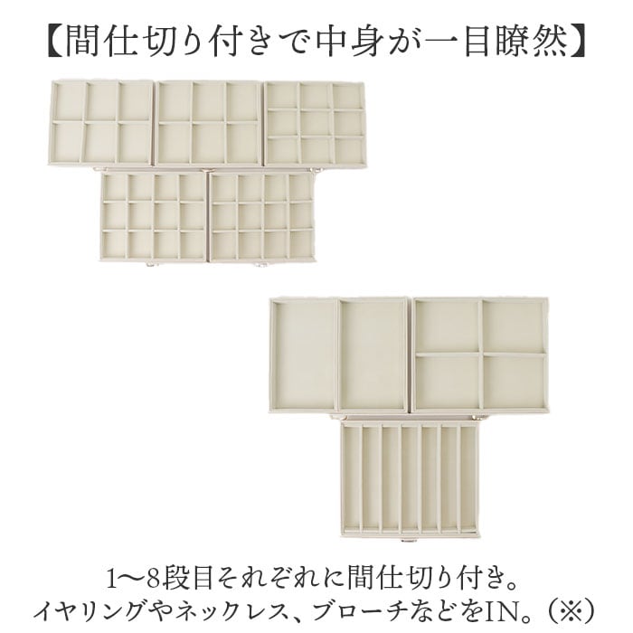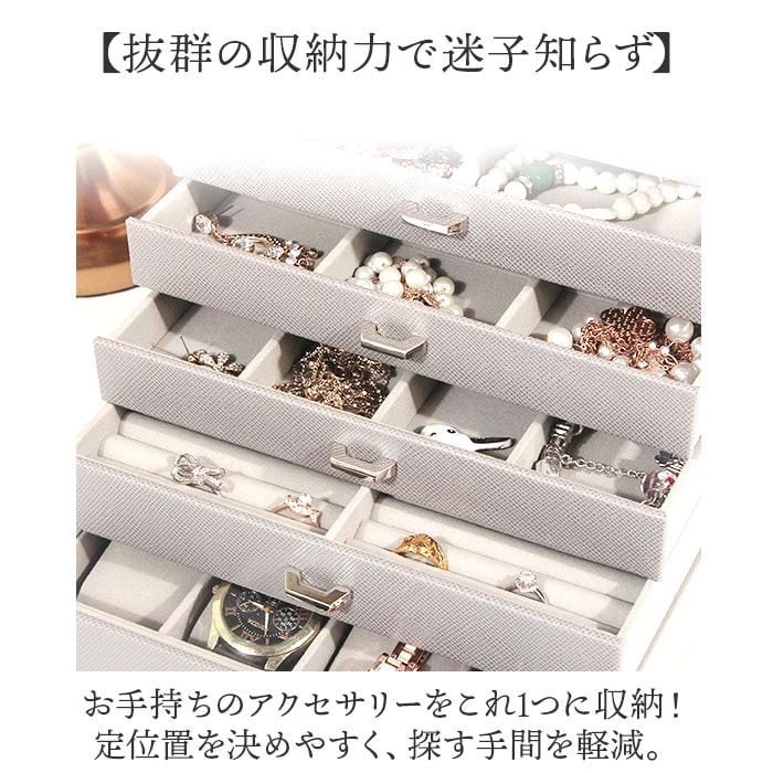 | 商品説明 | 【大切なアクセサリーをひとまとめ】たっぷり入ってすっきり整頓♪10段引き出しタイプの「ジュエリーボックス」が新登場。【抜群の収納力で迷子知らず】お手持ちのアクセサリーをこれ1つに収納!定位置を決めやすく、探す手間を軽減。【サッと取り出せて身支度がスムーズ】引き出しやすく、忙しい朝も支度に手間取らない♪光沢のある取っ手金具がアクセント。【間仕切り付きで中身が一目瞭然】・1~8段目それぞれに間仕切り付き。イヤリングやネックレス、ブローチなどをIN。(※)仕切りが取り外しできない段もあります。【大量の指輪や腕時計も一緒に】・9段目にはリングスロット、10段目にはクッション付きの腕時計収納とフリースペース。【傷付きを防ぐ安心の内張り】ベロアのように柔らかな内張り。アクセサリーを傷や衝撃からガード◎【お気に入りを選べるカラー】空間に馴染みやすいカラーをラインナップ。飽きのこないシンプルデザイン♪【収納スペース】・1、2段目:フリースペース×6・3段目:フリースペース×9・4、5段目:フリースペース×12・6段目:フリースペース×2(取り外し不可)・7段目:フリースペース×4・8段目:ネックレス収納スペース×7・9段目:リングスロット×22(取り外し不可)・10段目:腕時計収納スペース×4(クッション4個付き)、フリースペース×1(仕切りは取り外し不可) |