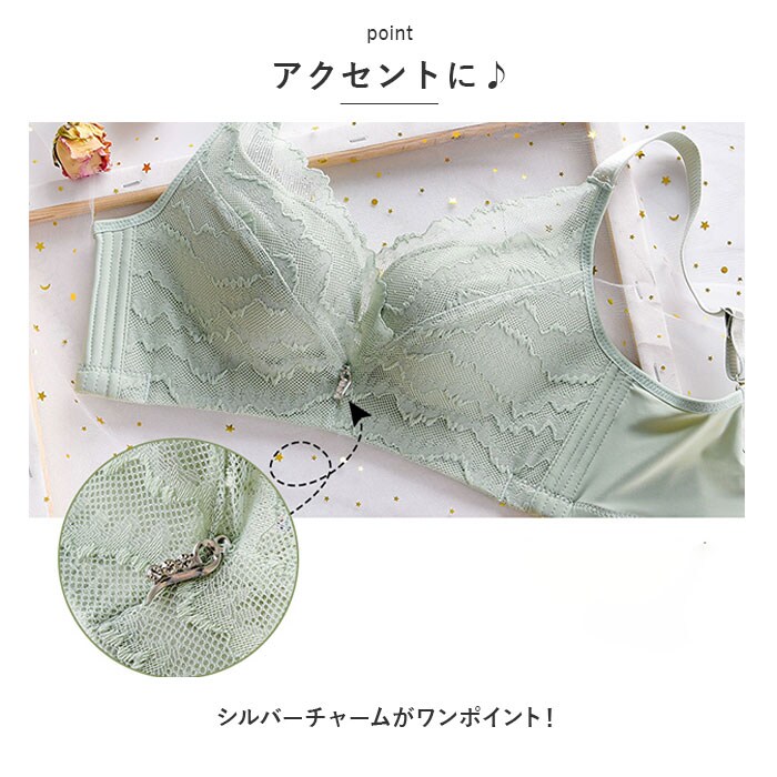 | 商品説明 | 綺麗な谷間をメイクする♪ブラジャーとお揃いのショーツセットが登場。【上品なデザイン】レース素材で華やかさをプラス。《ブラジャー》【ストレスフリー◎】アンダーバストは締めつけ感のないノンワイヤー設計!窮屈感が苦手な方にぴったり。【4段階サイズ調節OK】背面ホックで着脱。自分サイズにフィット!【立体構造のパッド】バストを下から押し上げ、ふっくらキレイ魅せ♪パッド下側に凹凸加工を施しているのでズレにくい!【脇高設計】バストの揺れを抑え、横流れを防止。【アクセントに♪】シルバーチャームがワンポイント!《ショーツ》【着心地軽やか】伸縮性に富んだ生地がお尻にフィット。【デリケートなお肌にも優しい】クロッチ部分は肌当たりのソフトな生地を使用した2重構造。 |