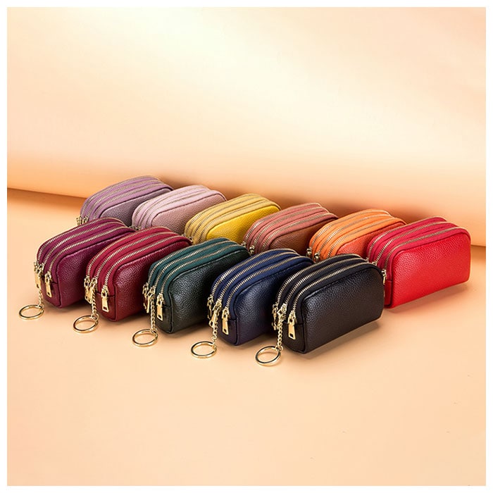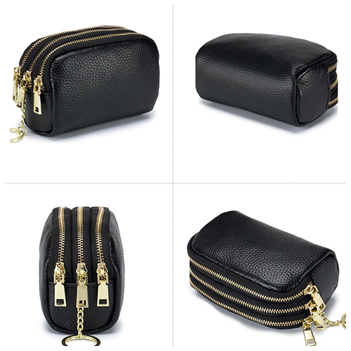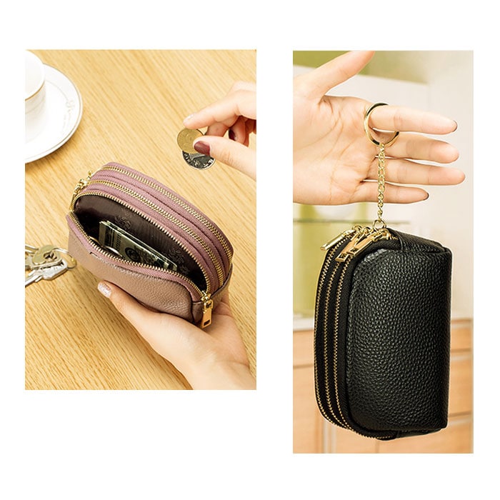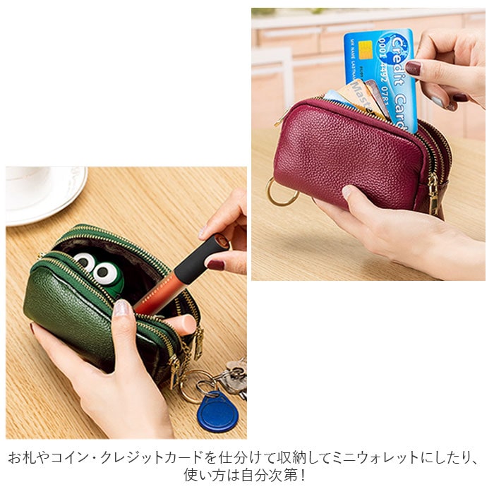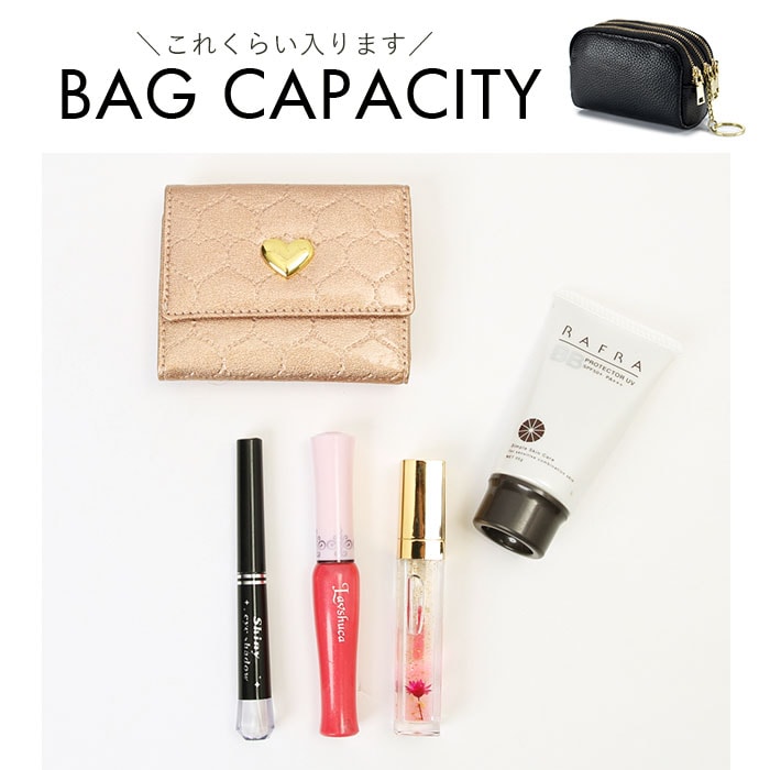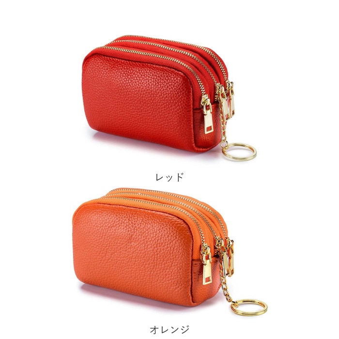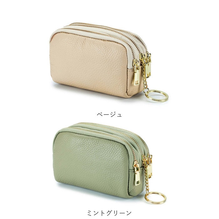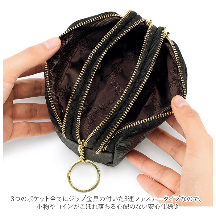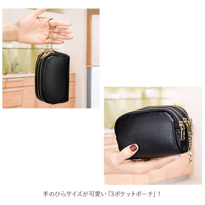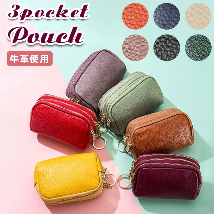 | 商品説明 | 化粧ポーチやちょっとした小物入れに♪手のひらサイズが可愛い「3ポケットポーチ」!中央に程よくマチのあるメインポケット、前後にスリムなポケットを1つずつ設けた3ポケット仕様。3つのポケット全てにジップ金具の付いた3連ファスナータイプなので、小物やコインがこぼれ落ちる心配のない安心仕様♪中央のポケットにはキーリングが付いて、リール付きパスケースやキーケースをつないで使えるからとっても便利!リップやコンパクトのようなコスメをまとめて化粧ポーチに。お札やコイン・クレジットカードを仕分けて収納してミニウォレットにしたり、使い方は自分次第!シボ感の際立つ柔らかな牛革素材にゴールドのファスナーがキラリと光る☆大人可愛いルックスも魅力のひとつ。 |