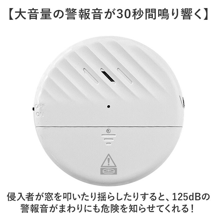 | 商品説明 | 【窓やドアに設置して防犯対策!】不審者撃退!大音量警告!手軽に取り付けできる「防犯アラーム 窓 ドア」が登場。【大音量の警報音が30秒間鳴り響く】侵入者が窓を叩いたり揺らしたりすると、125dBの警報音がまわりにも危険を知らせてくれる!【簡単操作で手間取らない】サイドのON/OFFボタンとアラームの感度を調節できるダイヤルを回すだけ!【工事不要◎テープで貼り付けるだけ】電池カバーを開けて、絶縁フィルムを取り、裏面のテープを剥がして窓に貼り付けるだけ!(※1)ドライバーは付属していません。【超薄型のコンパクトサイズ】窓の開閉に影響しない軽量&超薄型設計。場所を取らないので、いろいろな形状の窓に設置可能。(※2)窓の種類によっては開閉に影響する場合がございます。購入前にご確認ください。【おうちの窓以外にも!】玄関のドアや車など様々な場所に設置できるシンプルなデザイン。複数揃えるのもおすすめ◎ |