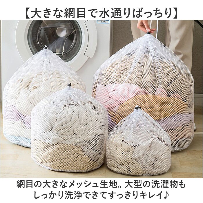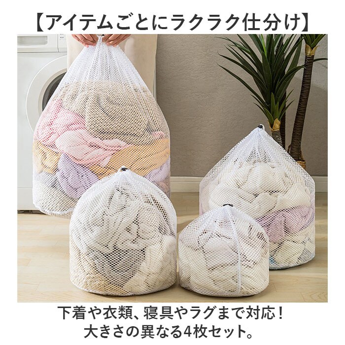 | 商品説明 | 【衣類のダメージを軽減して長持ち】衣類や下着を保護して、洗濯による形崩れなどを防ぐ「洗濯ネット」4枚セットが新登場。【アイテムごとにラクラク仕分け】下着や衣類、寝具やラグまで対応!大きさの異なる4枚セット。【大きな網目で水通りばっちり】網目の大きなメッシュ生地。大型の洗濯物もしっかり洗浄できてすっきりキレイ♪【シンプルで使い勝手ばっちり】程よい厚みで無駄を省いたデザイン。大切な衣類を守り、色移りをガード。【摩擦を防いで毛玉の発生を軽減】ネットに入れることで、衣類同士の絡まりやねじれを防止。毛玉の発生を最小限に。【開閉スムーズな巾着タイプ】ドローコードでキュッっと絞るだけ。開閉しやすく、中身が飛び出しにくい仕様。 |