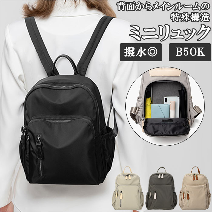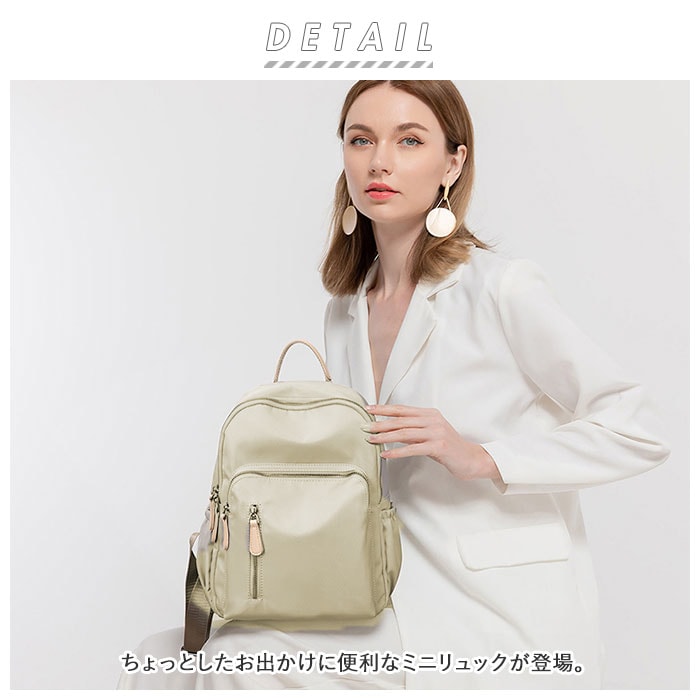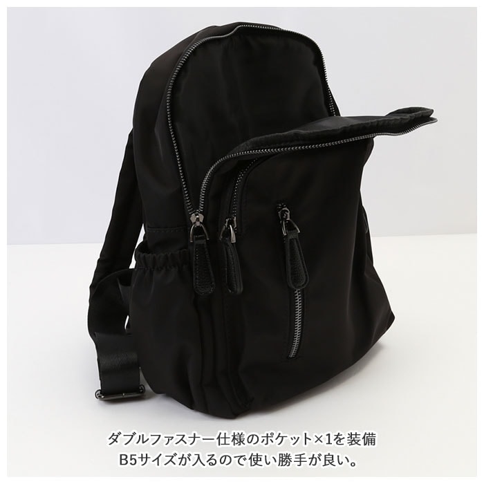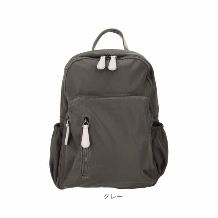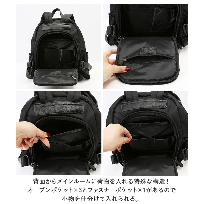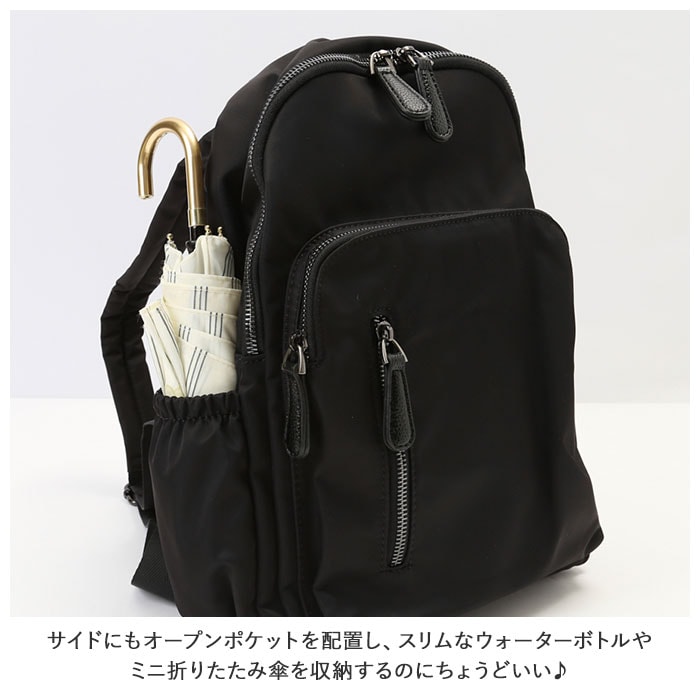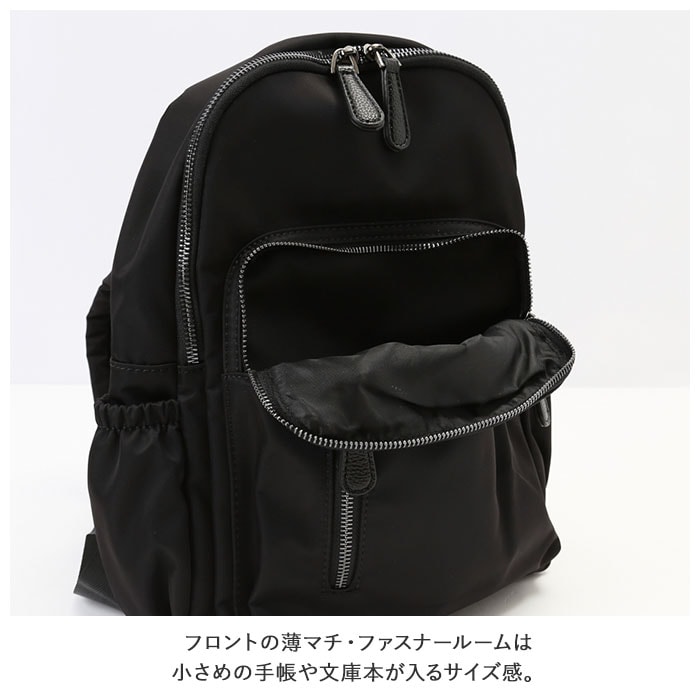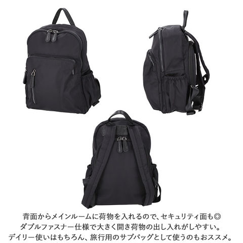 | 商品説明 | ちょっとしたお出かけに便利なミニリュックが登場。背面からメインルームに荷物を入れる特殊な構造!ダブルファスナー仕様で大きく開き荷物の出し入れがしやすい。オープンポケット×3とファスナーポケット×1があるので、小物を仕分けて入れられる。さらにダブルファスナー仕様のポケット×1を装備、B5サイズが入るので使い勝手が良い。フロントの薄マチ・ファスナールームは、小さめの手帳や文庫本が入るサイズ感。さらにパスケースやスマホなどサッと取り出したい小物を入れるのに便利なファスナーポケット×1付き。サイドにもオープンポケットを配置し、スリムなウォーターボトルやミニ折りたたみ傘を収納するのにちょうどいい♪生地の表面に撥水加工を施しており水滴や汚れが付いてもサッと拭き取れる。背面から荷物を入れるためセキュリティ面も◎デイリー使いはもちろん、旅行用のサブバッグとして使うのもおススメ。 |
