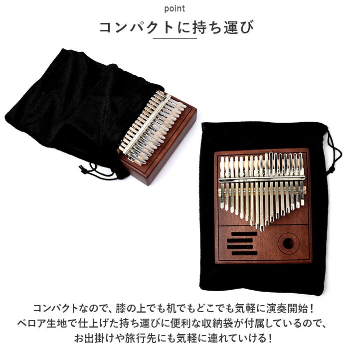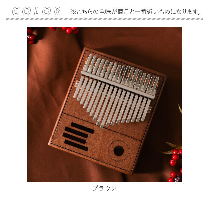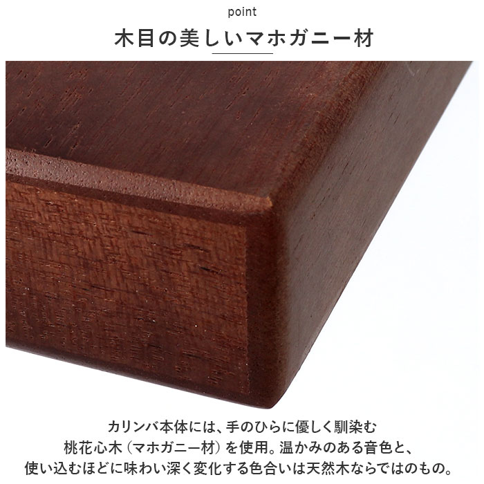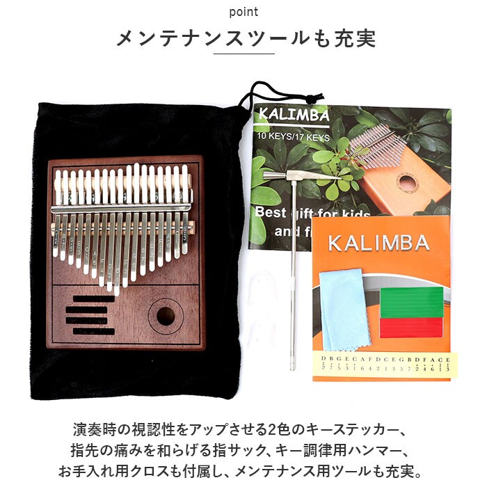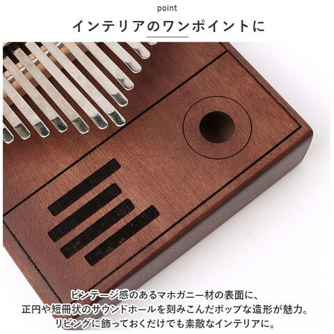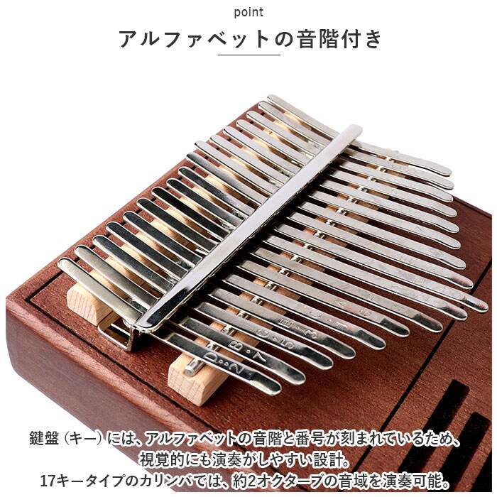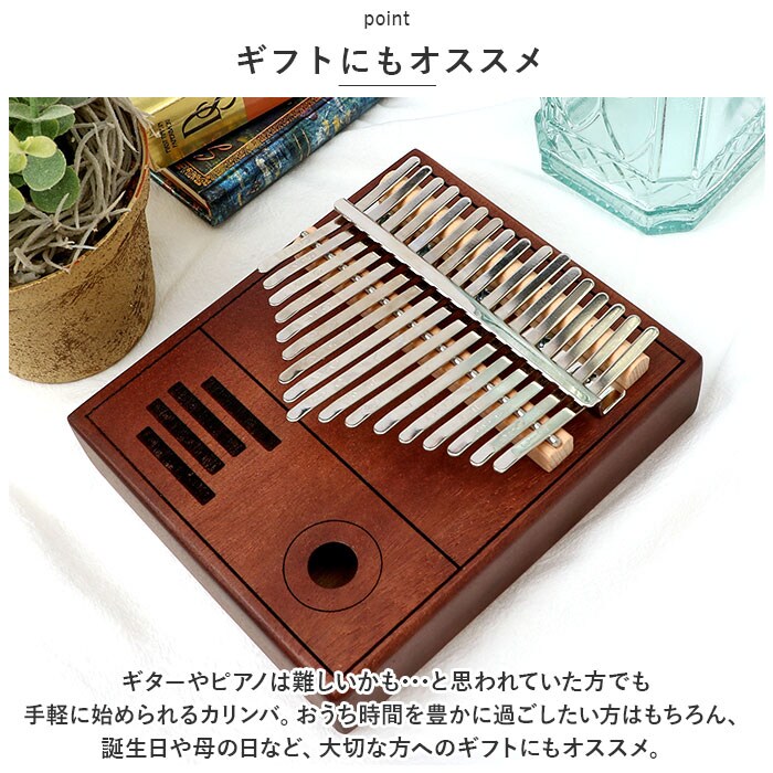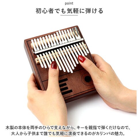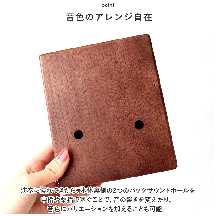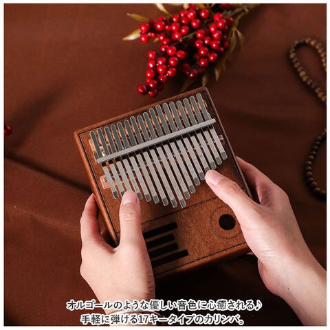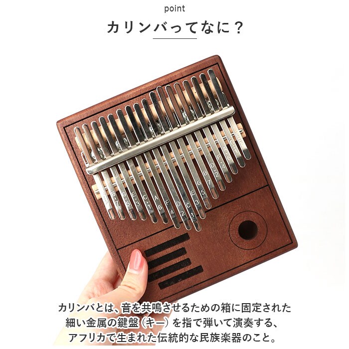 | 商品説明 | オルゴールのような優しい音色に心癒される♪手軽に弾ける17キータイプのカリンバ。【カリンバってなに?】カリンバとは、音を共鳴させるための箱に固定された細い金属の鍵盤(キー)を指で弾いて演奏する、アフリカで生まれた伝統的な民族楽器のこと。【初心者でも気軽に弾ける】木製の本体を両手のひらで支えながら、キーを親指で弾くだけなので、大人から子供まで気軽に演奏できるのがカリンバの魅力。【木目の美しいマホガニー材】カリンバ本体には、手のひらに優しく馴染む桃花心木(マホガニー)を使用。温かみのある音色と、使い込むほどに味わい深く変化する色合いは天然木ならではのもの。【アルファベットの音階付き】鍵盤(キー)には、アルファベットの音階と番号が刻まれているため、視覚的にも演奏がしやすい設計。17キータイプのカリンバでは、約2オクターブの音域を演奏可能。【音色のアレンジ自在】演奏に慣れてきたら、本体裏側の2つのバックサウンドホールを中指や薬指で塞ぐことで、音の響きを変えたり、音色にバリエーションを加えることも可能。【練習曲の楽譜付きブックレット】「ユア・マイ・サンシャイン」などの練習曲の楽譜や、チューニング方法を解説したブックレット付き。(※ブックレット説明文は、すべて英語表記となります。)【メンテナンスツールも充実】演奏時の視認性をアップさせる2色のキーステッカー、指先の痛みを和らげる指サック、キー調律用ハンマー、お手入れ用クロスも付属し、メンテナンス用ツールも充実。【インテリアのワンポイントに】ビンテージ感のあるマホガニー材の表面に、正円や短冊状のサウンドホールを刻みこんだポップな造形が魅力。飾っておくだけでも素敵なインテリアに。【コンパクトに持ち運び】膝の上でも机でもどこでも気軽に演奏開始!ベロア生地で仕上げた収納袋が付属しているので、お出掛け先にも気軽に連れていける!【ギフトにもオススメ】ギターやピアノは難しいかも・・・と思われていた方でも手軽に始められるカリンバ。おうち時間を豊かに過ごしたい方はもちろん、誕生日や母の日など、大切な方へのギフトにもオススメ。 |