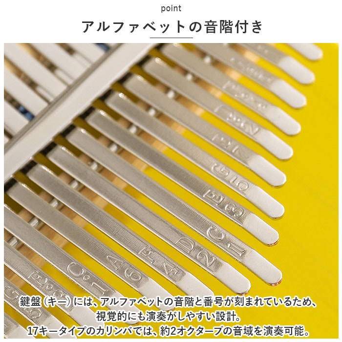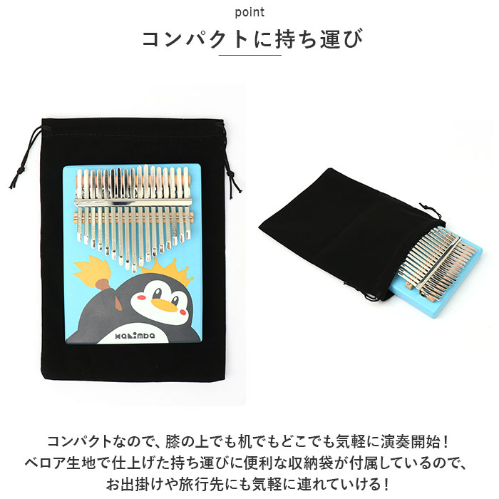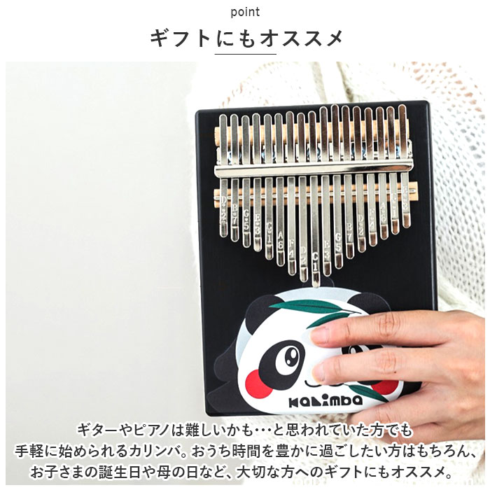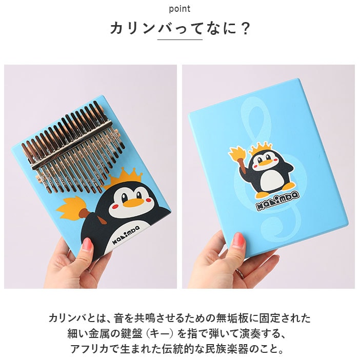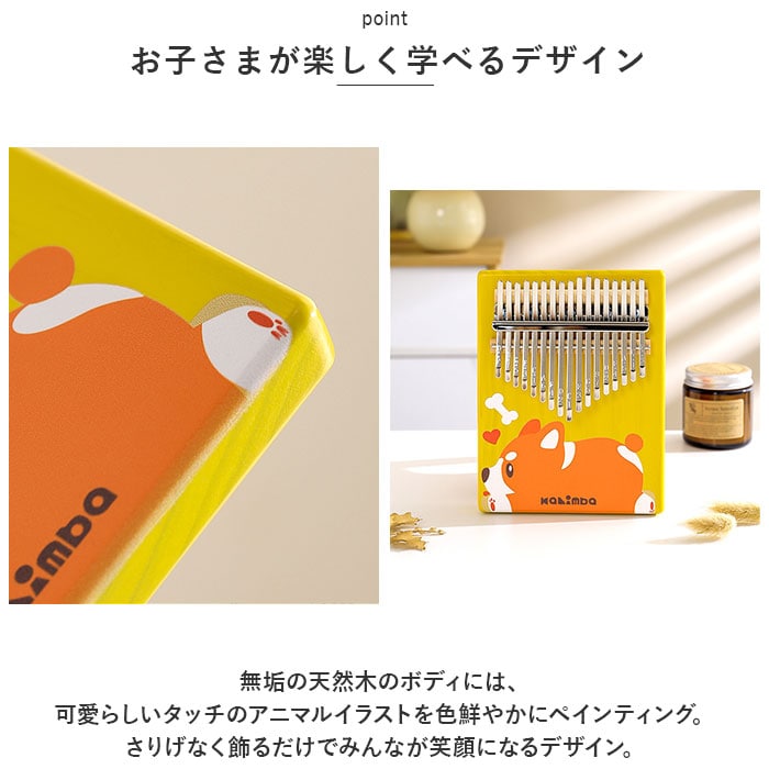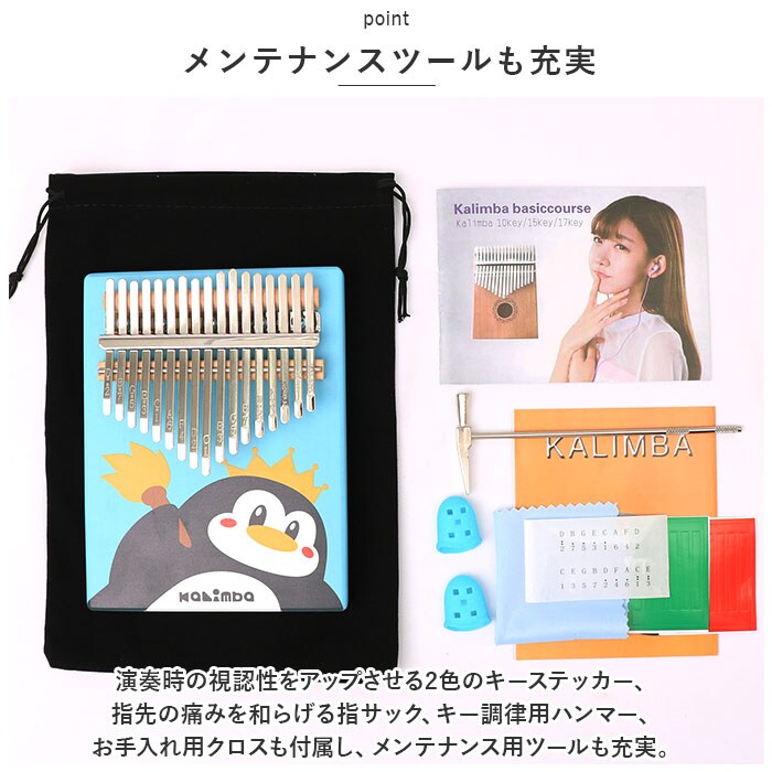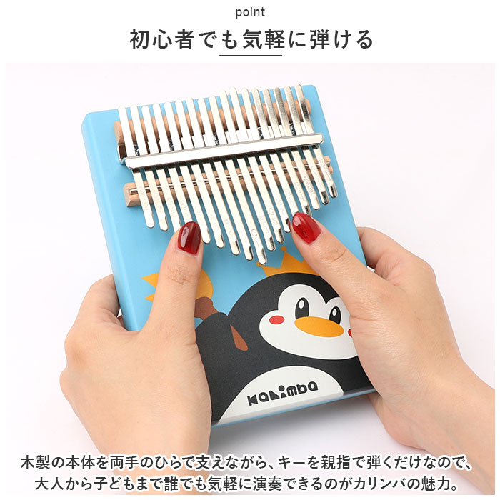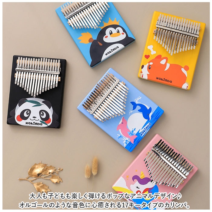 | 商品説明 | 大人も子どもも楽しく弾けるポップなアニマルデザイン♪オルゴールのような音色に心癒される17キータイプのカリンバ。【カリンバってなに?】カリンバとは、音を共鳴させるための無垢板に固定された細い金属の鍵盤(キー)を指で弾いて演奏する、アフリカで生まれた伝統的な民族楽器のこと。【初心者でも気軽に弾ける】木製の本体を両手のひらで支えながら、キーを親指で弾くだけなので、大人から子どもまで誰でも気軽に演奏できるのがカリンバの魅力。【アルファベットの音階付き】鍵盤(キー)には、アルファベットの音階と番号が刻まれているため、視覚的にも演奏がしやすい設計。17キータイプのカリンバでは、約2オクターブの音域を演奏可能。【練習曲の楽譜付きブックレット】「ユア・マイ・サンシャイン」などの練習曲の楽譜や、チューニング方法を解説したブックレット付き。(※楽譜・ブックレット説明文は、すべて英語表記となります。)【メンテナンスツールも充実】演奏時の視認性をアップさせる2色のキーステッカー、指先の痛みを和らげる指サック、キー調律用ハンマー、お手入れ用クロスも付属し、メンテナンス用ツールも充実。【お子さまが楽しく学べるデザイン】無垢の天然木のボディには、可愛らしいタッチのアニマルイラストを色鮮やかにペインティング。さりげなく飾るだけでみんなが笑顔になるデザイン。【コンパクトに持ち運び】コンパクトなので、膝の上でも机でもどこでも気軽に演奏開始!ベロア生地で仕上げた持ち運びに便利な収納袋が付属しているので、お出掛けや旅行先にも気軽に連れていける!【ギフトにもオススメ】ギターやピアノは難しいかも・・・と思われていた方でも手軽に始められるカリンバ。おうち時間を豊かに過ごしたい方はもちろん、お子さまの誕生日や母の日など、大切な方へのギフトにもオススメ。 |