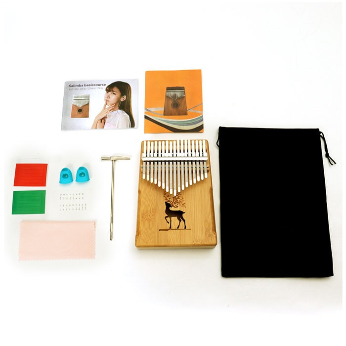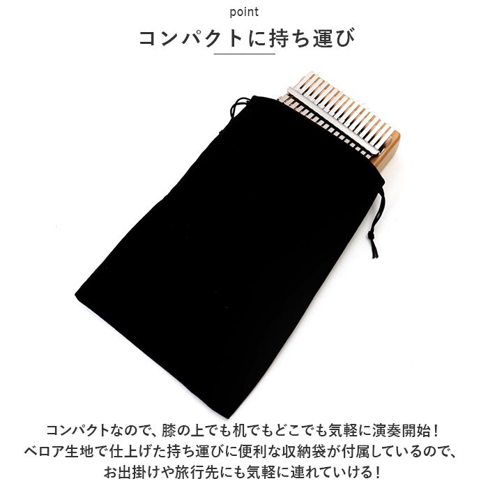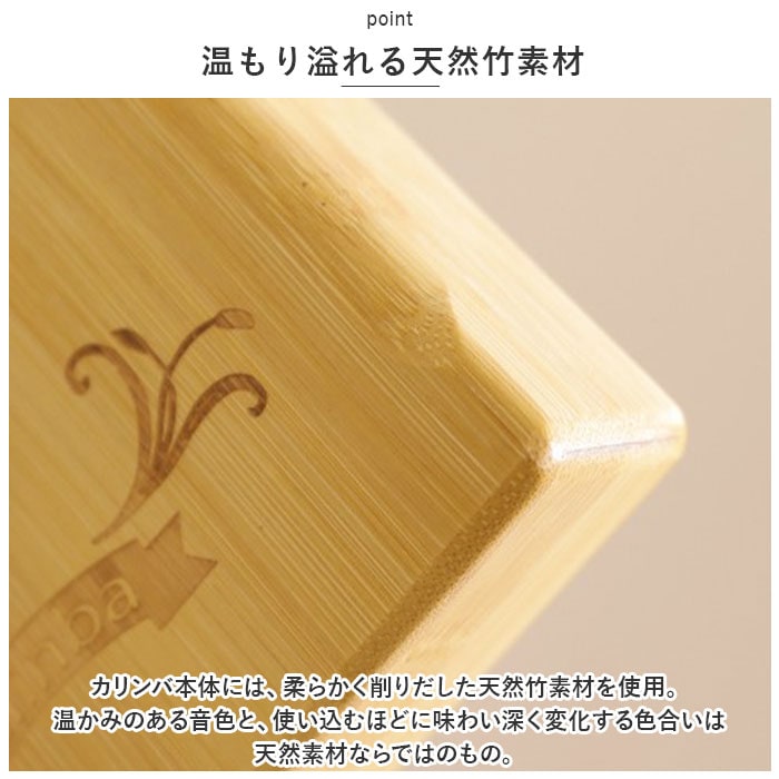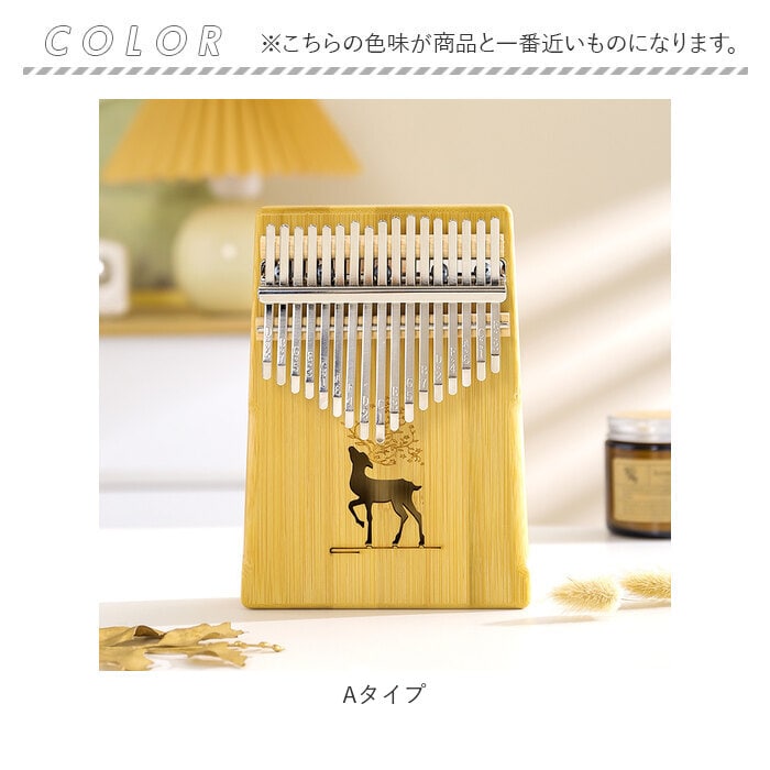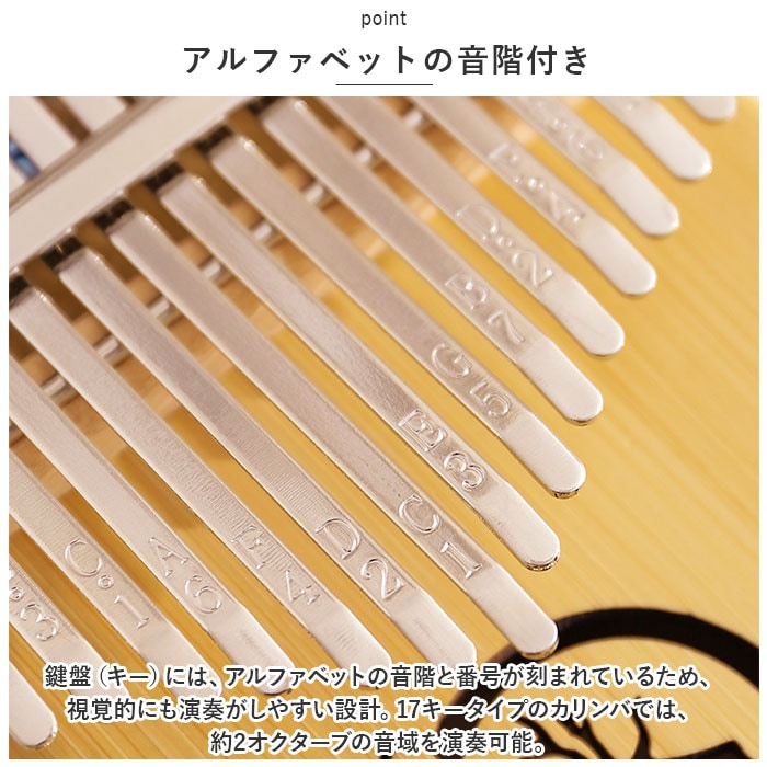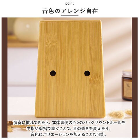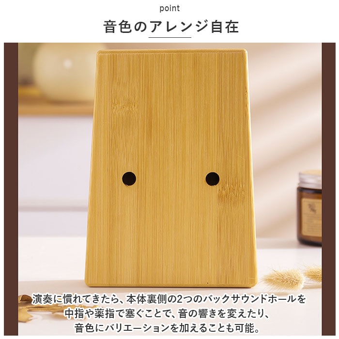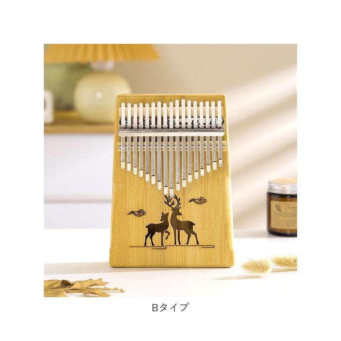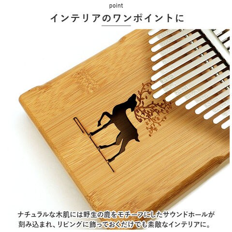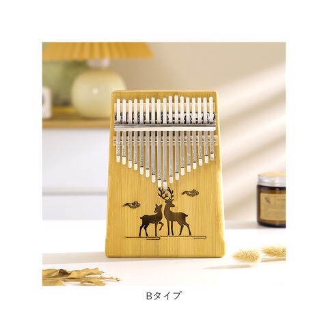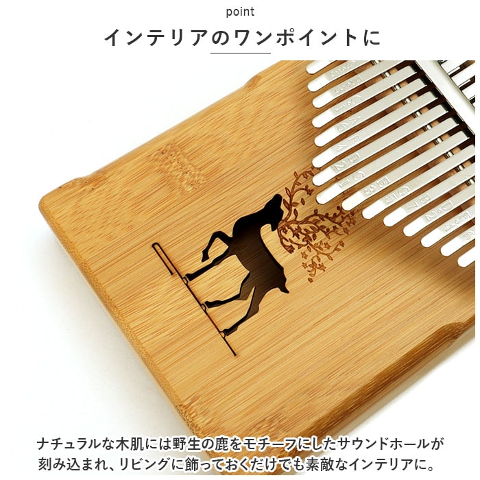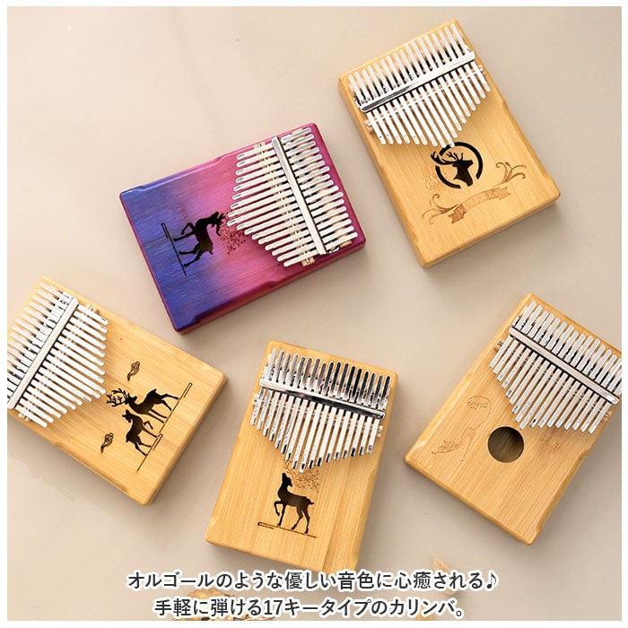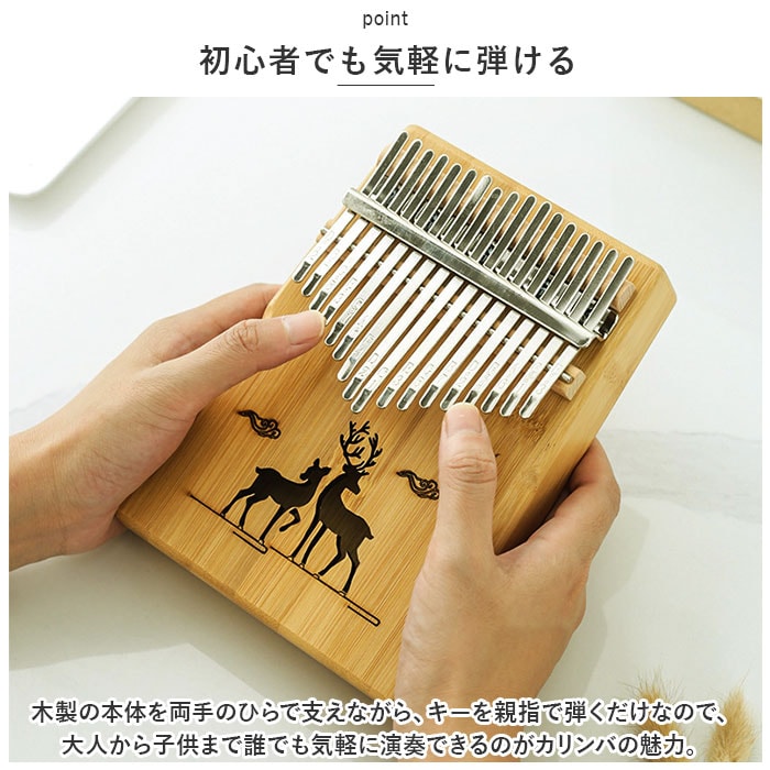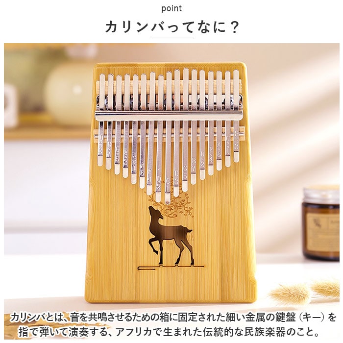 | 商品説明 | オルゴールのような優しい音色に心癒される♪手軽に弾ける17キータイプのカリンバ。【カリンバってなに?】カリンバとは、音を共鳴させるための箱に固定された細い金属の鍵盤(キー)を指で弾いて演奏する、アフリカで生まれた伝統的な民族楽器のこと。【初心者でも気軽に弾ける】木製の本体を両手のひらで支えながら、キーを親指で弾くだけなので、大人から子供まで誰でも気軽に演奏できるのがカリンバの魅力。【温もり溢れる天然竹素材】カリンバ本体には、柔らかく削りだした天然竹素材を使用。温かみのある音色と、使い込むほどに味わい深く変化する色合いは天然素材ならではのもの。【アルファベットの音階付き】鍵盤(キー)には、アルファベットの音階と番号が刻まれているため、視覚的にも演奏がしやすい設計。17キータイプのカリンバでは、約2オクターブの音域を演奏可能。【音色のアレンジ自在】演奏に慣れてきたら、本体裏側の2つのバックサウンドホールを中指や薬指で塞ぐことで、音の響きを変えたり、音色にバリエーションを加えることも可能。【練習曲の楽譜付きブックレット】「ユア・マイ・サンシャイン」などの練習曲の楽譜や、チューニング方法を解説したブックレット付き。(※楽譜・ブックレット説明文は、すべて英語表記となります。)【メンテナンスツールも充実】演奏時の視認性をアップさせる2色のキーステッカー、指先の痛みを和らげる指サック、キー調律用ハンマー、お手入れ用クロスも付属し、メンテナンス用ツールも充実。【インテリアのワンポイントに】ナチュラルな木肌には野生の鹿をモチーフにしたサウンドホールが刻み込まれ、リビングに飾っておくだけでも素敵なインテリアに。【コンパクトに持ち運び】コンパクトなので、膝の上でも机でもどこでも気軽に演奏開始!ベロア生地で仕上げた持ち運びに便利な収納袋が付属しているので、お出掛けや旅行先にも気軽に連れていける!【ギフトにもオススメ】ギターやピアノは難しいかも・・・と思われていた方でも手軽に始められるカリンバ。おうち時間を豊かに過ごしたい方はもちろん、誕生日や母の日など、大切な方へのギフトにもオススメ。 |