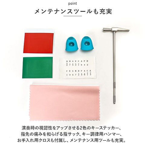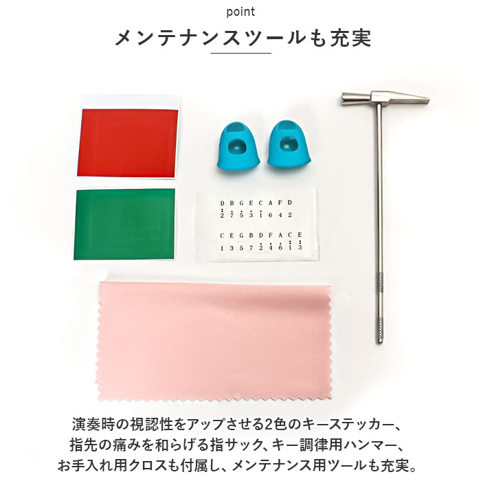 | 注意点 | [付属品]収納袋 x1枚、指サックx2個、運指表x1冊、説明書x1枚、キー調律用ハンマーx1個、お手入れ用クロスx1枚、運指用シールx1枚、赤色と緑色のシールx各1枚海外輸入品のため、商品によってはパッケージや説明書が、英語や中国語表記となっている場合があります。商品を安価でご提供させていただくため、輸入時のパッケージのままでのお届けとなります。予めご了承くださいませ。海外輸入品のため、パッケージに破れ、傷やへこみがある場合がございます。本体には問題ございませんので、予めご了承くださいませ。商品の写真はできる限り実物のお色に近づけるように加工しておりますが、お使いのモニター設定、お部屋の照明などにより、実際の商品と異なる場合がございます。商品の生産時期などにより、付属品(ボタン、ファスナー、タグ、パッケージなど)のデザインや仕様の一部が変更になる場合がございますが、予めご了承くださいませ。採寸方法の違いにより、多少の誤差がある場合がございます。 |