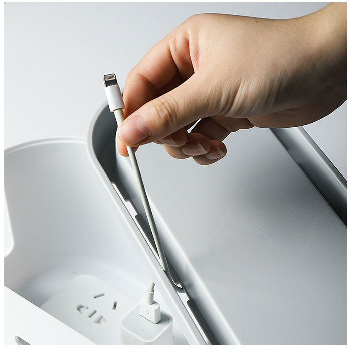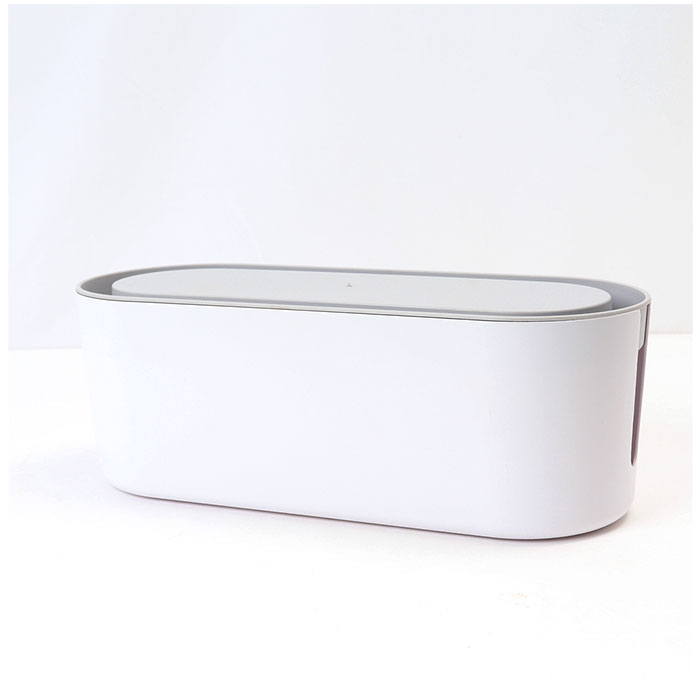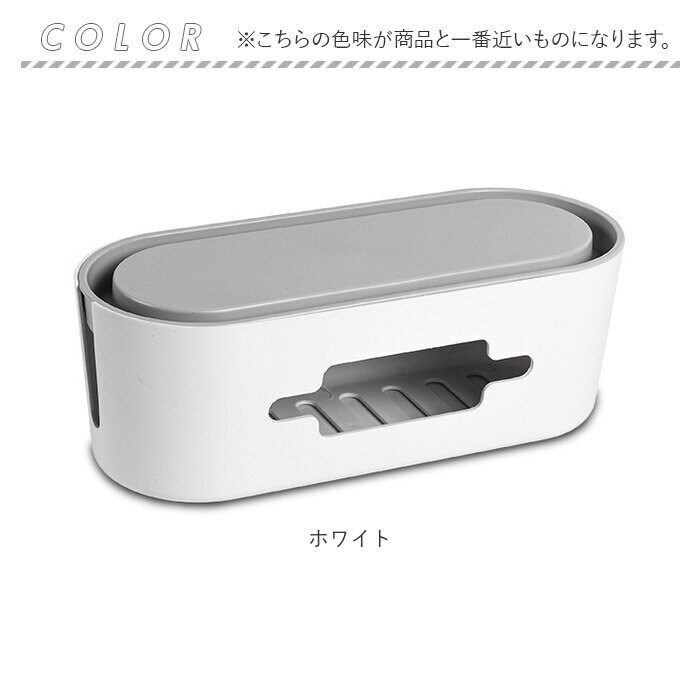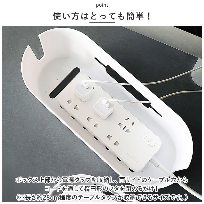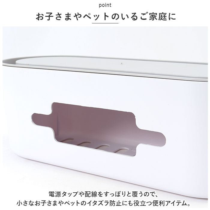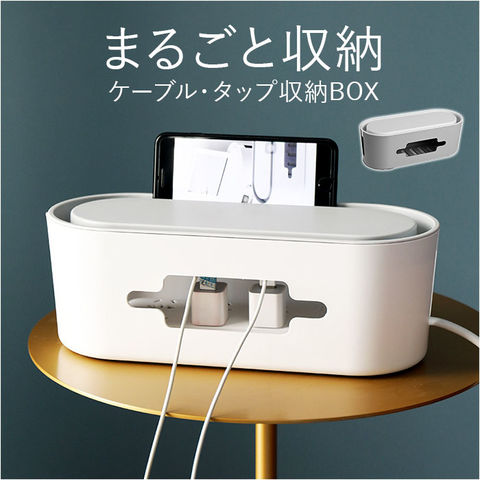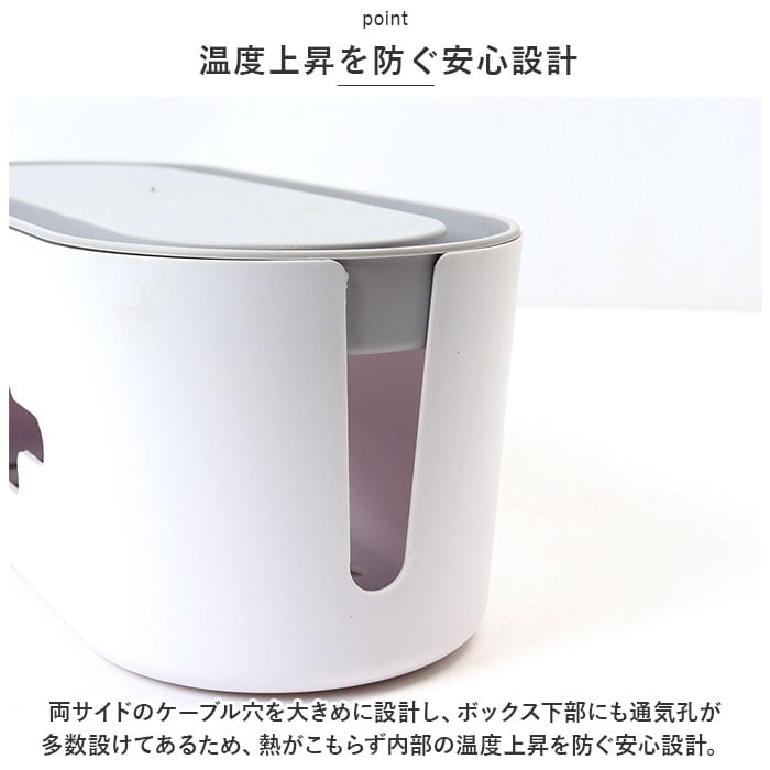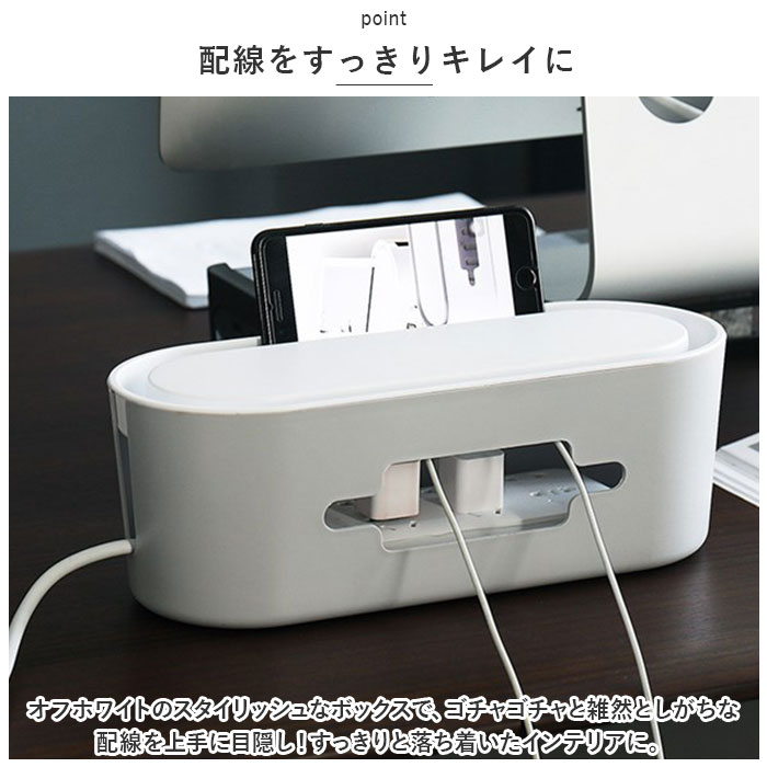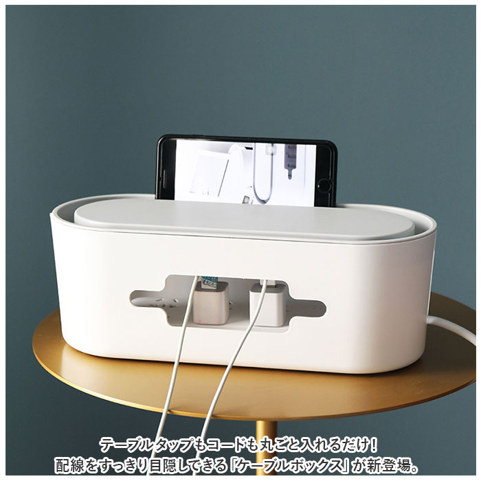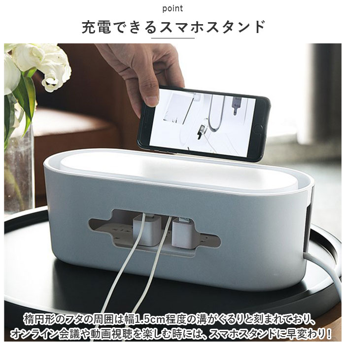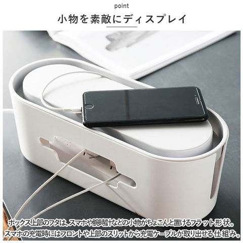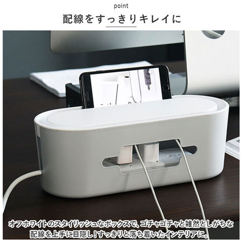 | 商品説明 | テーブルタップもコードも丸ごと入れるだけ!配線をすっきり目隠しできる「ケーブルボックス」が新登場。【配線をすっきりキレイに】オフホワイトのスタイリッシュなボックスで、ゴチャゴチャと雑然としがちな配線を上手に目隠し!すっきりと落ち着いたインテリアに。【使い方はとっても簡単!】ボックス上部から電源タップを収納し、両サイドのケーブル穴からコードを通して楕円形のフタを閉めるだけ!(※長さ約28cm程度のテーブルタップが収納できるサイズです。)【小物を素敵にディスプレイ】ボックス上部のフタは、スマホや腕時計などの小物がちょこんと置けるフラット形状。スマホの充電時にはフロントや上部のスリットから充電ケーブルが取り出せる仕組み。【充電できるスマホスタンド】楕円形のフタの周囲は幅1.5cm程度の溝がぐるりと刻まれており、オンライン会議や動画視聴を楽しむ時には、スマホスタンドに早変わり!【温度上昇を防ぐ安心設計】両サイドのケーブル穴を大きめに設計し、ボックス下部にも通気孔が多数設けてあるため、熱がこもらず内部の温度上昇を防ぐ安心設計。【ホコリを防いで火災予防】電源タップとコンセントの間にたまりやすいホコリを防いで、お掃除の手間がなくラクチン。さらに、漏電による火災の予防にもなり、とっても安全。【お子さまやペットのいるご家庭に】電源タップや配線をすっぽりと覆うので、小さなお子さまやペットのイタズラ防止にも役立つ便利アイテム。【お部屋になじむシンプルカラー】どんな雰囲気のインテリアにも素敵に馴染む、ホワイト&グレーのシンプルなカラーリング。テレワーク中のデスクの整理にもオススメ。 |