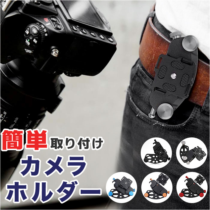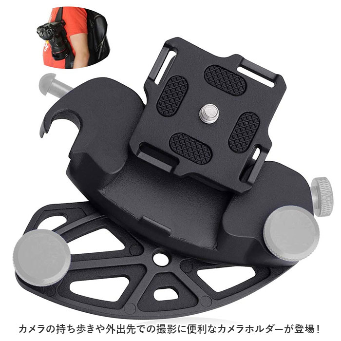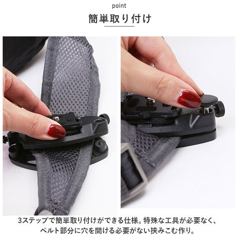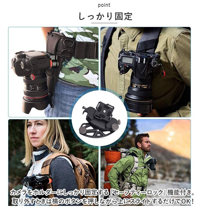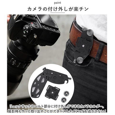 | 商品説明 | カメラの持ち歩きや外出先での撮影に便利なカメラホルダーが登場!【カメラの付け外しが楽チン】リュックサックやベルト部分に付け外しができるカメラホルダー。撮影時もサッと取り出すことができベストタイミングを逃がさない!【簡単取り付け】・3ステップで簡単取り付けができる仕様。特殊な工具が必要なく、ベルト部分に穴を開ける必要がない挟みこむ作り。【しっかり固定】カメラをホルダーにしっかり固定する「セーフティーロック」機能付き。取り外すときは横のボタンを押しながら上にスライドするだけでOK!【耐久性あり】金属製で重みのある一眼レフもしっかり支える◎錆びにくいスチール素材で耐久性も! |