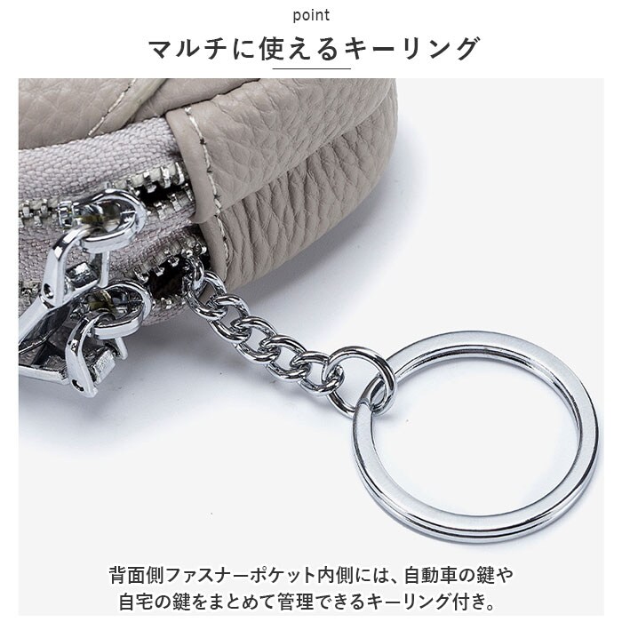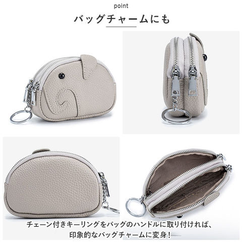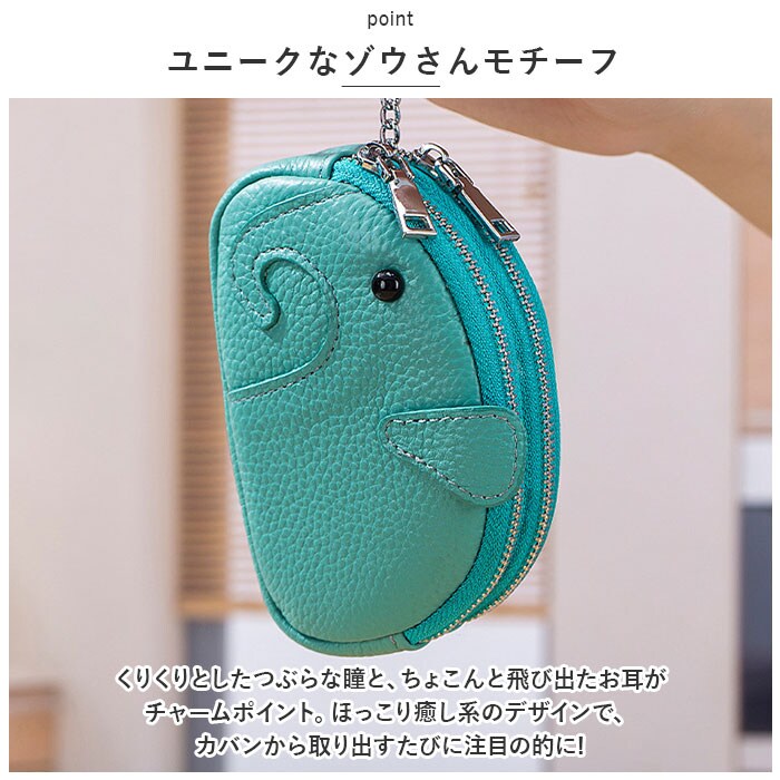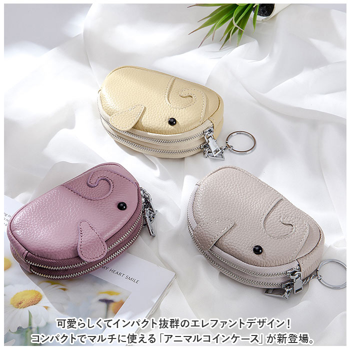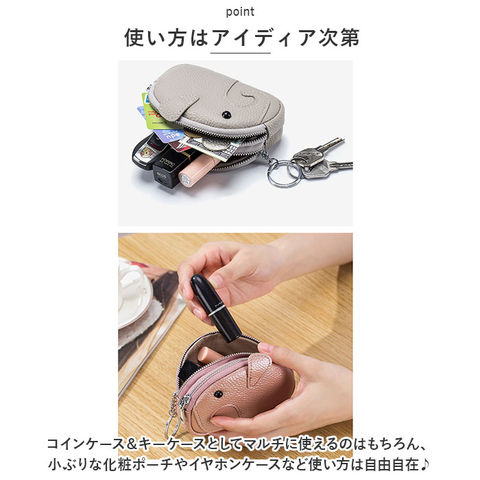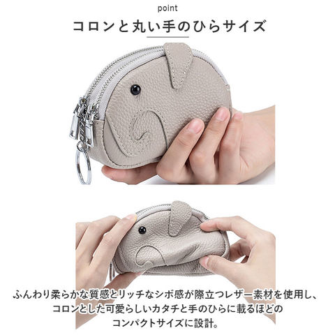 | 商品説明 | 可愛らしくてインパクト抜群のエレファントデザイン!コンパクトでマルチに使える「アニマルコインケース」が新登場。【コロンと丸い手のひらサイズ】ふんわり柔らかな質感とリッチなシボ感が際立つレザー素材を使用し、コロンとした可愛らしいカタチと手のひらに載るほどのコンパクトサイズに設計。【整理に役立つ2ルーム仕様】ケースの前後それぞれにファスナールームを設けた2ルーム仕様なので、小物やコインの仕分けが楽ちん。【フロント側お財布ポケット】ゾウさんの横顔が印象的な前面のファスナーは、折りたたんだ紙幣やコイン、カード類がこぼれる心配のないお財布ポケット。程よくマチ幅で、小銭が増えた時でも安心。【マルチに使えるキーリング】背面側ファスナーポケット内側には、自動車の鍵や自宅の鍵をまとめて管理できるキーリング付き。【バッグチャームにも】チェーン付きキーリングをバッグのハンドルに取り付ければ、印象的なバッグチャームに変身!【使い方はアイディア次第】コインケース&キーケースとしてマルチに使えるのはもちろん、小ぶりな化粧ポーチやイヤホンケースなど使い方は自由自在♪【使いやすいシンプルカラー】ケースを持つ手元がパッと華やぐ、くすみカラー&ベーシックカラーの豊富なバリエーション。【ユニークなゾウさんモチーフ】くりくりとしたつぶらな瞳と、ちょこんと飛び出たお耳がチャームポイント。ほっこり癒し系のデザインで、カバンから取り出すたびに注目の的に! |