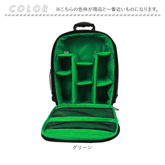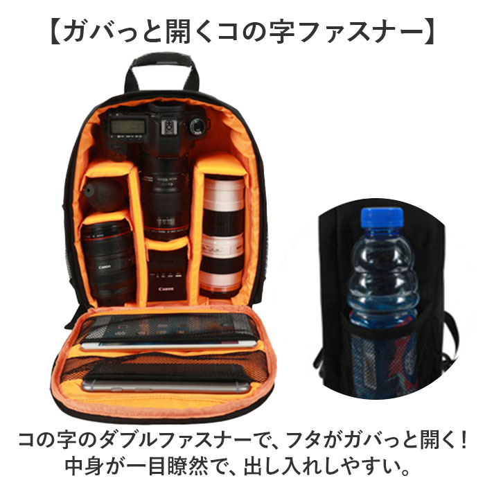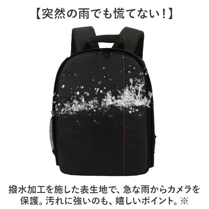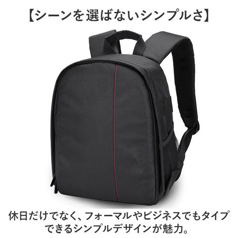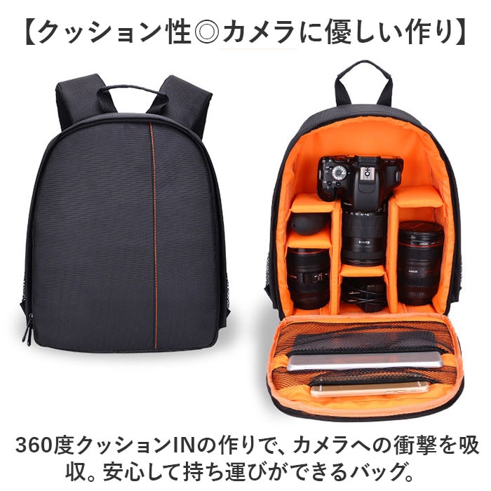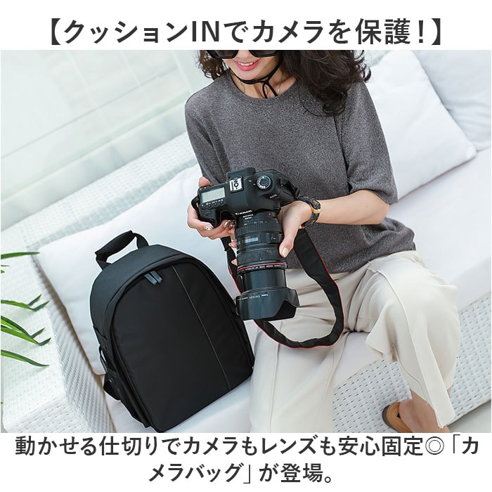 | 商品説明 | 【クッションINでカメラを保護!】動かせる仕切りでカメラもレンズも安心固定◎「カメラバッグ」が登場。【クッション性◎カメラに優しい作り】・360度クッションINの作りで、カメラへの衝撃を吸収。安心して持ち運びができるバッグ。【動かせる仕切りで自分仕様に◎】面ファスナー仕様の仕切り板を、お好みの場所に移動してしっかり固定できる◎【アクセサリの収納もできる!】ケーブルやメモリーカードなどの小物をしまえるポケットを、内側と外側に搭載。【突然の雨でも慌てない!】撥水加工を施した表生地で、急な雨からカメラを保護。汚れに強いのも、嬉しいポイント。※完全防水ではありません。【ハンズフリーなリュックタイプ】両手があくから撮影しやすい!肩紐にはクッションパッドを搭載し、重さや負担を軽減。【ガバっと開くコの字ファスナー】コの字のダブルファスナーで、フタがガバっと開く!中身が一目瞭然で、出し入れしやすい。【シーンを選ばないシンプルさ】休日だけでなく、フォーマルやビジネスでもタイプできるシンプルデザインが魅力。【ポケット仕様】サイド:メッシュオープンポケット×2メイン収納:メッシュファスナーポケット×2 |