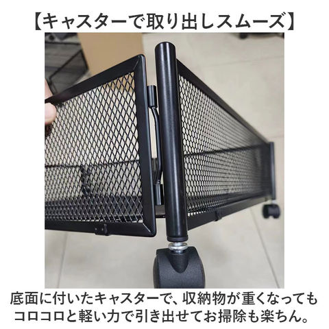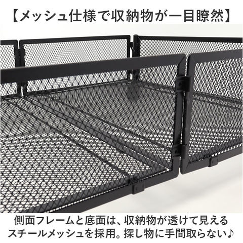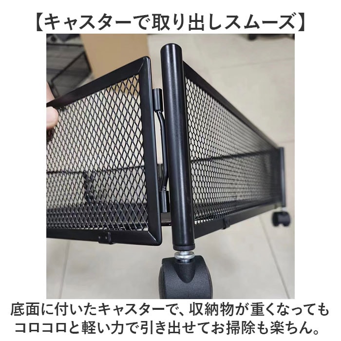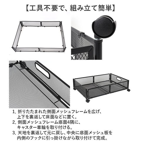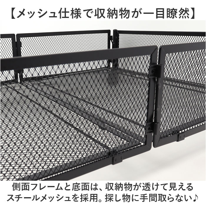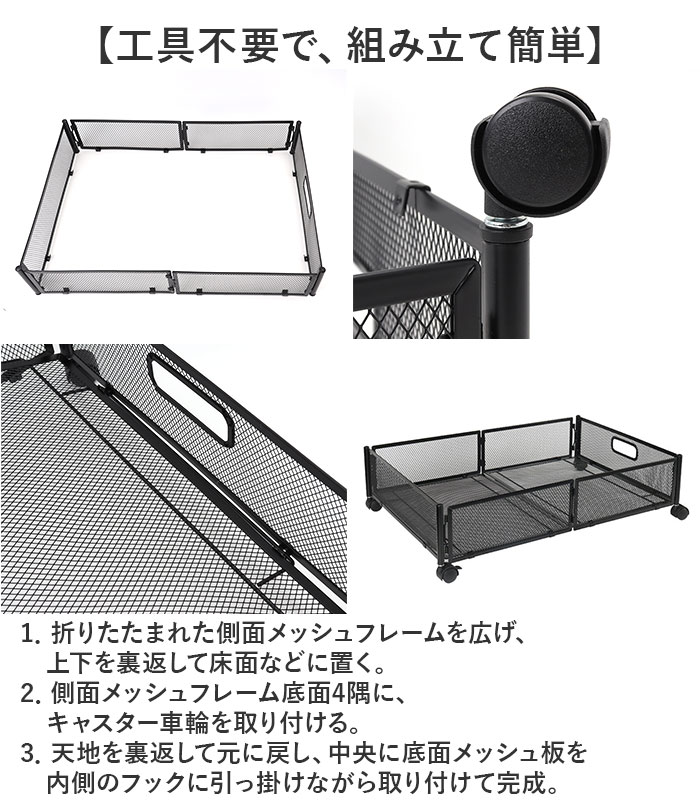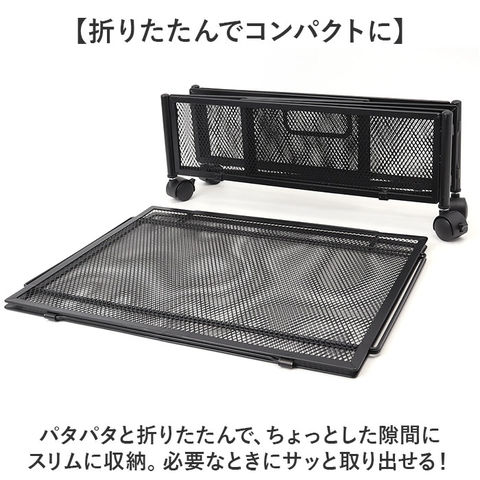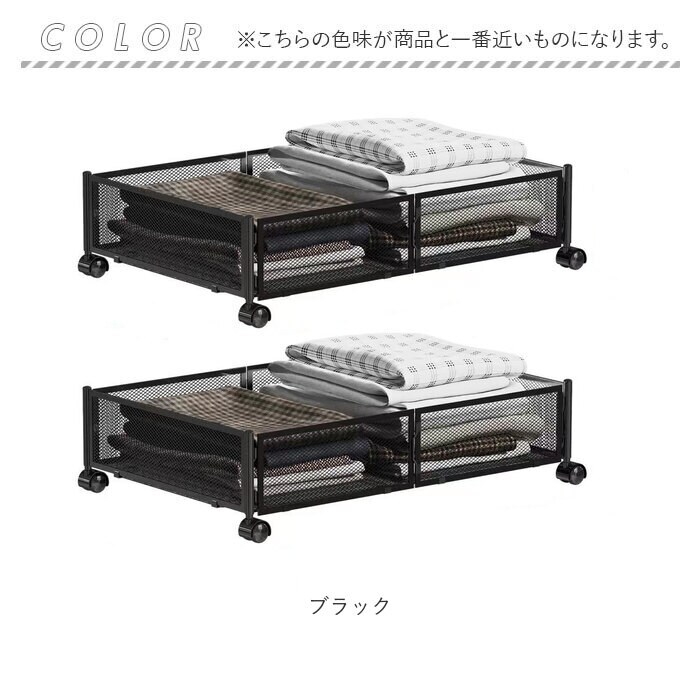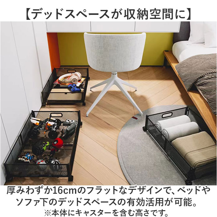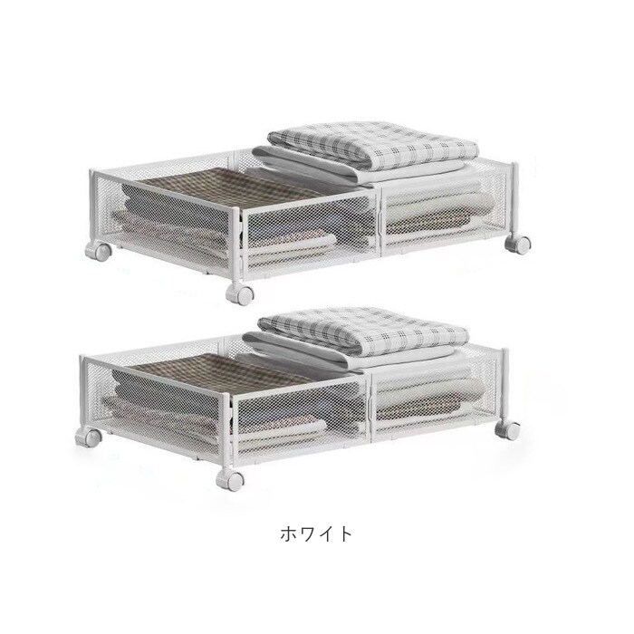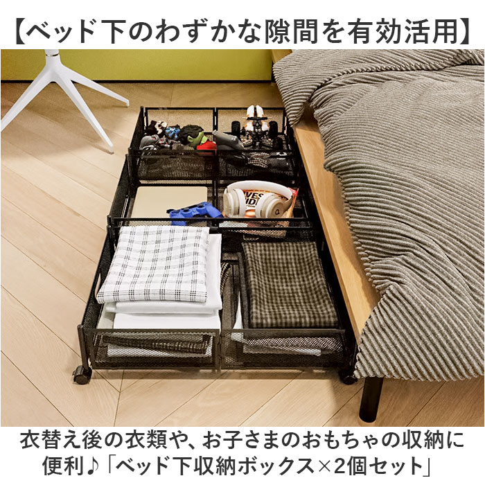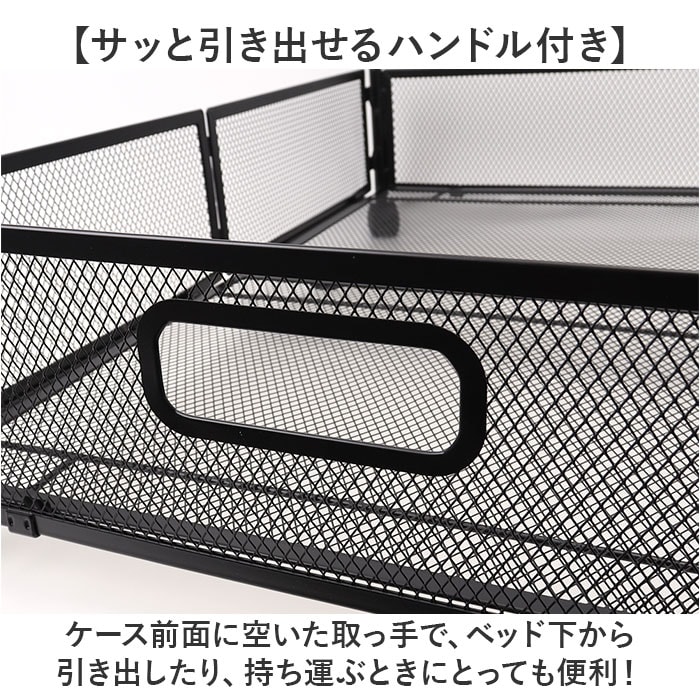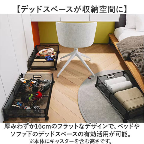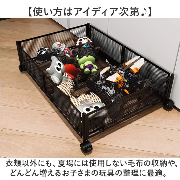 | 商品説明 | 【ベッド下のわずかな隙間を有効活用】衣替え後の衣類や、お子さまのおもちゃの収納に便利♪「ベッド下収納ボックス×2個セット」【デッドスペースが収納空間に】厚みわずか16cmのフラットなデザインで、ベッドやソファ下のデッドスペースの有効活用が可能。※厚みわずか16cm・・・本体にキャスターを含む高さです。【奥行きたっぷりの大容量設計】収納部分は、幅約41cm×奥行き約59cmの大容量設計。いつの間にか増えてしまう衣類を上手に整理。【メッシュ仕様で収納物が一目瞭然】側面フレームと底面は、収納物が透けて見えるスチールメッシュを採用。探し物に手間取らない♪【キャスターで取り出しスムーズ】底面に付いたキャスターで、収納物が重くなってもコロコロと軽い力で引き出せてお掃除も楽ちん。【ロック機能付きキャスター】付属の4つのキャスターのうち2つにロック機能を搭載。お子さまのいたずら対策やつまずき防止に。【サッと引き出せるハンドル付き】ケース前面に空いた取っ手で、ベッド下から引き出したり、持ち運ぶときにとっても便利!【使い方はアイディア次第♪】衣類以外にも、夏場には使用しない毛布の収納や、どんどん増えるお子さまの玩具の整理に最適。【折りたたんでコンパクトに】パタパタと折りたたんで、ちょっとした隙間にスリムに収納。必要なときにサッと取り出せる!【工具不要で、組み立て簡単】1.折りたたまれた側面メッシュフレームを広げ、上下を裏返して床面などに置く。2.側面メッシュフレーム底面4隅に、キャスター車輪を取り付ける。3.天地を裏返して元に戻し、中央に底面メッシュ板を内側のフックに引っ掛けながら取り付けて完成。【インテリアに溶け込むカラー】落ち着きのある寝室のインテリアにすっきり馴染む、シックなモノトーンのカラーバリエーション。【収納上手さんの便利アイテム】衣替え時期の衣類の整理にはもちろん、お部屋の模様替えなど、さまざまなシーンで大活躍。 |