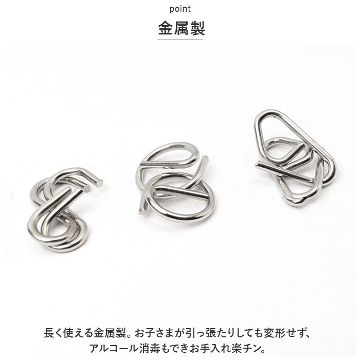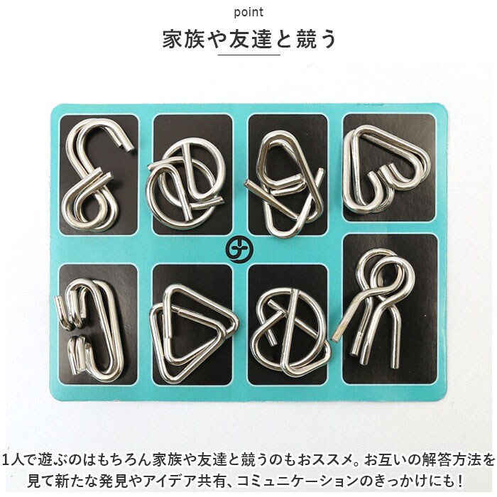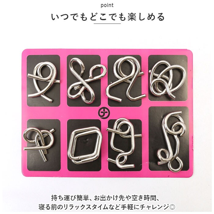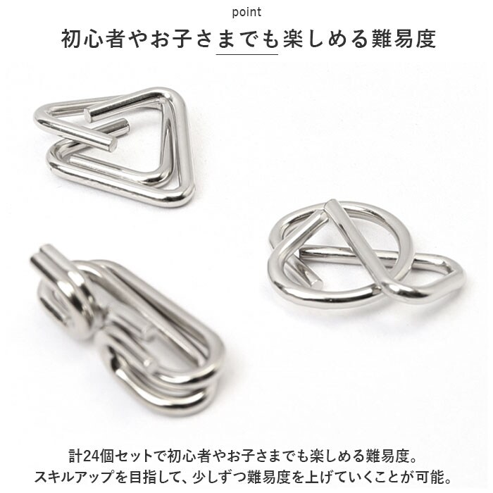 商品説明脳トレーニングにピッタリ♪知恵の輪が新発売!【集中力を鍛える】子どもから大人まで楽しめる知恵の輪は、集中力向上や頭の体操に最適。【いつでもどこでも楽しめる】持ち運び簡単、お出かけ先や空き時間、寝る前のリラックスタイムなど手軽にチャレンジ◎【家族や友達と競う】・1人で遊ぶのはもちろん家族や友達と競うのもおススメ。お互いの解答方法を見て新たな発見やアイデア共有、コミュニケーションのきっかけにも!【初心者やお子さまでも楽しめる難易度】計24個セットで初心者やお子さまでも楽しめる難易度。スキルアップを目指して、少しずつ難易度を上げていくことが可能。【金属製】長く使える金属製。お子さまが引っ張たりしても変形せず、アルコール消毒もできお手入れ楽チン。【気が向いた時に楽しめていつでも中断】気が向いた時に楽しめ、いつでも中断可能。自分のペースで取り組み、達成感を味わいながら楽しく過ごせる時間に。