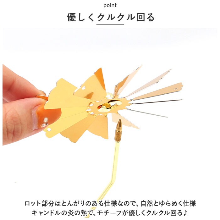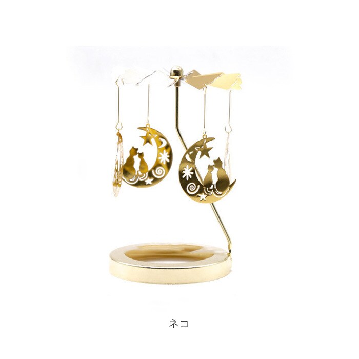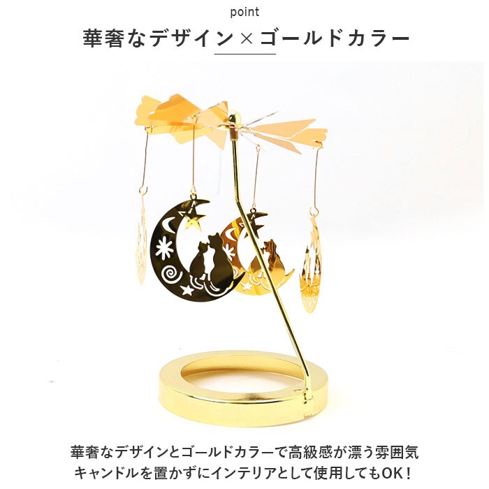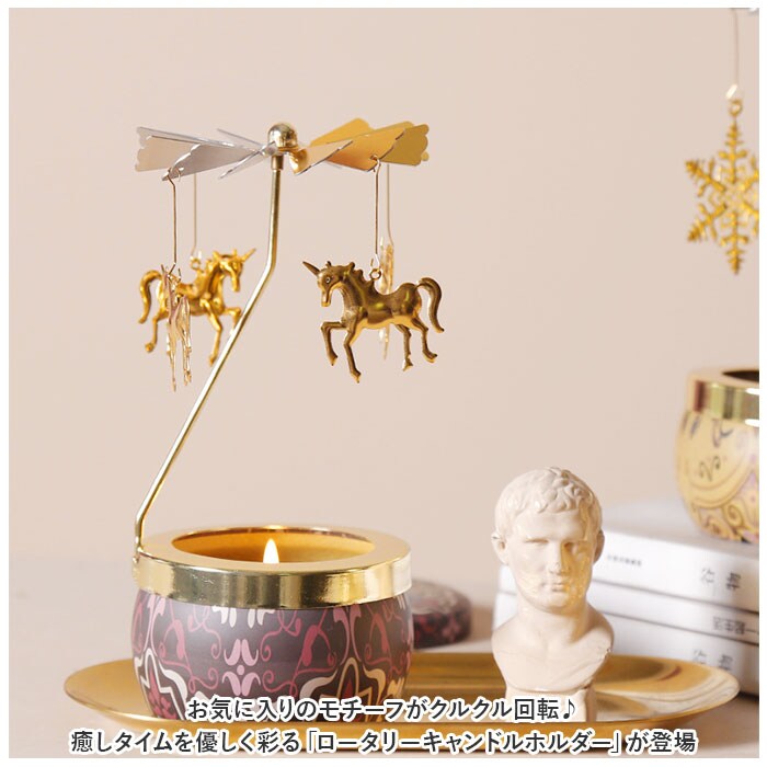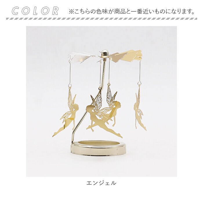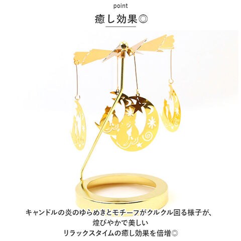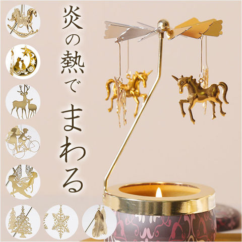 | 商品説明 | お気に入りのモチーフがクルクル回転♪癒しタイムを優しく彩る「ロータリーキャンドルホルダー」が登場。【簡単組立】工具不要。パーツを組み合わせるだけの簡単組立。すぐに使える◎【優しくクルクル回る】ロット部分はとんがりのある仕様なので、自然とゆらめく仕様。キャンドルの炎の熱で、モチーフが優しくクルクル回る♪【癒し効果◎】キャンドルの炎のゆらめきとモチーフがクルクル回る様子が、煌びやかで美しい。リラックスタイムの癒し効果を倍増◎【華奢なデザイン×ゴールドカラー】華奢なデザインとゴールドカラーで高級感が漂う雰囲気。キャンドルを置かずにインテリアとして使用してもOK!【モチーフがたくさん】モチーフのバリエーションが豊富。ギフトにもおすすめ♪ |