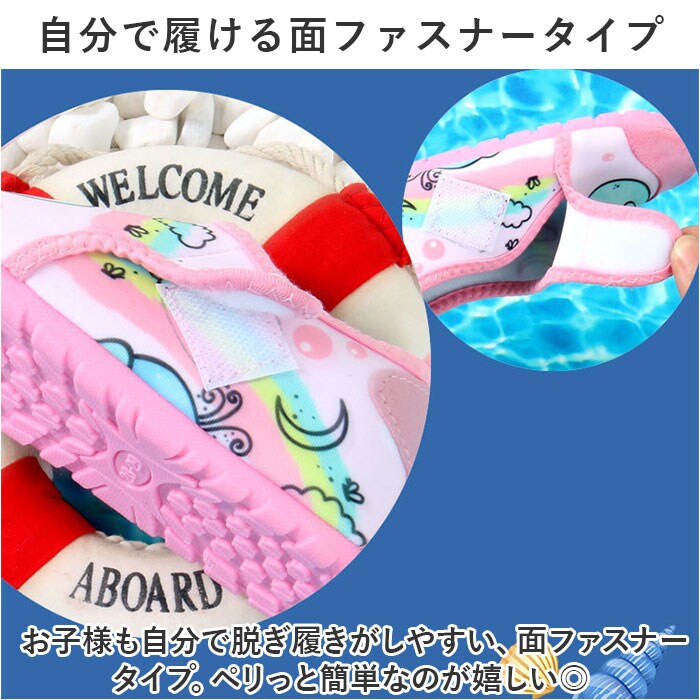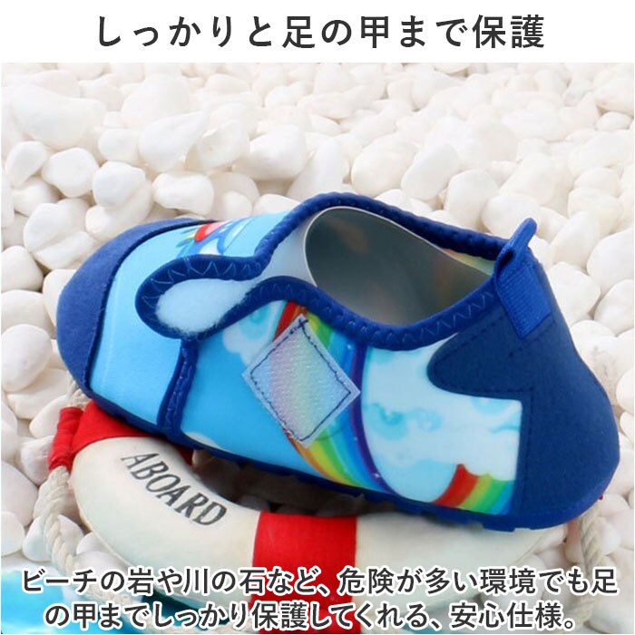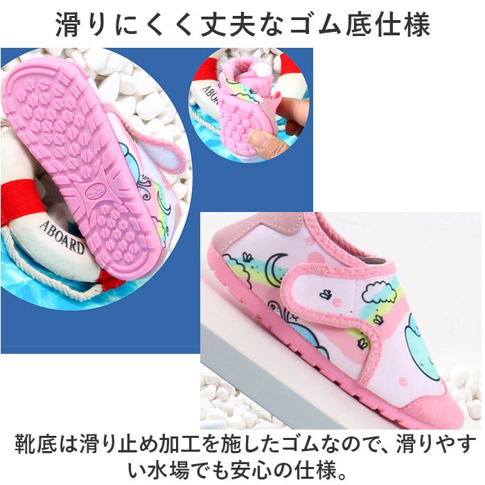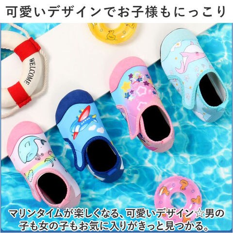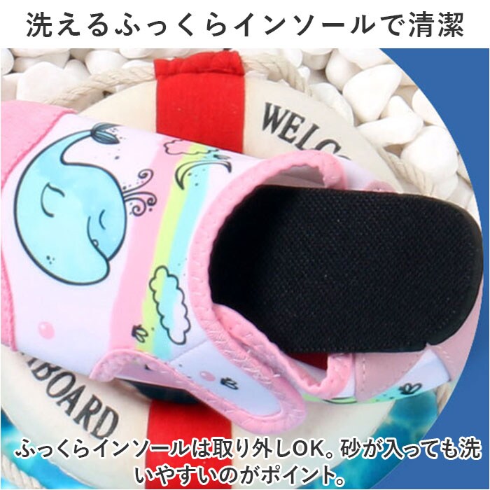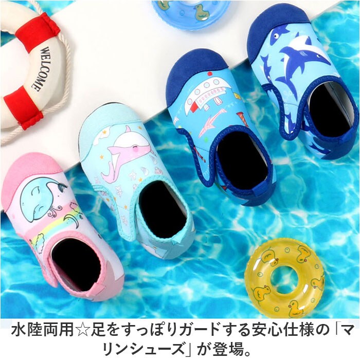 | 商品説明 | 水陸両用☆足をすっぽりガードする安心仕様の「マリンシューズ」が登場。【嬉しい水陸両用☆水遊びで活躍】ビーチやプール、川遊びやじゃぶじゃぶ池など、幅広い水遊びシーンで使える、水陸両用タイプ。【やわらかな履き心地で足にフィット】アッパーは柔らかな布仕様なので、足に馴染みフィット。小さなお子様もストレスなく履ける。【超軽量で水の中でも動きやすい】約51gと超軽量タイプ。水中でも重くなりにくい。※27-28(16cm)片足分の重量です。【しっかりと足の甲まで保護】ビーチの岩や川の石など、危険が多い環境でも足の甲までしっかり保護してくれる、安心仕様。【滑りにくく丈夫なゴム底仕様】靴底は滑り止め加工を施したゴムなので、滑りやすい水場でも安心の仕様。【自分で履ける面ファスナータイプ】お子様も自分で脱ぎ履きがしやすい、面ファスナータイプ。ペリっと簡単なのが嬉しい◎【洗えるふっくらインソールで清潔】ふっくらインソールは取り外しOK。砂が入っても洗いやすいのがポイント。【可愛いデザインでお子様もにっこり】マリンタイムが楽しくなる、可愛いデザイン☆男の子も女の子もお気に入りがきっと見つかる。 |
