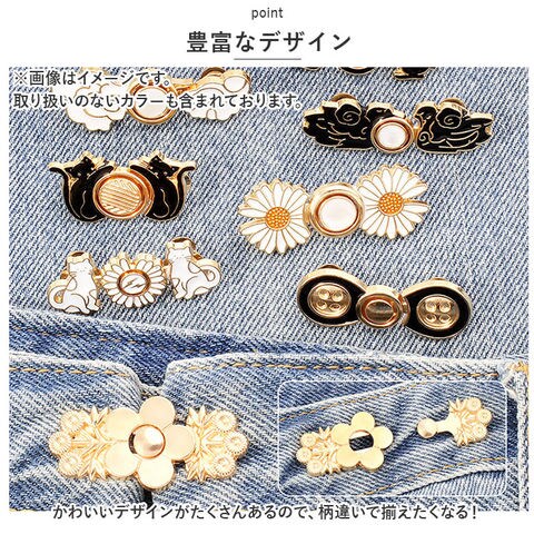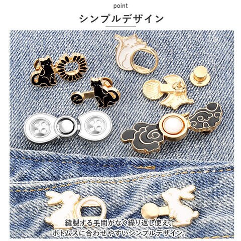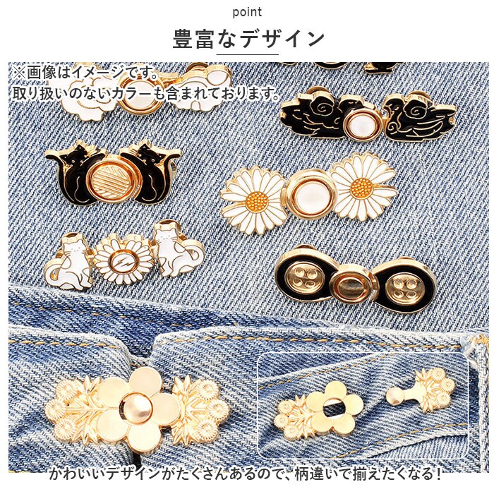 | 商品説明 | ボトムスのウエストを簡単に手直しできる「ウエスト調整クリップ」が発売。【取り付け簡単】調節したい箇所にボタンピンを刺してフックを固定させ、フックをひっかけるだけ!【デニムもOK】金属製のピンタイプだからデニムなど厚めの生地でもしっかり留められるのもポイント♪【シンプルデザイン】縫製する手間がなく繰り返し使え、ボトムスに合わせやすいシンプルデザイン。【コーデのアクセントに】スーツジャケットの胸元やストール留めに付ければ普段の装いに華やかさをプラス。【豊富なデザイン】かわいいデザインがたくさんあるので、柄違いで揃えたくなる! |