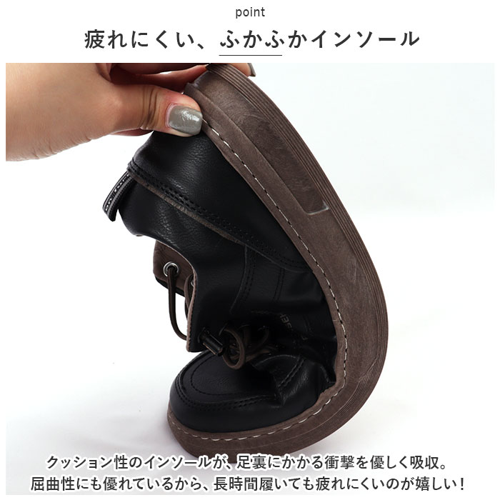 | 商品説明 | 落ち着いた秋冬コーデにすっきり馴染む、シンプル&カジュアルシューズの登場。【秋冬コーデに】フロントのビスネームと落ち着いたカラーが秋冬コーデにしっくり馴染む。【脱ぎ履きがラクチン】両端の紐を付属のパーツに入れれば結ばない靴紐の完成!紐は伸縮性あるゴム紐で、結ぶ手間ナシ!さらにプルストラップ付で、脱ぎ履きがラクチン♪【幅広WIDE設計】甲幅が広めの方でもゆったり履ける!つま先部分に締め付け感のない「幅広ワイド設計」。【疲れにくい、ふかふかインソール】クッション性のインソールが、足裏にかかる衝撃を優しく吸収。屈曲性にも優れているから、長時間履いても疲れにくいのが嬉しい!【滑りにくい】アウトソールには滑り止加工されているので、雨に濡れた地面やツルツルとした床でも滑りにくい安心仕様。【外せるインソール】インソールは取り外して洗えるので、気になる靴内をいつでも清潔に保つことができる◎【シンプルデザイン】洋服に合わせやすいシンプルデザイン&カラー!お出かけ、レジャー、スポーツ、アウトドア、もちろんタウンユースにも★ |