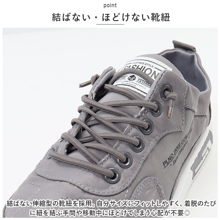 | 商品説明 | デイリー使いにぴったり。カジュアルコーデに馴染む、メンズスニーカーが新登場。【軽やかな履き心地】足に負担がかかりにくい軽量設計。アクティブに動くシーンや移動の多い日も、ストレスフリー。【結ばない・ほどけない靴紐】結ばない伸縮型の靴紐を採用。自分サイズにフィットしやすく、着脱のたびに紐を結ぶ手間や移動中にほどけてしまう心配が不要◎【足入れがスムーズ】タン部分が大きく開いて、着脱ラクラク。かかとにはプルタブ付き。【衝撃をガード】地面からの衝撃を吸収する、程よい厚みのソール。ソフトなインソールは、取り外せて衛生的。【歩きやすさが向上】屈曲性があり、つま先がやや上を向いた形状。つまづきにくく、蹴り上げやすい!【ナチュラルなカラー】コーデを選ばず使いやすい、ナチュラル感漂うカラーをラインナップ。オフの日に履きたい1足☆ |