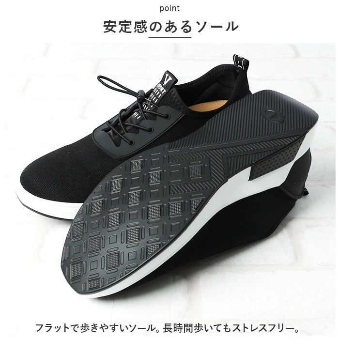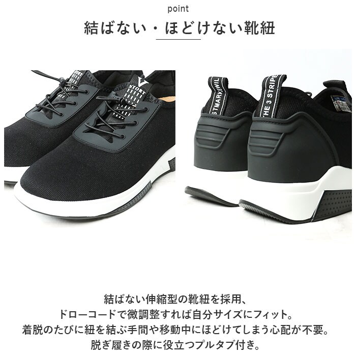 | 商品説明 | こっそりスタイルアップが叶う☆デイリー使いしやすい、メンズ用シークレットシューズが新登場。【使い勝手ばっちりな1足】アッパー&サイドはソフトで通気性に優れた素材を使用しており、アクティブに動く日に最適◎軽量で足に負担がかかりにくいのもポイント。【秘密のインヒールを内蔵】程よい厚みのソールに加え、高さを出すインヒールを装備。見た目は普通のシューズなのに、履くだけでちょこっと身長がアップ!インヒールは取り外せて衛生的。【結ばない・ほどけない靴紐】結ばない伸縮型の靴紐を採用、ドローコードで微調整すれば自分サイズにフィット。着脱のたびに紐を結ぶ手間や移動中にほどけてしまう心配が不要。脱ぎ履きの際に役立つプルタブ付き。【歩きやすさが向上】屈曲性があり、つま先がやや上を向いた形状。つまづきにくく、蹴り上げやすい!【安定感のあるソール】フラットで歩きやすいソール。長時間歩いてもストレスフリー。【選べるカラー】カジュアルスタイルに馴染む、ベーシックカラーをラインナップ。お好みに合わせてチョイスして! |