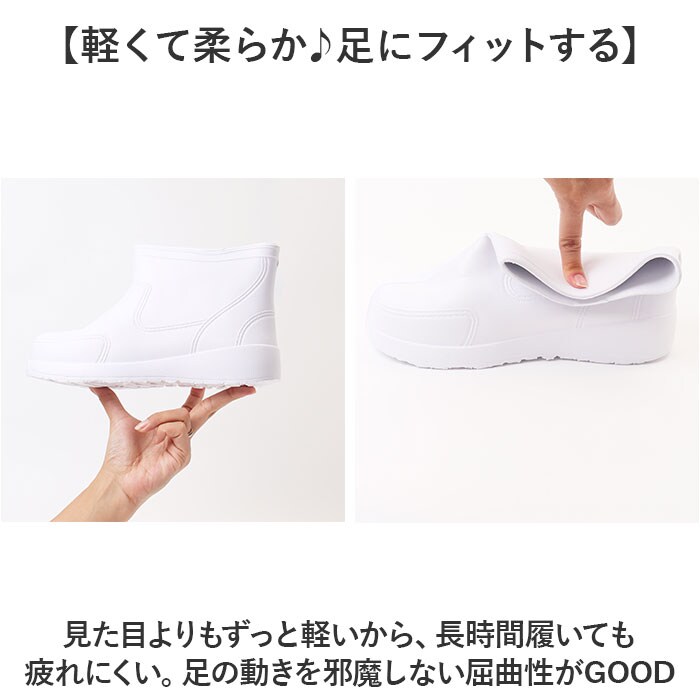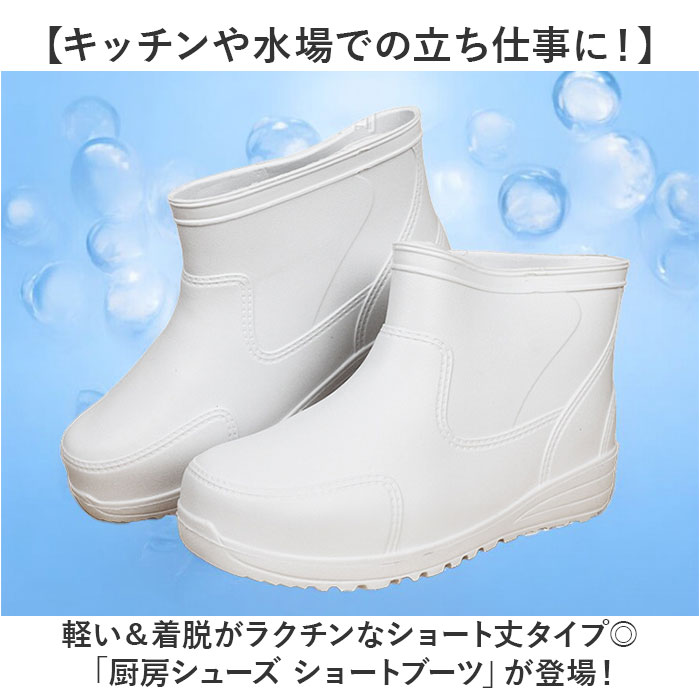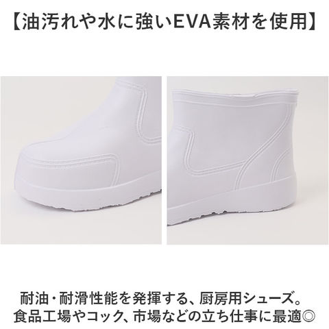 | 商品説明 | 【キッチンや水場での立ち仕事に!】軽い&着脱がラクチンなショート丈タイプ◎「厨房シューズ ショートブーツ」が登場!【油汚れや水に強いEVA素材を使用】耐油・耐滑性能を発揮する、厨房用シューズ。食品工場やコック、市場などの立ち仕事に最適◎【滑り止め加工でしっかり転倒対策】全方面からのスリップを抑制する、靴裏の溝がポイント。優れた耐滑性能を発揮し、転倒対策に◎【耐久性バツグンで劣化しにくい】弾力があり耐久性にも優れたEVA素材で、長く使えるのが嬉しい。過酷な環境に負けない作り。【靴紐レス+ショートブーツタイプ】煩わしい靴紐の結び直しが不要でラクチン!動きやすく、着脱が簡単なショート丈◎【軽くて柔らか♪足にフィットする】見た目よりもずっと軽いから、長時間履いても疲れにくい。足の動きを邪魔しない屈曲性がGOOD【サッと拭きとりOKのイージーケア】汚れが気になったらサッと拭きとりが可能。毎日使うモノだから清潔さをキープできてラクチン♪【みんなが使えるシンプルデザイン】飽きの来ないシンプルなデザイン。サイズも豊富なので、性別年齢気にせずに誰でも使える。 |
