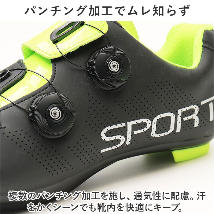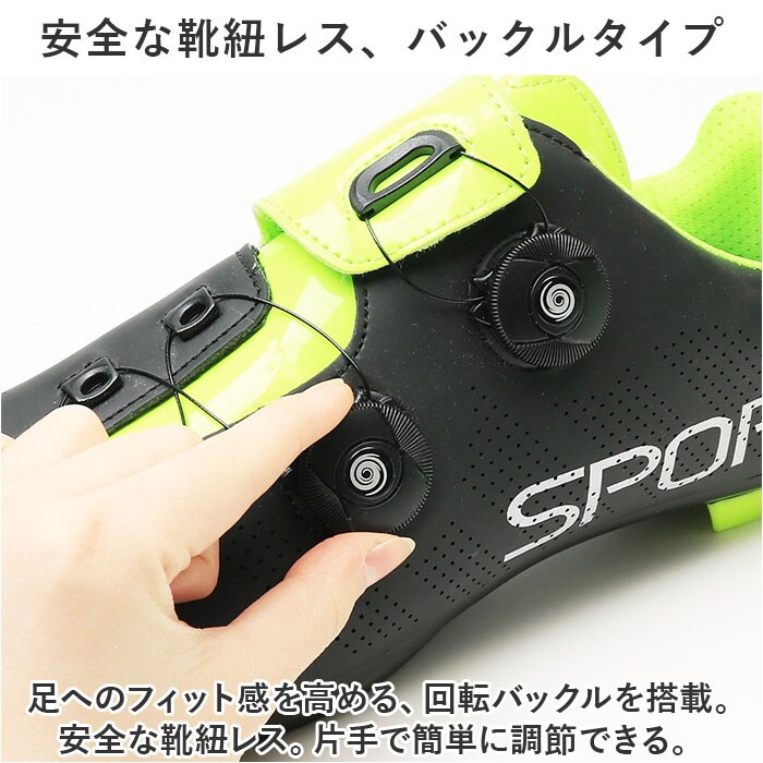 | 商品説明 | かっちりナイロン底でハイパフォーマンスを実現!サイクルシューズが登場。【耐久性のあるナイロンソール】耐摩耗性に優れたナイロンソール。ペダルをしっかりキャッチしてハイパフォーマンスを実現。【安全な靴紐レス、バックルタイプ】足へのフィット感を高める、回転バックルを搭載。安全な靴紐レス。片手で簡単に調節できる。【パンチング加工でムレ知らず】複数のパンチング加工を施し、通気性に配慮。汗をかくシーンでも靴内を快適にキープ。【ダイレクト感を実現した一体構造】ペダリング時の足裏へのダイレクト感を実現した、ソールとアッパーの一体構造がポイント。【ユニセックスで使えるシューズ】サイズを幅広くご用意。ユニセックスで使えるので、家族や友達とおそろいにもできる☆ |