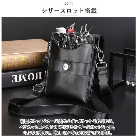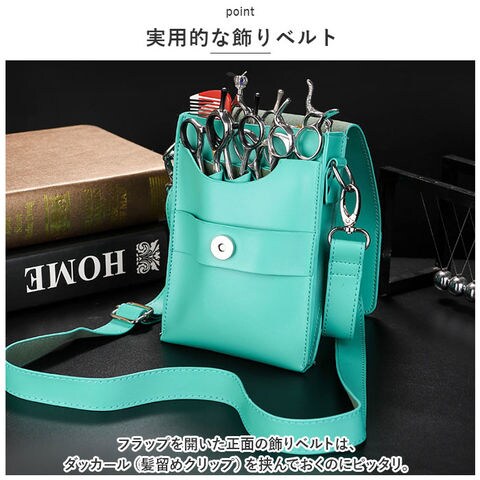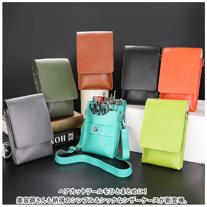 | 商品説明 | ヘアカットツールをひとまとめに!美容師さんも納得のシンプル&シックなシザーケースが新登場。【シンプル&カラフル】カラフルなフェイクレザーのボディに同色のストラップベルトを合わせた、シンプルながらもファッションのアクセントになるデザイン。【楽ちんマグネットフラップ】ケースの開口部にはワンタッチで開くマグネット式フラップを採用。サロンツールの飛び出しを防いで、出し入れもスムーズ。【シザースロット搭載】前面ポケットとケース奥のメインポケットそれぞれに、ヘアカット用ハサミ4丁が収まるシザースロットを配置。小ぶりに見えて、計8丁のハサミが収納できる造り。【多目的に使えるメインポケット】メインポケット内側のシザースロットは、スナップボタンで取り外せるセパレートタイプ。ブラシやコーム、ミニトリマーなど様々なツールをマルチに収納可能。【実用的な飾りベルト】フラップを開いた正面の飾りベルトは、ダッカール(髪留めクリップ)を挟んでおくのにピッタリ。【お手入れがしやすい造り】ケース底面のスナップボタンを開放すれば、ケース内部の髪の毛やホコリもサッとOFF!こまめにお掃除ができて、いつでも清潔。【スタイル自在の2WAY仕様】取り外しのできるストラップベルトで、肩掛けスタイル・ウエストポーチにもなる2WAY仕様。【様々なシーンで大活躍】美容室のスタイリストさんにはもちろん、ペットサロンのトリマーさん、フローリストの方のツールバッグにもオススメ。 |