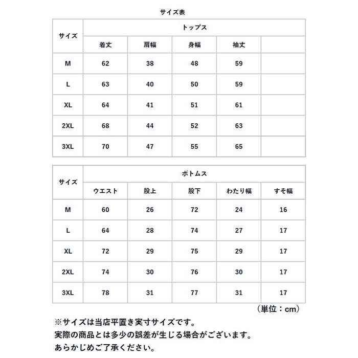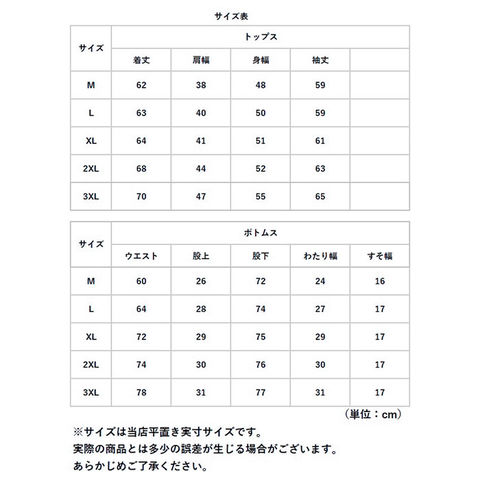 | 重量 | 約567g(※XLサイズ・上下セットの商品の重量です。) |