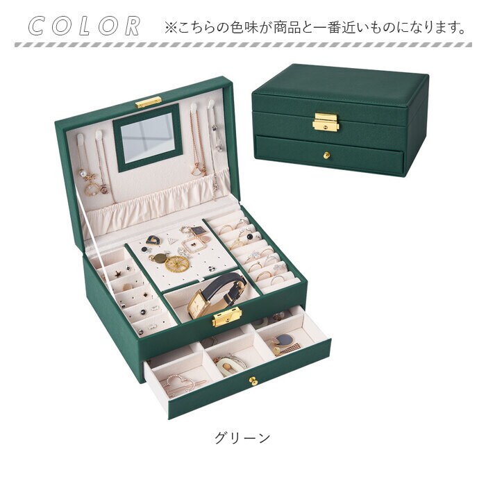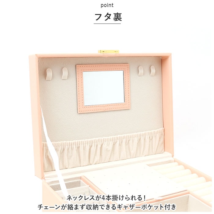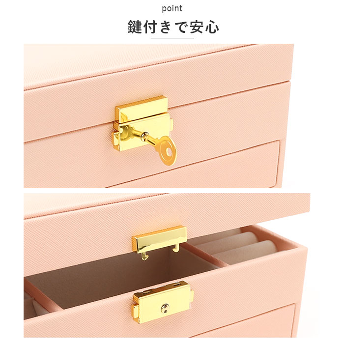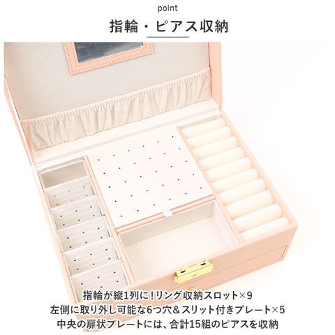 | 商品説明 | お気に入りのアクセサリーがスッキリ収納できる!鍵付き大容量ジュエリーボックスが新登場。【見やすくたっぷり収納できる2段式!】なくしがちなアクセサリーをまとめて整理整頓◎【ワンタッチ開閉】開口金具の両サイドを内側に押してオープン!戻す時は、カチッと鳴るまでフタを閉じるだけ。【鍵付きで安心】大切なアクセサリーを保管するのに最適◎【上品なデザイン】装飾を抑えたシンプルなデザイン。ゴールドの金具がアクセント。【傷付きを防止】ベロアのような素材の内貼り仕様。【フタ裏】ネックレスが4本掛けられる!チェーンが絡まず収納できるギャザーポケット付き。鏡も付いているのでアクセサリーの試着やお化粧直しもできちゃう!・《上段》【リング】指輪が縦1列に!リング収納スロット×9。【ピアス】左側に取り外し可能な6つ穴&スリット付きプレート×5。中央の扉状プレートには、合計15組のピアスを収納。【イヤリング】プレート扉下部に9つに仕切られたボックスを装備。【腕時計】いつも身に着ける腕時計を1本収納可能。・《下段》【ブローチなどの大ぶりアクセサリー】9つに仕切られたボックス。引き出し式でサッと取り出しOK。 |
