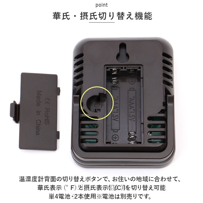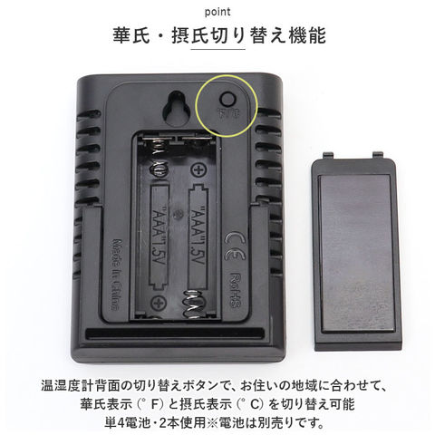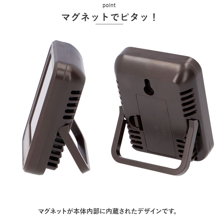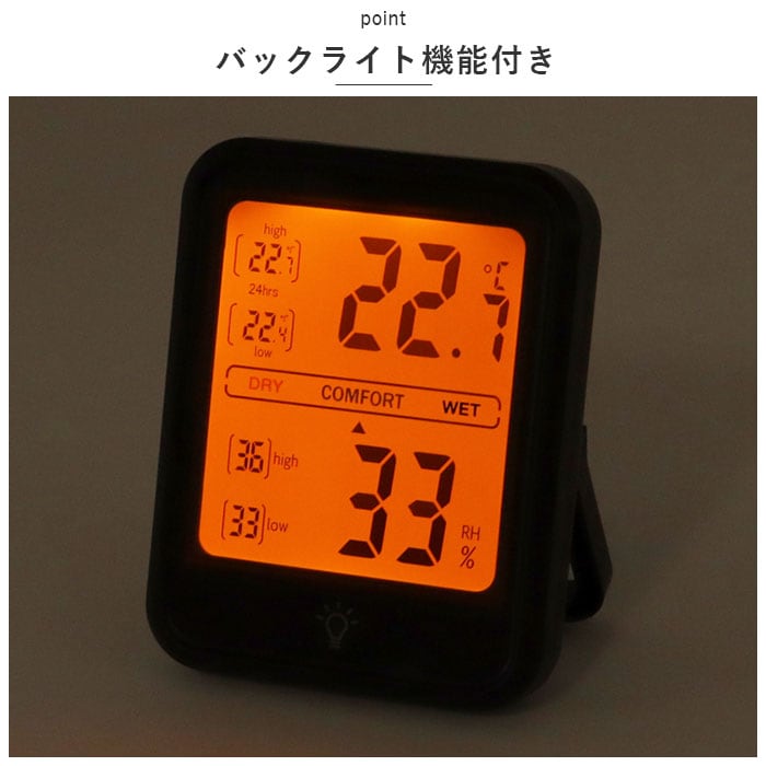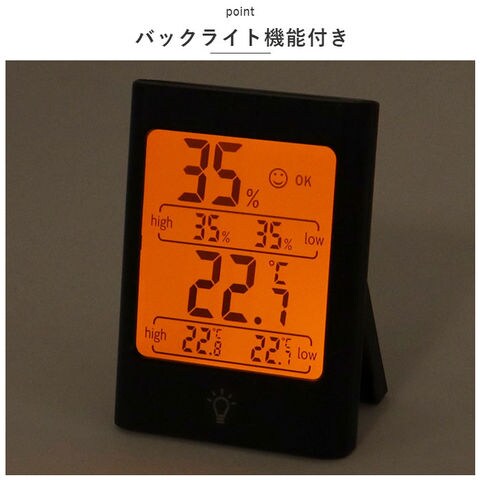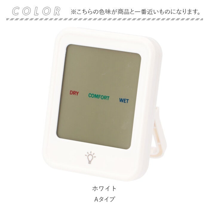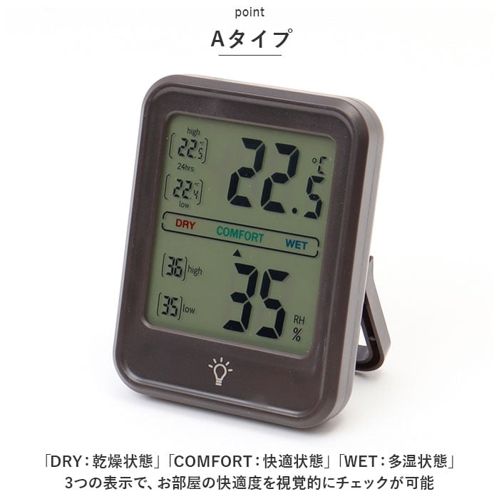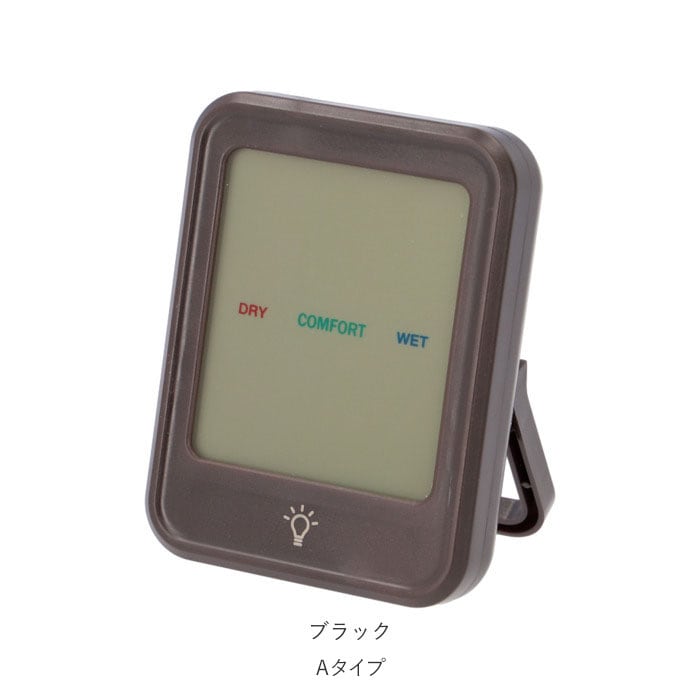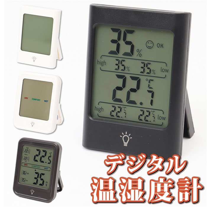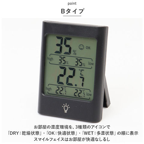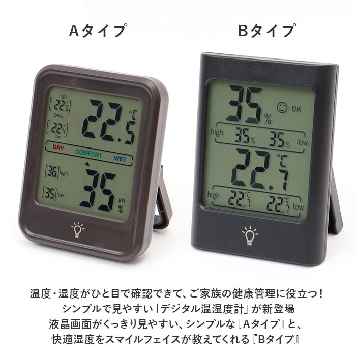 | 商品説明 | 温度・湿度がひと目で確認できて、ご家族の健康管理に役立つ!シンプルで見やすい「デジタル温湿度計」が新登場。【見やすさで選べる2タイプ】液晶画面がくっきり見やすい、シンプルな『Aタイプ』と、快適湿度をスマイルフェイスが教えてくれる『Bタイプ』の2種類からチョイス可能。【シンプルで見やすい液晶表示】『Aタイプ』離れたところからでも見やすい大きめの文字で、上段に室内の「温度」、下段に「湿度」を表示。『Bタイプ』コンパクトな液晶画面に、上段に「湿度」、下段に「温度」を表示したシンプルなレイアウト。【快適度をひと目で確認!】『Aタイプ』・「DRY:乾燥状態」・「COMFORT:快適状態」・「WET:多湿状態」の3つの表示で、お部屋の快適度を視覚的にチェックが可能。『Bタイプ』お部屋の湿度環境を、3種類のアイコンで「DRY:乾燥状態」・「OK:快適状態」・「WET:多湿状態」の順に表示。スマイルフェイスはお部屋が快適なしるし。【24時間変化もチェック】『Aタイプ』『Bタイプ』共通過去24時間の最高温度・湿度、最低温度・湿度を合わせて表示することで、急な温度・湿度の変化も見逃さない!エアコンの温度コントロールの参考になって便利。【バックライト機能付き】『Aタイプ』『Bタイプ』共通液晶画面下の電球マークに指先が触れるだけで、液晶画面がオレンジ色に点灯。お休み前の照明を落としたお部屋でも温湿度チェックが楽ちん。【華氏・摂氏切り替え機能】『Aタイプ』『Bタイプ』共通温湿度計背面の切り替えボタンで、お住いの地域に合わせて、華氏表示(°F)と摂氏表示(°C)を切り替え可能。【置き・掛けどちらもOK!】『Aタイプ』『Bタイプ』共通スタンドを広げてテーブルやキャビネットに置いたり、背面のフック穴で壁掛けにもできる2WAY仕様。【マグネットでピタッ!】温湿度計背面のマグネットで、冷蔵庫の扉やキッチンのキャビネットにピタッと貼りつけて収納できるのがポイント!(※Aタイプのみ、マグネットが本体内部に内蔵されたデザインです。)【快適な室内環境づくりに】寒さや乾燥が気になる時期の風邪予防や、真夏の熱中症対策など、ご家族の健康管理にオススメの便利アイテム。単4電池・2本使用。(※電池は別売りです。)電池は別売りです。) |