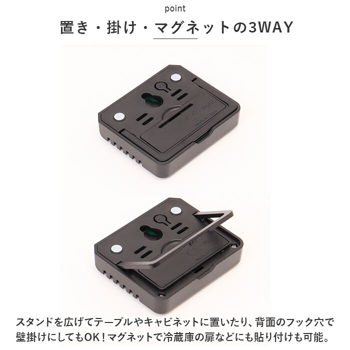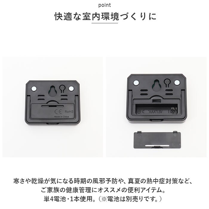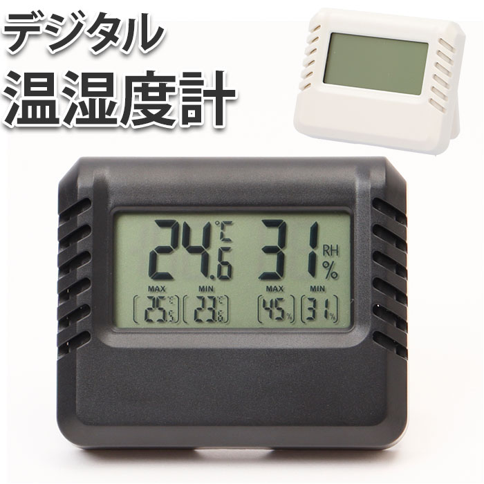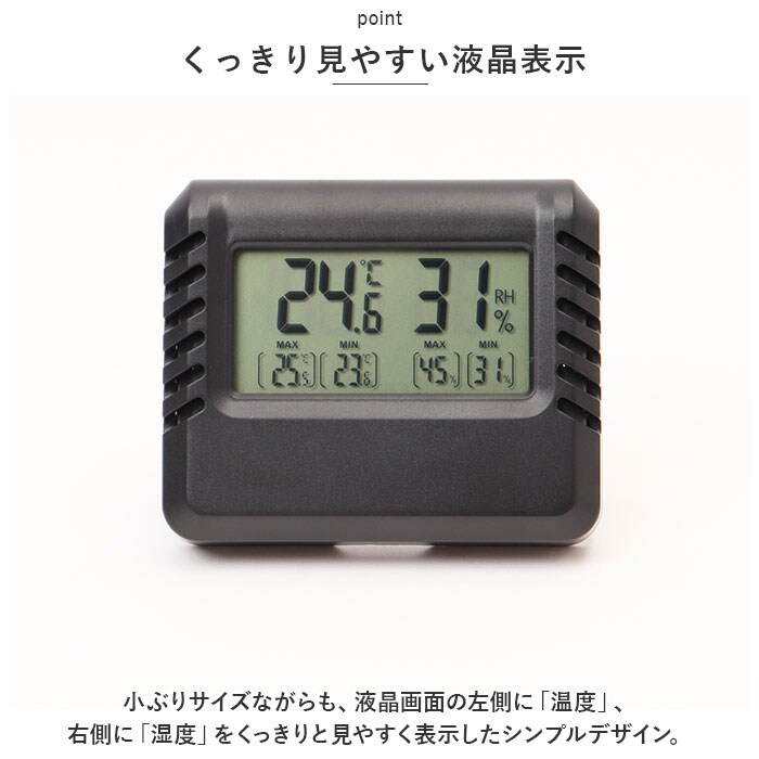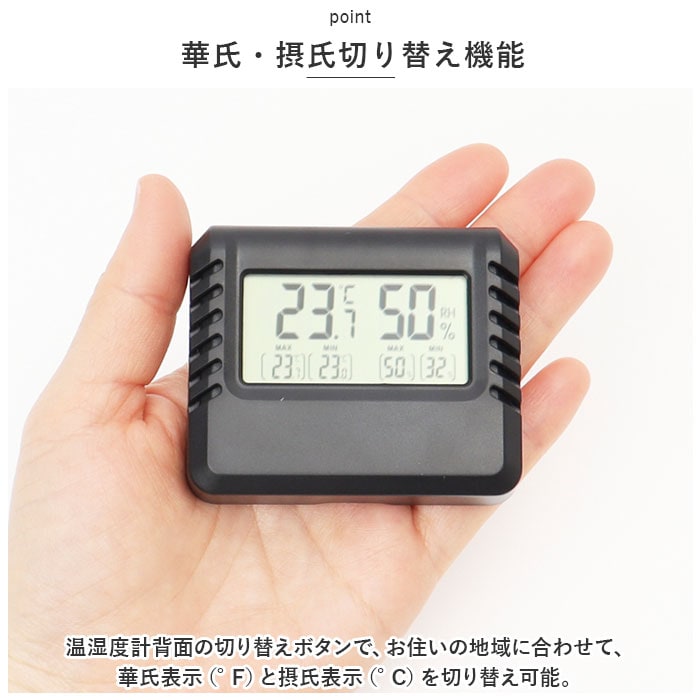 | 商品説明 | コンパクトボディに温度・湿度を見やすく表示!ご家族の健康管理に役立つ「デジタル温湿度計」が新登場。【くっきり見やすい液晶表示】小ぶりサイズながらも、液晶画面の左側に「温度」、右側に「湿度」をくっきりと見やすく表示したシンプルデザイン。【24時間変化もチェック】過去24時間の最高温度・湿度、最低温度・湿度を合わせて表示することで、急な温度・湿度の変化も見逃さない!エアコンの温度コントロールの参考になって便利。【華氏・摂氏切り替え機能】温湿度計背面の切り替えボタンで、お住いの地域に合わせて、華氏表示(°F)と摂氏表示(°C)を切り替え可能。【置き・掛け・マグネットの3WAY】スタンドを広げてテーブルやキャビネットに置いたり、背面のフック穴で壁掛けにしてもOK!マグネットで冷蔵庫の扉などにも貼り付けも可能。【快適な室内環境づくりに】寒さや乾燥が気になる時期の風邪予防や、真夏の熱中症対策など、ご家族の健康管理にオススメの便利アイテム。単4電池・1本使用。(※電池は別売りです。) |