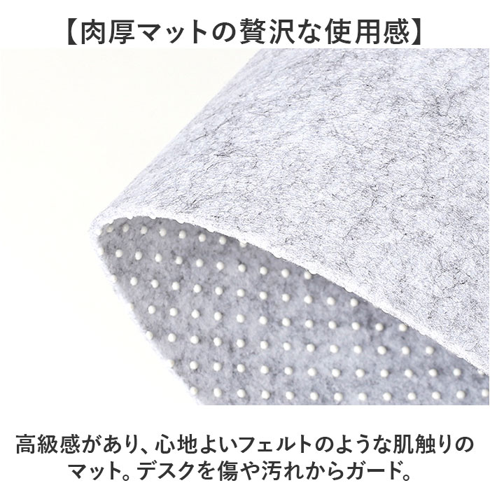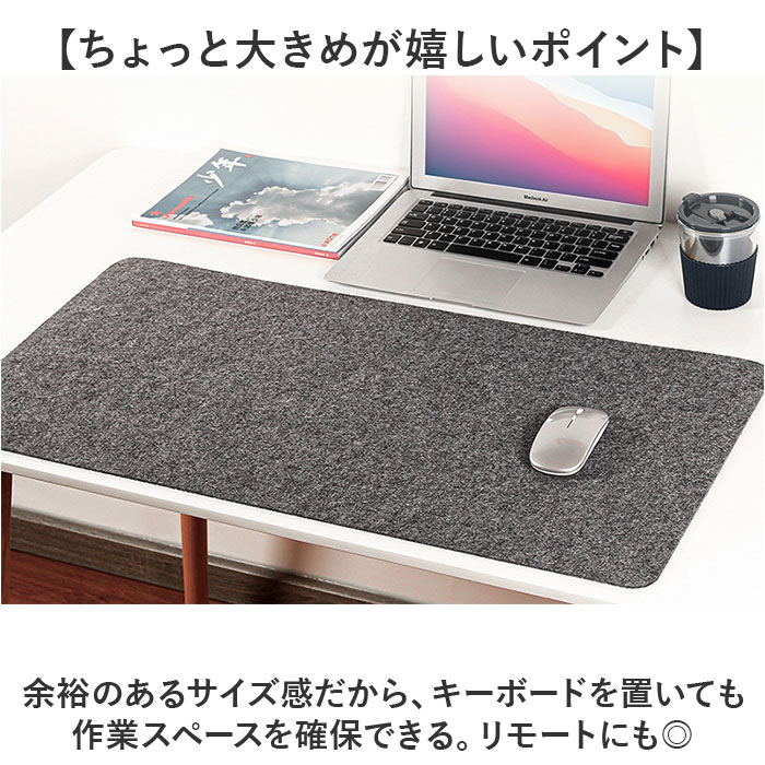 | 商品説明 | 【デスク周りをシック&おしゃれに♪】肉厚な生地で傷や汚れを防止◎「デスクマット」が登場。【デスク周りをスッキリした印象に!】ゴチャつきがちなデスク周りが、敷くだけで落ち着きのあるシックな雰囲気にチェンジ☆【肉厚マットの贅沢な使用感】高級感があり、心地よいフェルトのような肌触りのマット。デスクを傷や汚れからガード。【滑りにくいからストレスフリー◎】裏面の全体に滑り止め加工をON。ズレにくいから、仕事や作業もノンストレスで集中できる。【どこでも使えるシンプルデザイン】オフィスや書斎、リビングなどでも使える、空間に馴染むデザイン。汚れが目立たないカラー。【勉強机にも使える】お仕事だけでなく、学習机に置くのもGOOD。お子様から大人まで使えるアイテム。【ちょっと大きめが嬉しいポイント】余裕のあるサイズ感だから、キーボードを置いても作業スペースを確保できる。リモートにも◎ |