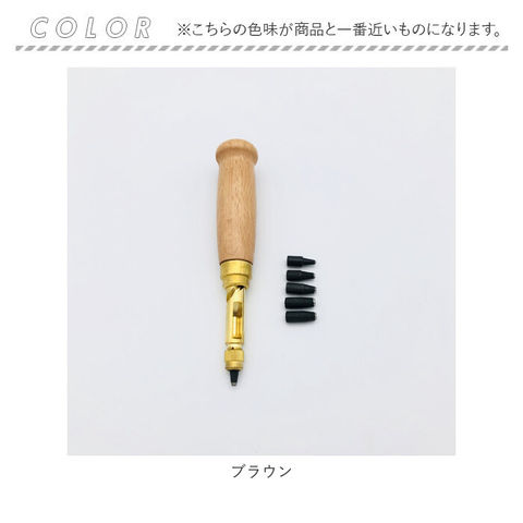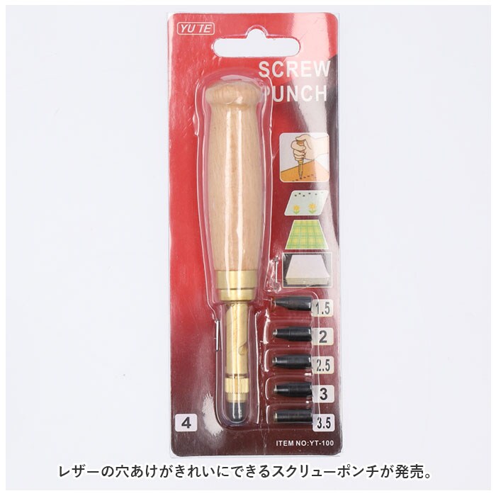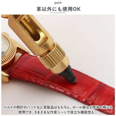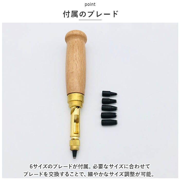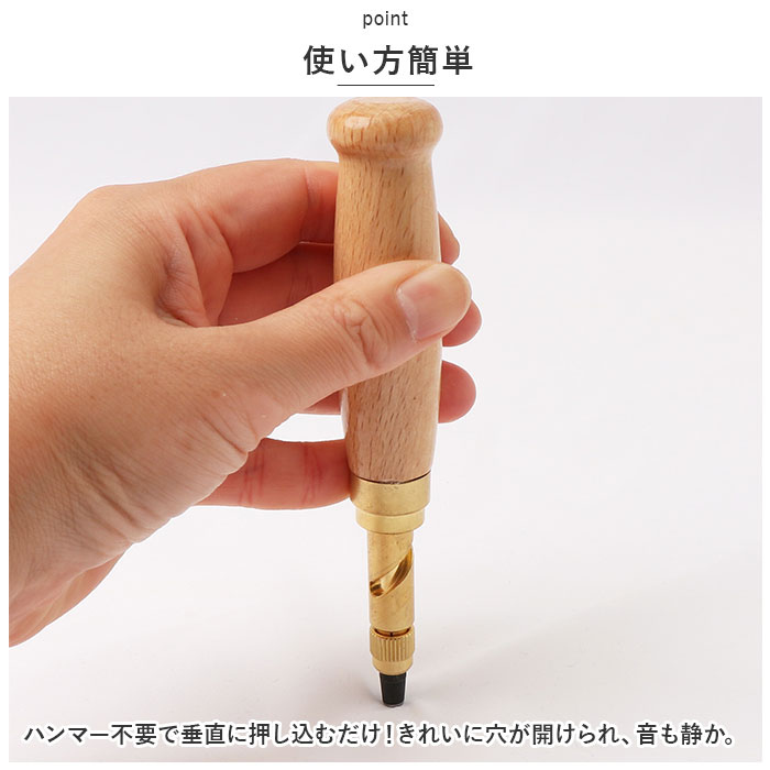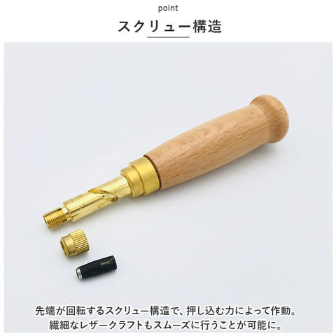 | 商品説明 | レザーの穴あけがきれいにできるスクリューポンチが発売。【スクリュー構造】先端が回転するスクリュー構造で、押し込む力によって作動。繊細なレザークラフトもスムーズに行うことが可能に。【使い方簡単】ハンマー不要で垂直に押し込むだけ!きれいに穴が開けられ、音も静か。【革以外にも使用OK】ベルトや時計のバンドなど革製品はもちろん、ボール紙など厚手の紙にも使用でき、さまざまな作業シーンで役立ち機能性も◎【付属のブレード】6サイズのブレードが付属。必要なサイズに合わせてブレードを交換することで、細やかなサイズ調整が可能。 |