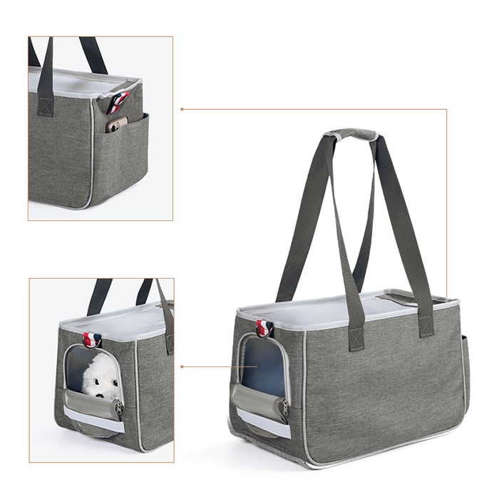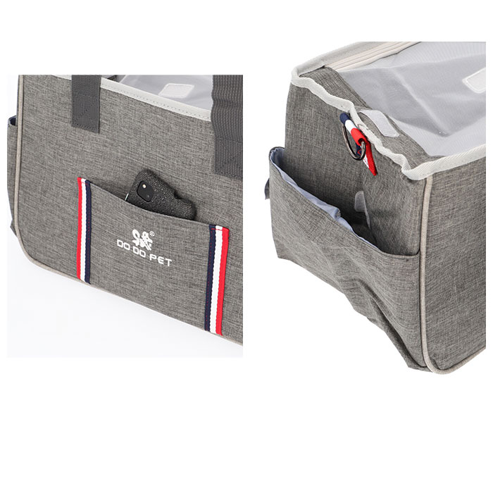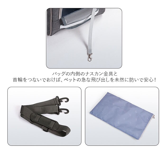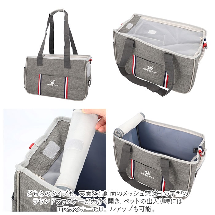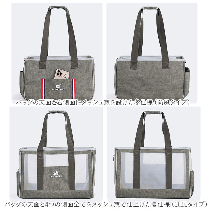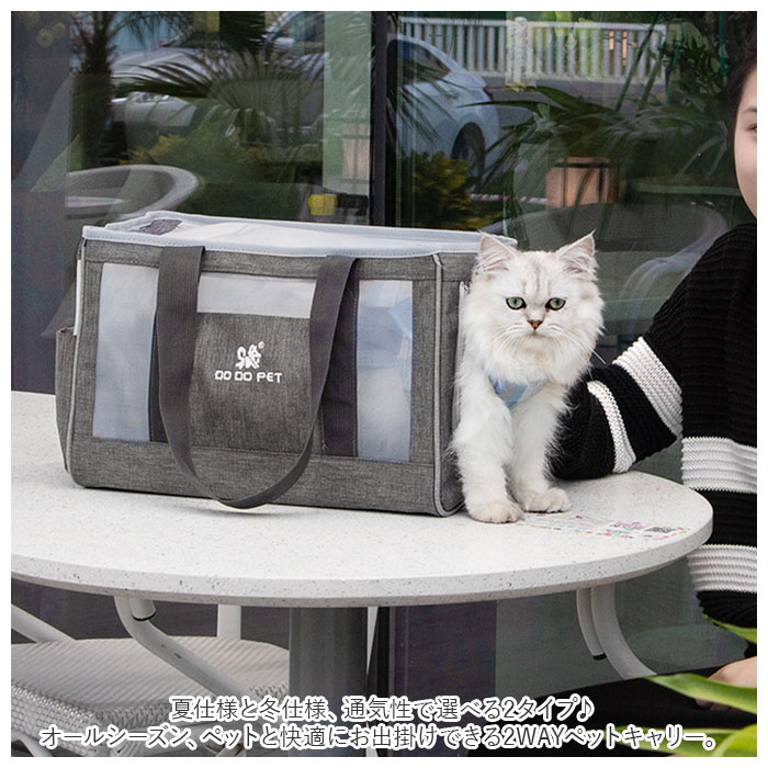 | 商品説明 | 夏仕様と冬仕様、通気性で選べる2タイプ♪オールシーズン、ペットと快適にお出掛けできる2WAYペットキャリー。バッグの天面と右側面にメッシュ窓を設けた冬仕様(防風タイプ)と、バッグの天面と4つの側面全てをメッシュ窓で仕上げた夏仕様(通風タイプ)の選べる2タイプ!どちらのタイプも、天面と右側面のメッシュ窓はコの字型のラウンドファスナーが大きく開き、ペットの出入り時には面ファスナーでロールアップも可能。バッグの内側のナスカン金具と首輪をつないでおけば、ペットの急な飛び出しを未然に防いで安心!ペットが安定した姿勢をキープしたまま持ち運べる、スポンジクッション入りの底板が付属。カバーのみ取り外してお洗濯することができるのも嬉しいポイント。手持ちのペットバッグとしてはもちろん、長さ調節のできるショルダーベルトで肩掛けにもできる2WAY仕様。バッグの前面&左側面には、ウェットティッシュやペットシーツ、ペットのおやつを入れておくのに便利なポケット付き。ネコちゃんや小型のワンちゃんも、リラックスしてお出掛けできるゆったりサイズ。(※推奨体重・・・防風タイプは、猫約8.0kg、犬約6.0kgまで。通風タイプは、猫約7.0kg、犬約6.0kgまで対応。)オシャレなボックストート型のデザインで、動物病院への通院や、ペットと一緒の旅行・お出掛けに最適。 |