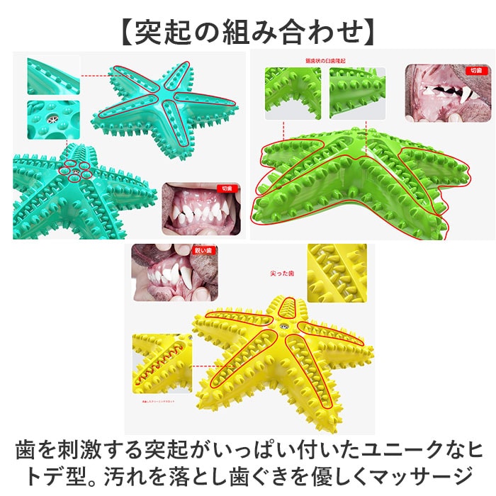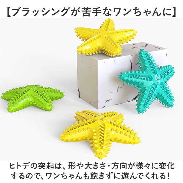| 商品説明 | 【ワンちゃんの歯の健康をキープ!】ヒトデ型のカミカミおもちゃで歯を健康に!「犬 歯磨き おもちゃ」が登場。【ワンちゃんが噛んでも安全な素材】適度な柔らかさと耐久性に優れたTPR樹脂素材でできたワンちゃん用のおもちゃ。【突起の組み合わせ】歯を刺激する突起がいっぱい付いたユニークなヒトデ型。汚れを落とし歯ぐきを優しくマッサージ【ブラッシングが苦手なワンちゃんに】ヒトデの突起は、形や大きさ・方向が様々に変化するので、ワンちゃんも飽きずに遊んでくれる!【歯磨きペーストでさらに健康!】溝部分にワンちゃん用の歯磨きペーストを付ければ、さらに歯をキレイにすることも◎【キュキュッと可愛い音が鳴る♪】真ん中には音が鳴って楽しい「鳴き笛」付き。「キュキュッ」と可愛いらしい音がするよ♪【噛みキズ予防対策にも】ワンちゃんのストレスを和らげることで、ソファや家具などへの噛みキズ予防にも役立つ!【水遊びにもおすすめ!】水に浮く軽量素材だからプールでも楽しく遊べる♪汚れたら水洗いでき清潔感をキープ。 |