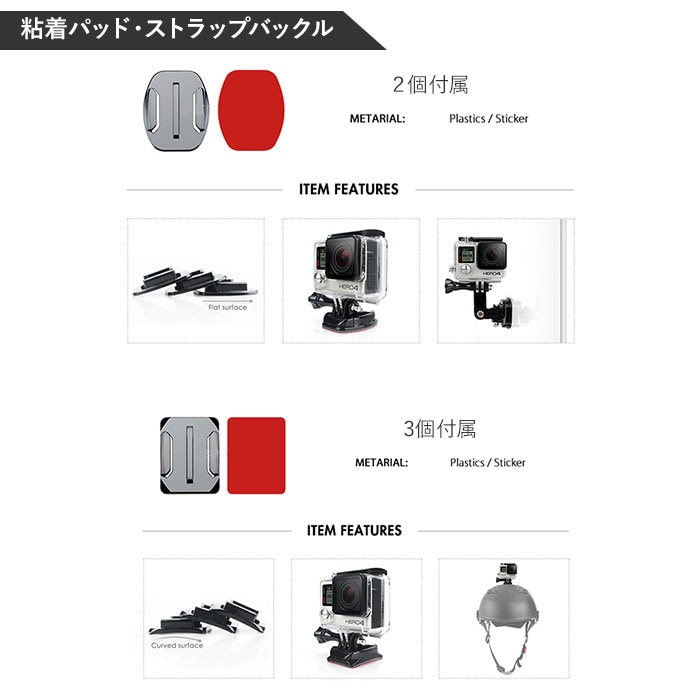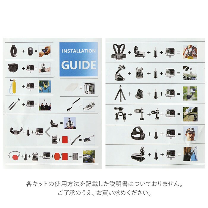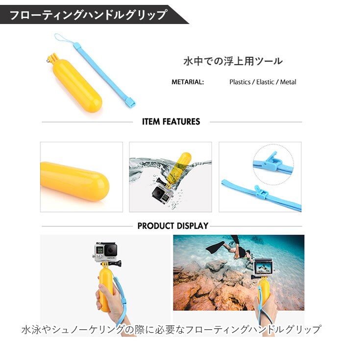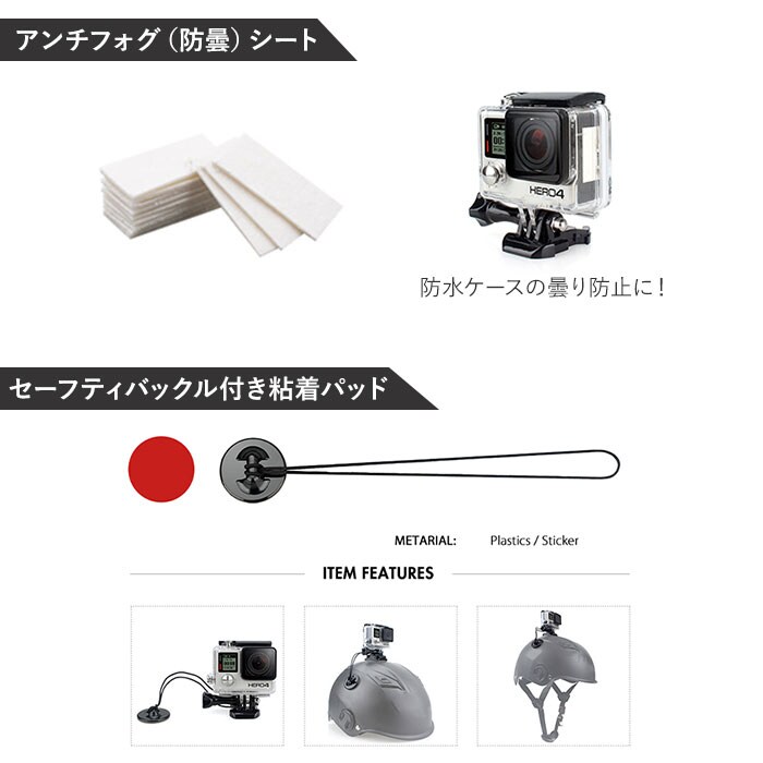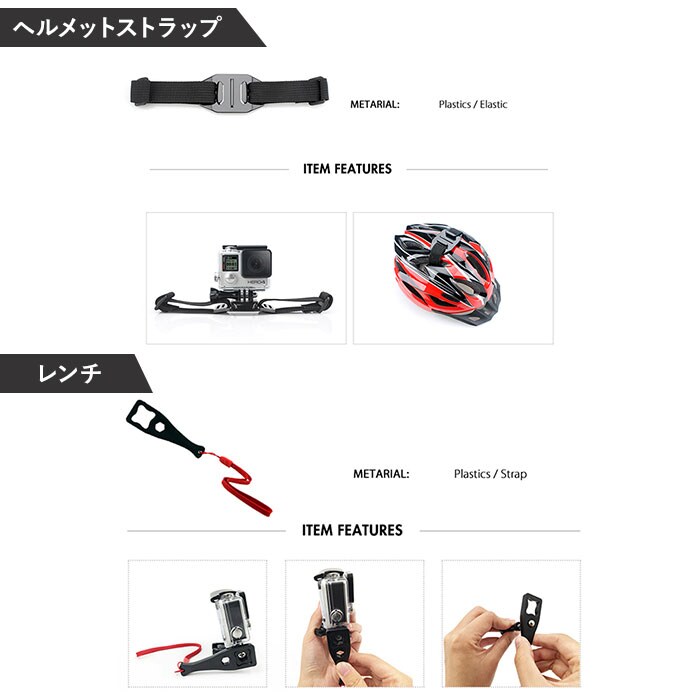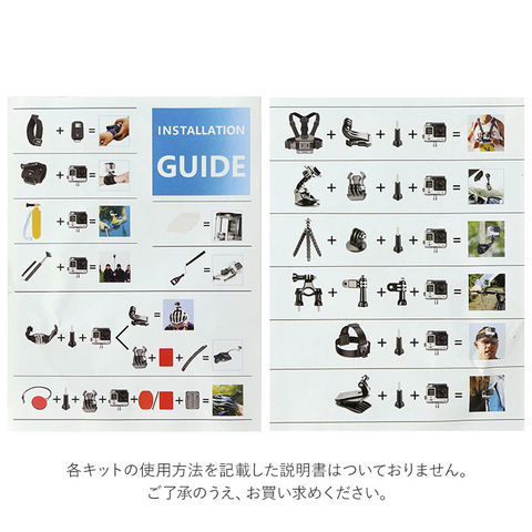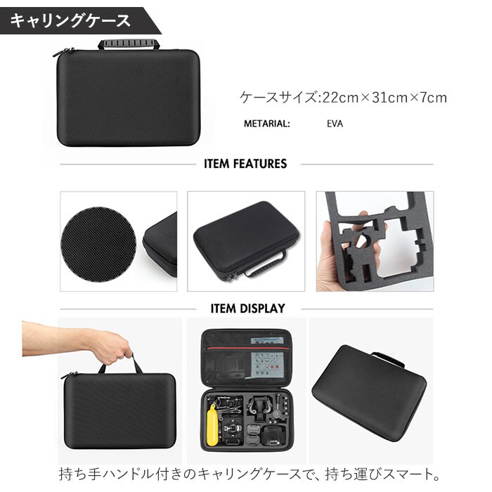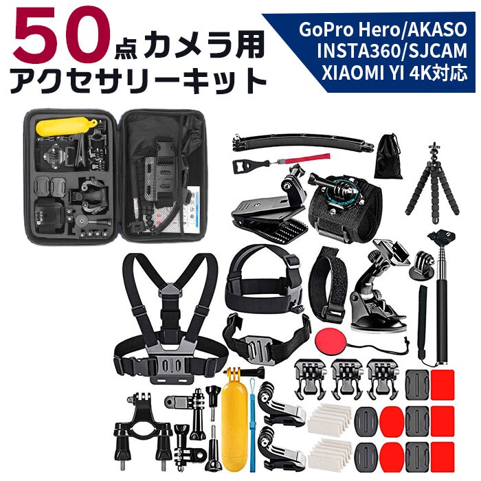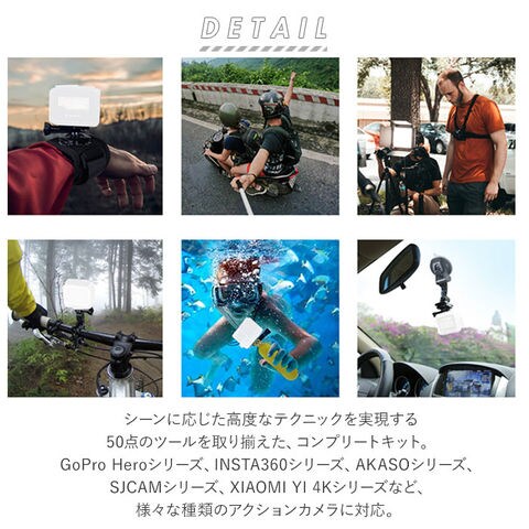 | 商品説明 | アウトドアやスポーツシーンでの臨場感ある動画撮影に欠かせない「アクションカメラ」をより高度使いこなす!「50in1 アクセサリーキット」が新登場。シーンに応じた高度なテクニックを実現する50点のツールを取り揃えた、コンプリートキット。サーフィンやスケートボードのようなアクティビティー中の視界を撮影するための各種ストラップや、水泳やシュノーケリングの際に必要なフローティングハンドルグリップなど、プロ顔負けのツールをラインナップ。多種多様なツールをスッキリひとまとめに整理できるキャリングケースが付属。GoPro Heroシリーズ、INSTA360シリーズ、AKASOシリーズ、SJCAMシリーズ、XIAOMI YI 4Kシリーズなど、様々な種類のアクションカメラに対応。持ち手ハンドル付きのキャリングケースで、持ち運びスマート。【パッケージ内容】1.キャリングケース×12.チェストストラップ×13.ヘッドストラップ×14.リストストラップ×15.フローティングハンドルグリップ×1(水中での浮上用ツール)6.吸盤×1(フロントガラスなどへの吸着用)7.クランプ×1(ジャケット等への取り付け用)8.自撮り棒×19.ミニ三脚×110.リストストラップ(リモート用)×111.自転車ハンドルバーマウント×112.調整可能回転アーム(パーツ1)×1(ハンドルバーマウント用)13.調整可能回転アーム(パーツ2)×1(ハンドルバーマウント用)14.ツマミネジ×4(各種マウント取り付け用ネジ)15.表面J字フックバックル×2(チェストストラップ装着用)16.曲面用カーブマウント×3(フロントガラス、ヘルメット等への装着用)17.ヘルメットストラップ×118.ヘルメット延長アーム×119.レンチ×120.フラットマウント(ミニ三脚取り付け用)×121.アンチフォグ(防曇)シート×1222.粘着パッド×6(※セーフティバックル付き粘着パッド×1を含む)23.ストラップバックル×524.小物収納用巾着ポーチ×1 |