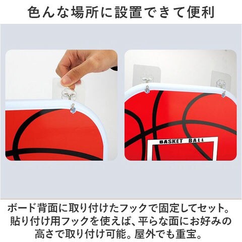 | 商品説明 | 自宅でも手軽にシュート練習できる、バスケットゴールセットが登場。【どなたでも簡単セッティング】付属のドライバーやレンチを使って、簡単組み立て!あっという間にミニゴールの完成☆【色んな場所に設置できて便利】ボード背面に取り付けたフックで固定してセット。貼り付け用フックを使えば、平らな面にお好みの高さで取り付け可能。屋外でも重宝。【お子さまも持ちやすいミニボール】付属の空気入れで膨らますボールは、柔らかな素材&ミニサイズ。小さなお子さまも持ちやすく、当たってもケガの心配が不要。【家族みんなで楽しくストレス発散】天候に左右されず、子供部屋でシュート練習!家族が集まるリビングに設置すれば、みんなで遊べてストレス解消に◎ |