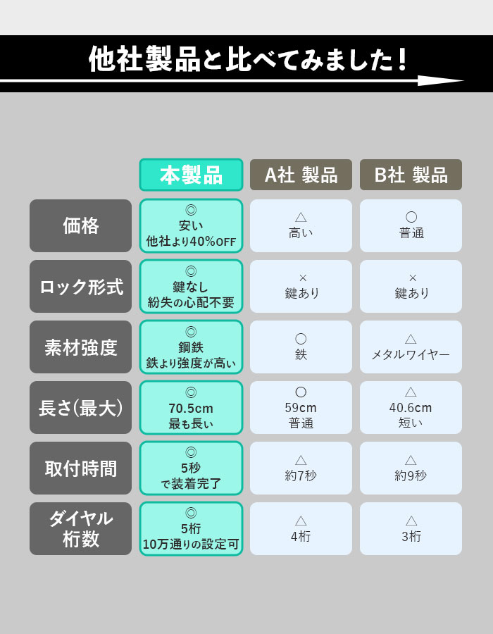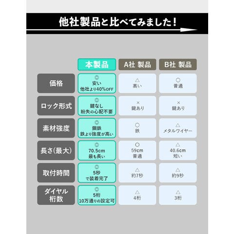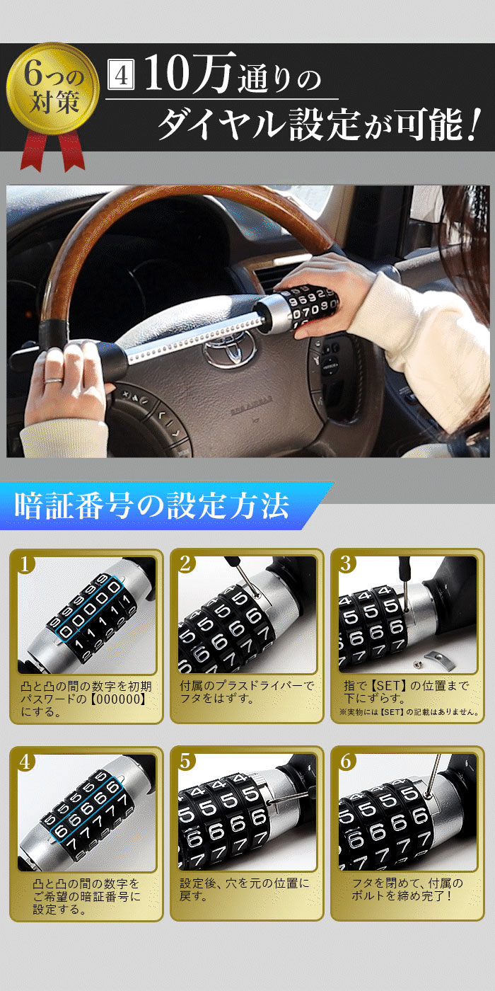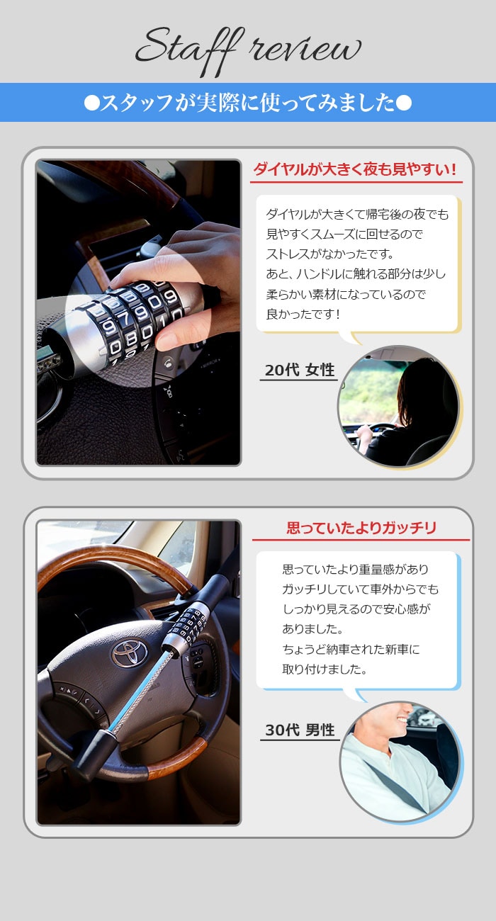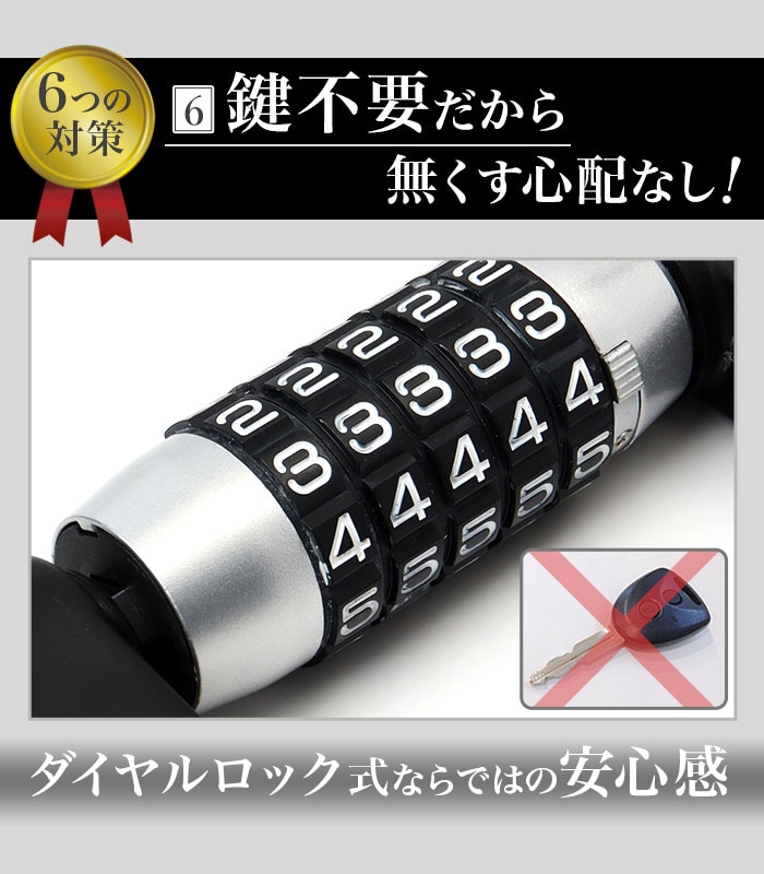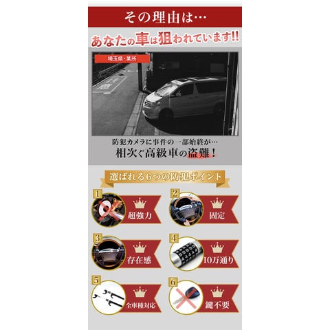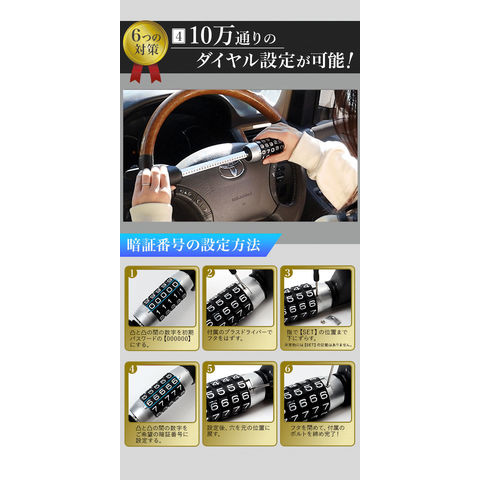 | 商品説明 | 【愛車の盗難防止対策に!】ハンドルをがっちりロックして盗難防止!「ハンドルロック」が新登場。【5ケタのダイヤル式ロック】お好きな数字の組み合わせでロック設定が可能。カギが不要なので、紛失の心配もなし!【切断に強い特殊金属】切断に強い頑丈でタフな特殊金属を採用!車の外からでも見える抜群の存在感で盗難抑止効果◎【取り付けも簡単】ハンドルに装着したら、ダイヤルを回すだけ!ハンドルの位置や形状に合わせて様々な取り付け方が可能。【様々な車種に取り付けOK】ハンドルの大きさに合わせて長さ調節できるので、軽自動車からSUV車まで幅広い車種に対応!(※)サイズをご確認ください。 |