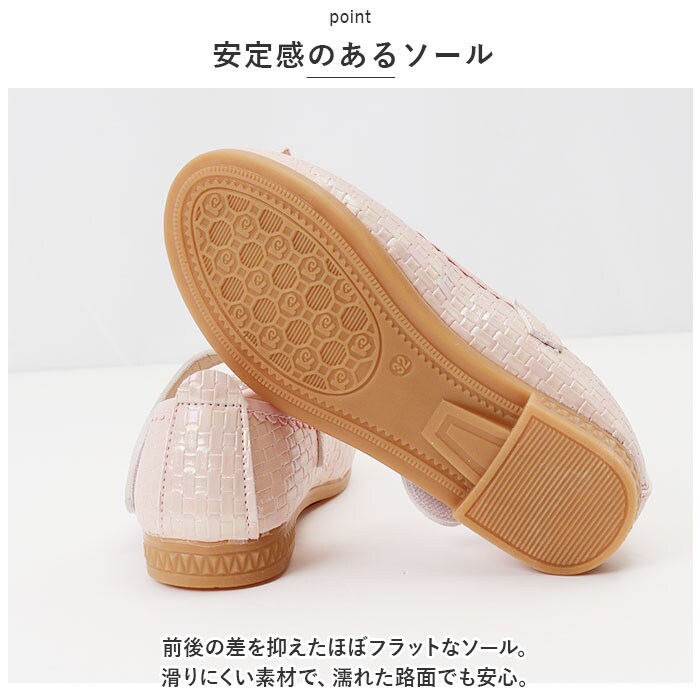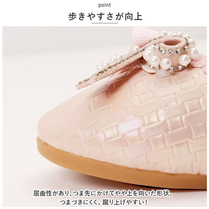 | 商品説明 | 足元もおしゃれに♪キュートなフォーマルシューズが登場。【可愛さアップのポイント】光沢のあるPU素材を使用。つま先部分に配置された、立体的なリボンが印象的♪イミテーションパールやキラッと光るストーンもプラス。【面ファスナーで着脱カンタン】ストラップは面ファスナー式なので、お子さま1人でも脱ぎ履きラクラク。【歩きやすさが向上】屈曲性があり、つま先にかけてやや上を向いた形状。つまづきにくく、蹴り上げやすい!【安定感のあるソール】前後の差を抑えたほぼフラットなソール。滑りにくい素材で、濡れた路面でも安心。【フォーマルシーンで】発表会やパーティーなどのお呼ばれシーンで大活躍! |