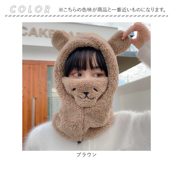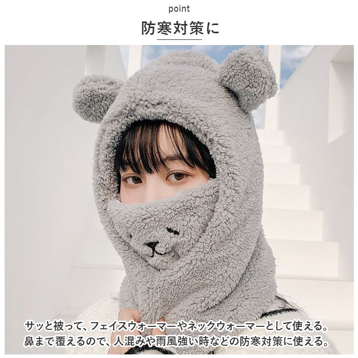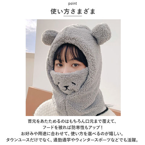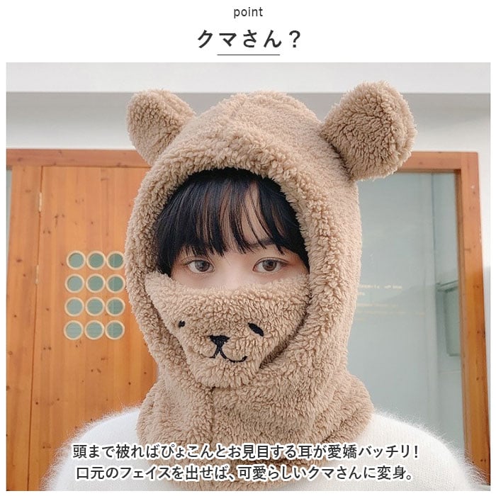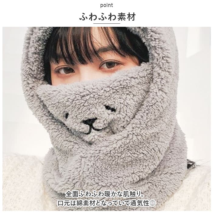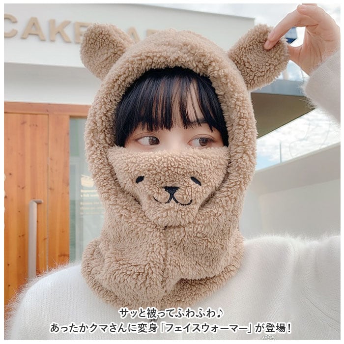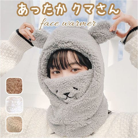 | 商品説明 | サッと被ってふわふわ♪あったかクマさんに変身「フェイスウォーマー」が登場!【防寒対策に】サッと被って、フェイスウォーマーやネックウォーマーとして使える。鼻まで覆えるので、人混みや雨風強い時などの防寒対策に使える。【ふわふわ素材】全面ふわふわ暖かな肌触り。口元は綿素材となっていて通気性◎【クマさん?】頭まで被ればぴょこんとお見目する耳が愛嬌バッチリ!口元のフェイスを出せば、可愛らしい〇〇に変身。【使い方さまざま】首元をあたためるのはもちろん口元まで覆えて、フードを被れば防寒性もアップ!お好みや用途に合わせて、使い方を選べるのが嬉しい。タウンユースだけでなく、通勤通学やウィンタースポーツなどでも活躍。【選べるカラー】学園祭やハロウィンなどでも気軽に使えて、友達と色違いで揃えるのも楽しい。お好きなカラーをチョイスして寒い冬も可愛いさUPで乗り切ろう♪ |