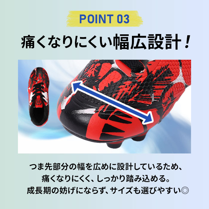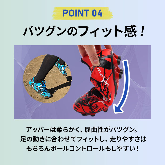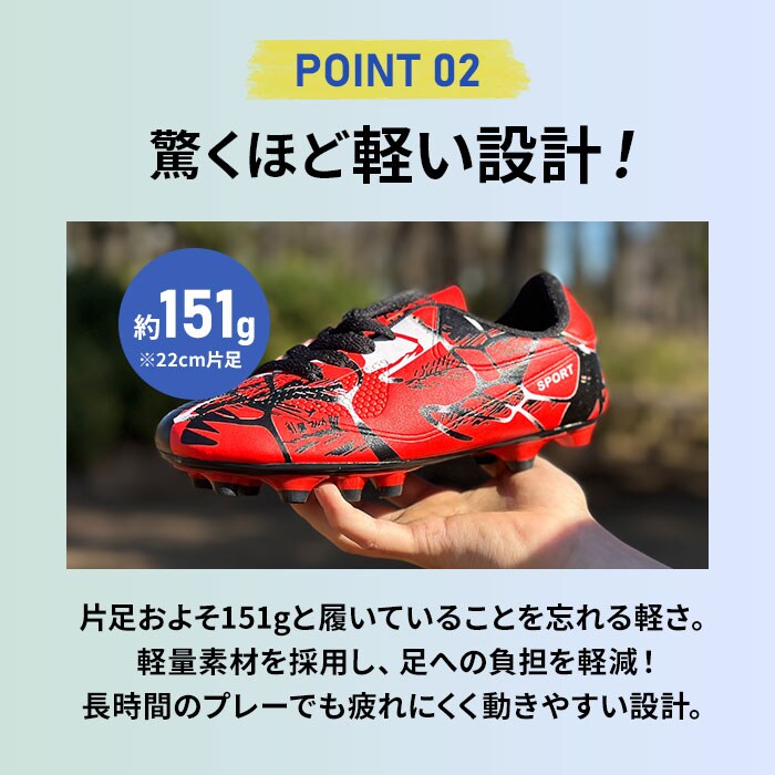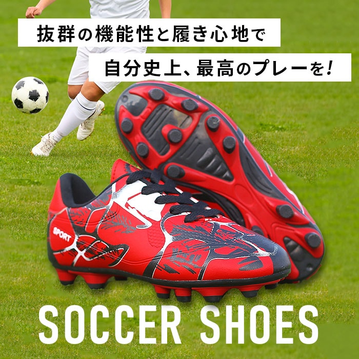 | 商品説明 | スポーティーなデザインが魅力の「サッカーシューズ 子供」か登場。【しなやかにフィット】スポーティーなデザインが魅力のアッパー部分は、動き回る足の形状にしなやかにフィット。運動時の様々な動きをサポート。【屈曲性】アッパー部分は柔らかく、屈曲性もあるので、走りやすく、シュートもスマートに。【2タイプ】スパイク付きと無しと2タイプをご用意。使用するグランドに合わせて選べば、パフォーマンスの向上にも★【幅広WIDE設計】つま先部分を幅広めになっているので、足指でしっかり踏み込むことが出来、さらに成長期の妨げ防止に。【軽量性】軽量素材を使用し、足への負担を軽減。長時間のプレーでも疲れにくい。動きやすさが魅力のサッカーシューズ。【快適な靴内】靴内は通気性のあるメッシュ生地を使用し、蒸れにくい構造。1日中履いても快適な靴内をキープ!インソールは取り外して洗えるのでいつも清潔。【豊富なカラー&サイズ】豊富なカラーを展開。親子や仲間と色違いで揃えてやる気up! |