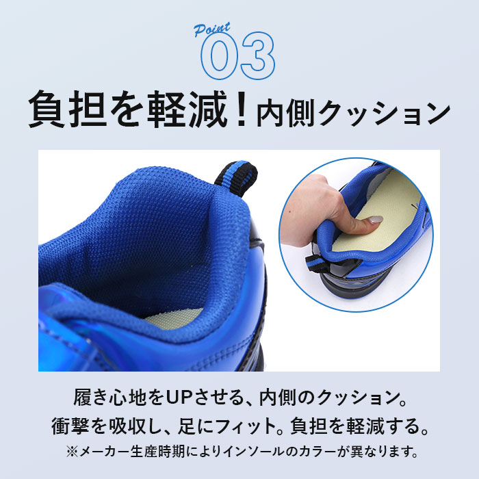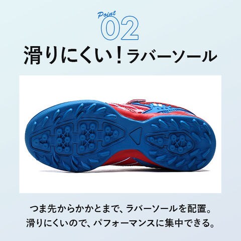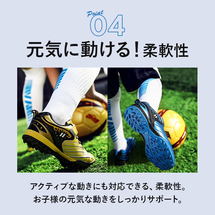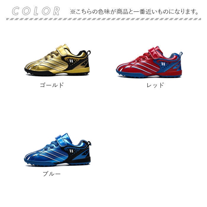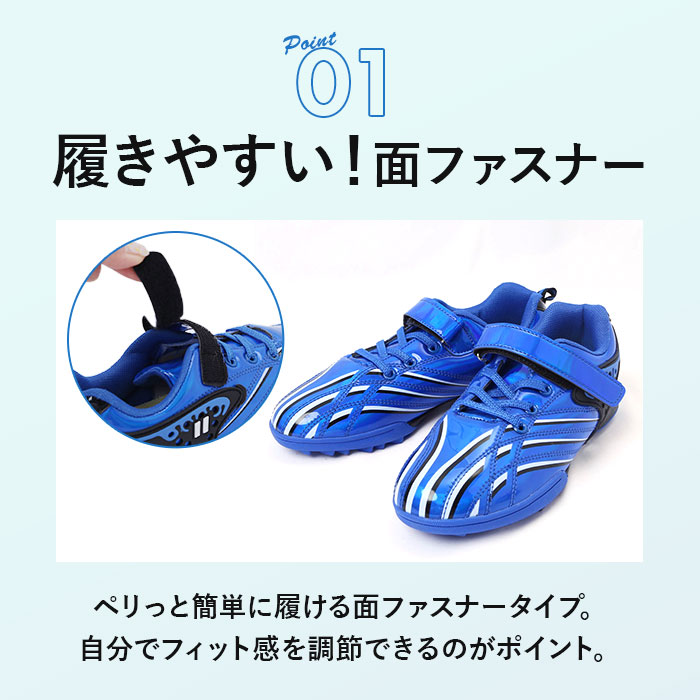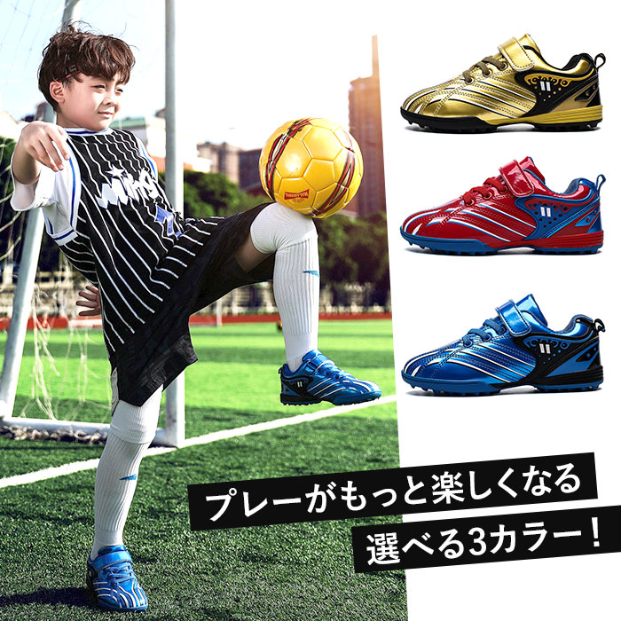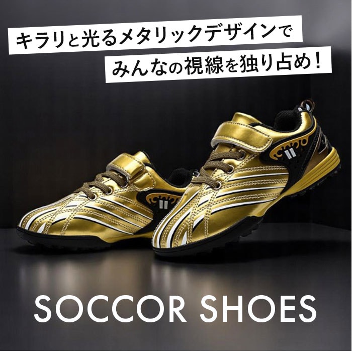 | 商品説明 | キラリとかっこいいメタリックデザイン☆面ファスナーで履きやすい、キッズサッカーシューズが登場。【履きやすい面ファスナータイプ】ペリっと簡単に履ける、面ファスナータイプ。自分でフィット感を調節できるのがポイント。【しっかりラバーで滑りにくい】つま先からかかとまで、ラバーソールを配置。滑りにくいので、パフォーマンスに集中できる。【メタリックデザインでやる気もUP】キラリと輝くかっこいいメタリックデザイン。履くだけでお子様のやる気もさらにUP!【クッション性で負担を軽減】履き心地をUPさせる、内側のクッション。衝撃を吸収し、足にフィット。負担を軽減する。【柔軟性があり動きやすい】アクティブな動きにも対応できる、柔軟性。お子様の元気な動きをしっかりサポート。【兄弟やお友達とお揃いにも☆】サイズ展開があるので、兄弟やお友達とお揃いにするのもオススメ☆ |