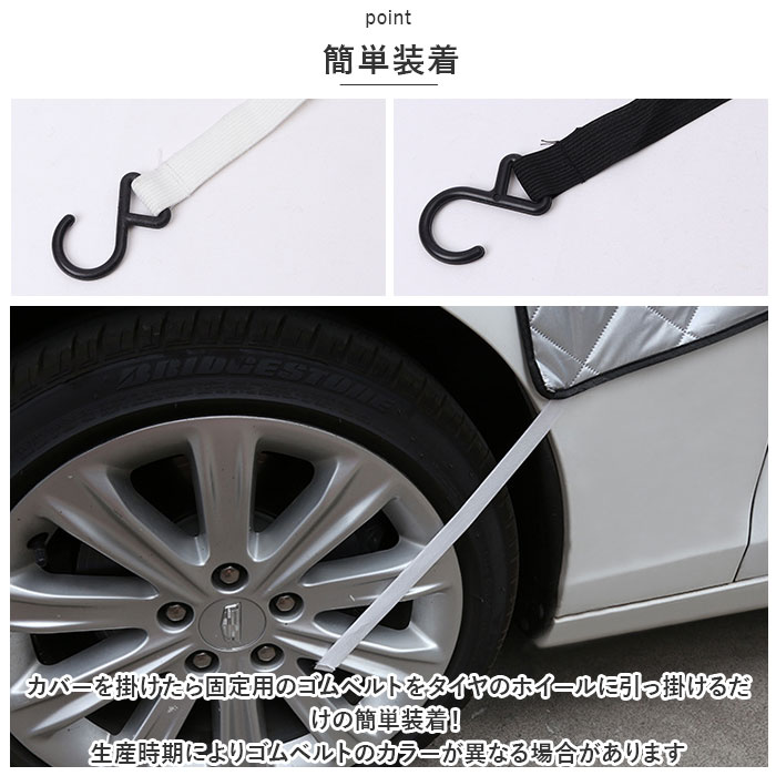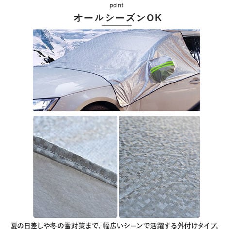 | 商品説明 | フロントガラスの保護に!車用フロントガラスカバーが新登場。【オールシーズンOK】夏の日差しや冬の雪対策まで、幅広いシーンで活躍する外付けタイプ。【撥水◎】カバーは撥水性と耐久性のあるアルミ素材の生地をを使用。【リフレクター付き】サイドミラー部分には視認性を高めてくれるリフレクター付き。(生産時期によりラインのカラーが異なる場合があります)【簡単装着】カバーを掛けたら固定用のゴムベルトをタイヤのホイールに引っ掛けるだけの簡単装着!(生産時期によりゴムベルトのカラーが異なる場合があります)【コンパクト収納】使わない時は折りたためるから、持ち運びはもちろん車内での保管もしやすい。 |