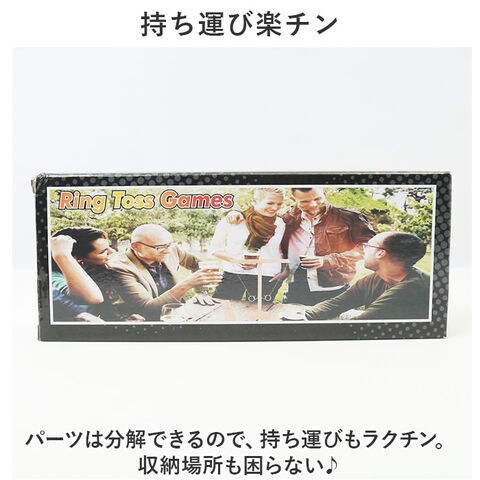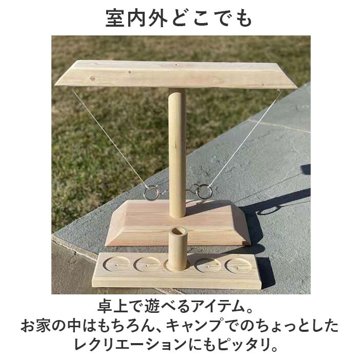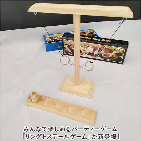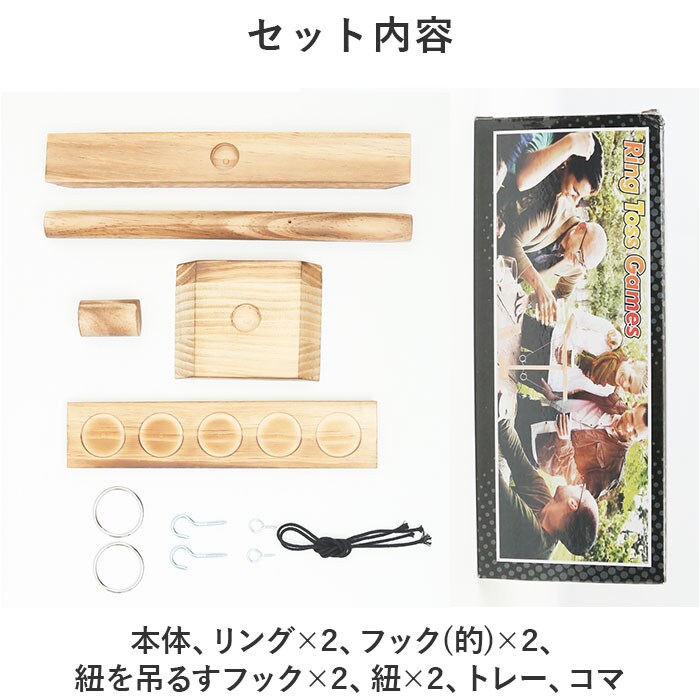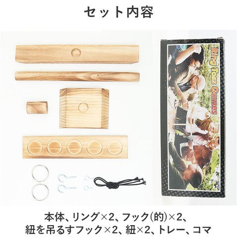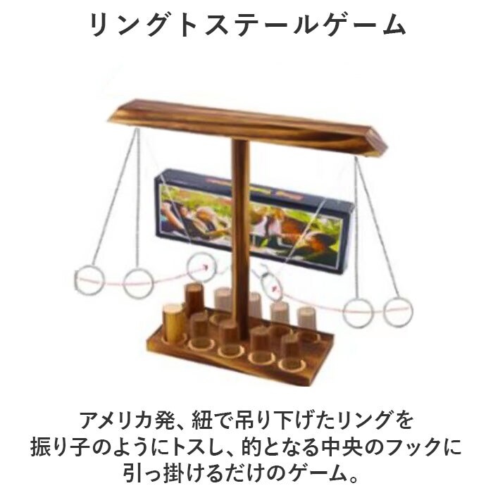 | 商品説明 | みんなで楽しめるパーティーゲーム「リングトステールゲーム」が新登場!【リングトステールゲーム】アメリカ発、紐で吊り下げたリングを振り子のようにトスし、的となる中央のフックに引っ掛けるだけのゲーム。【簡単ルールで家族みんなで遊べる】木製のコマをトレーの中央サークルに置き、フックを掛けるたびにカップの位置を相手側に移動。コマがトレーから出たらプレイヤーの勝ち◎シンプルなルールで年代幅広く遊べるのも嬉しいポイント。【室内外どこでも】卓上で遊べるアイテム。お家の中はもちろん、キャンプでのちょっとしたレクリエーションにもピッタリ。【持ち運び楽チン】パーツは分解できるので、持ち運びもラクチン。収納場所も困らない♪【セット内容】本体、リング×2、フック(的)×2、紐を吊るすフック×2、紐×2、トレー、コマ |